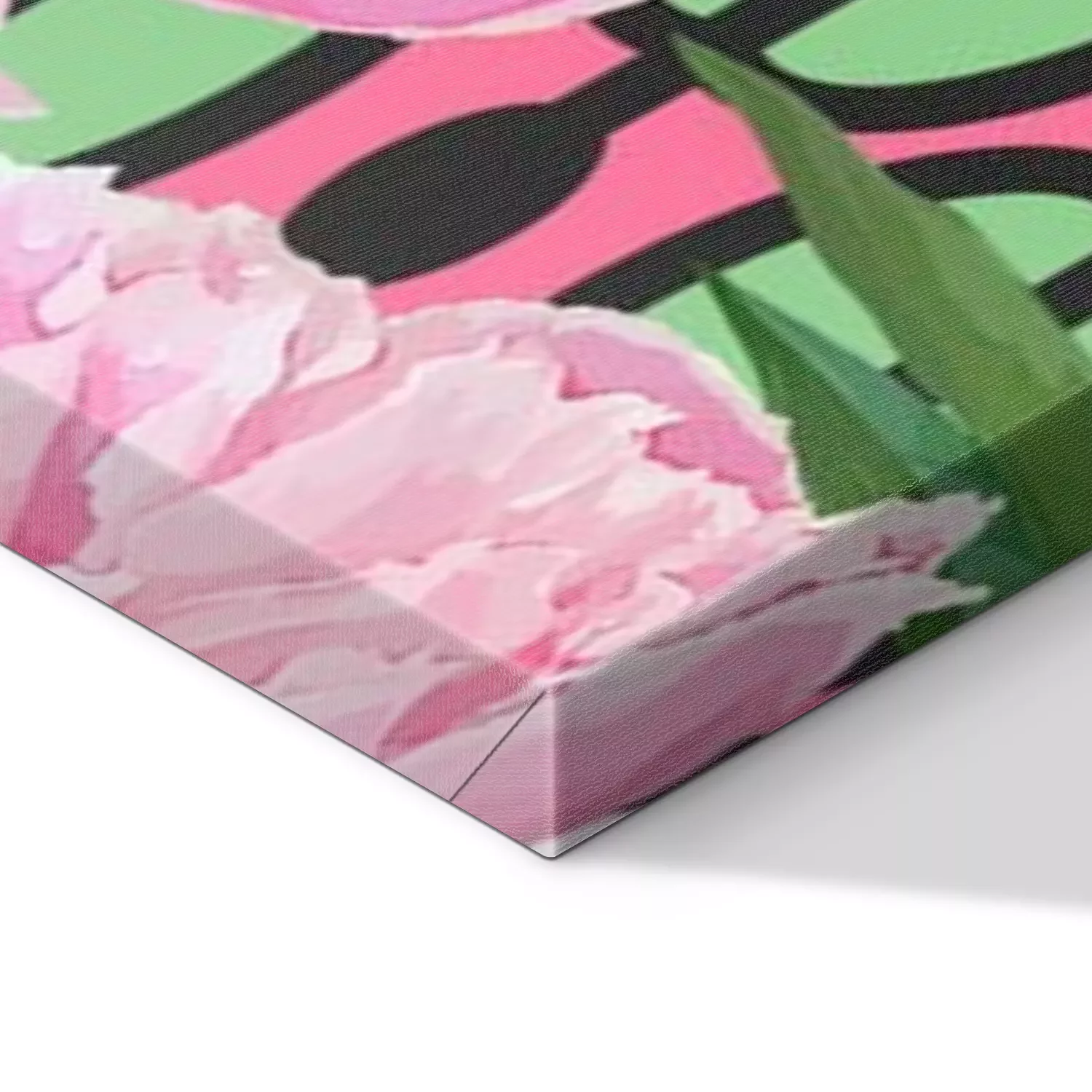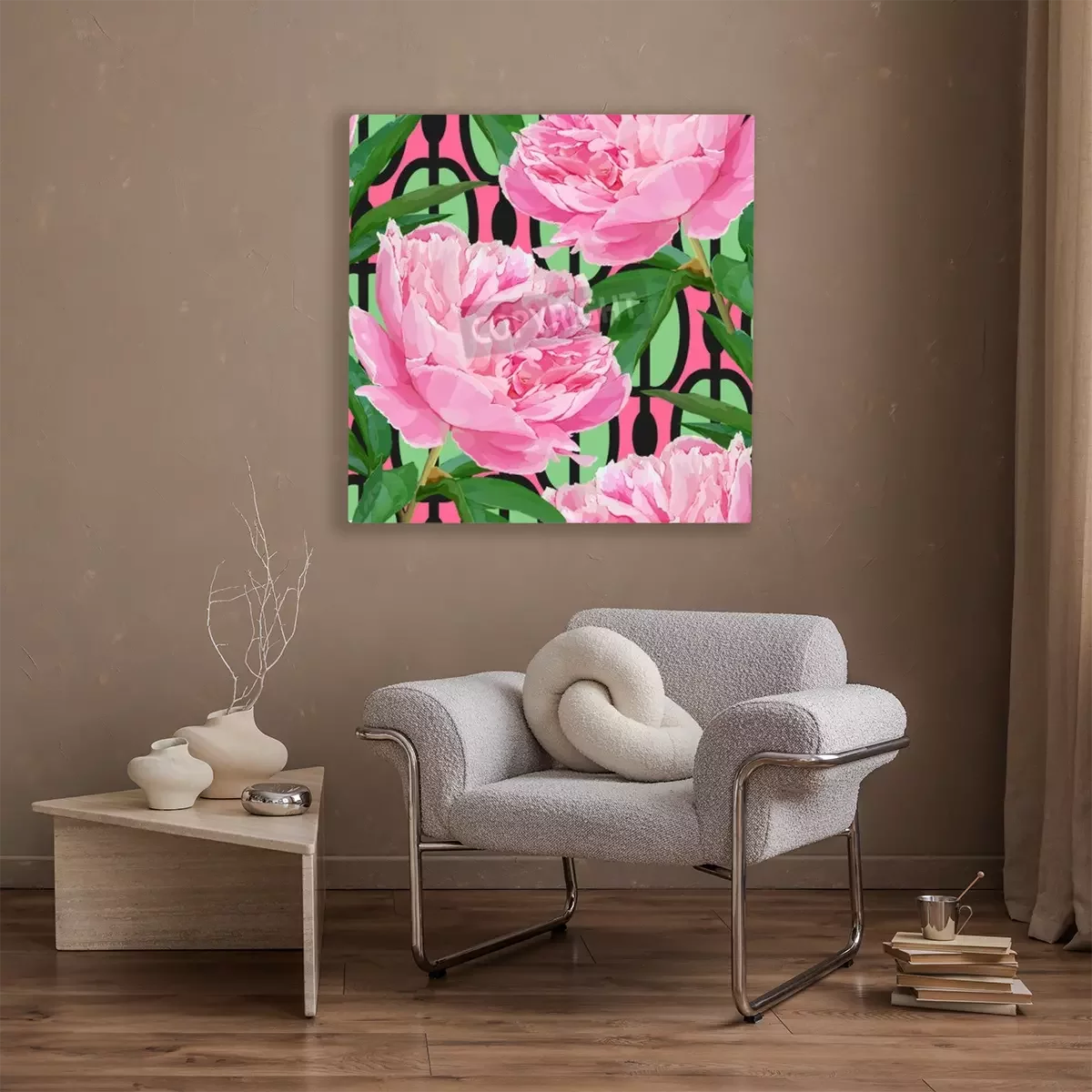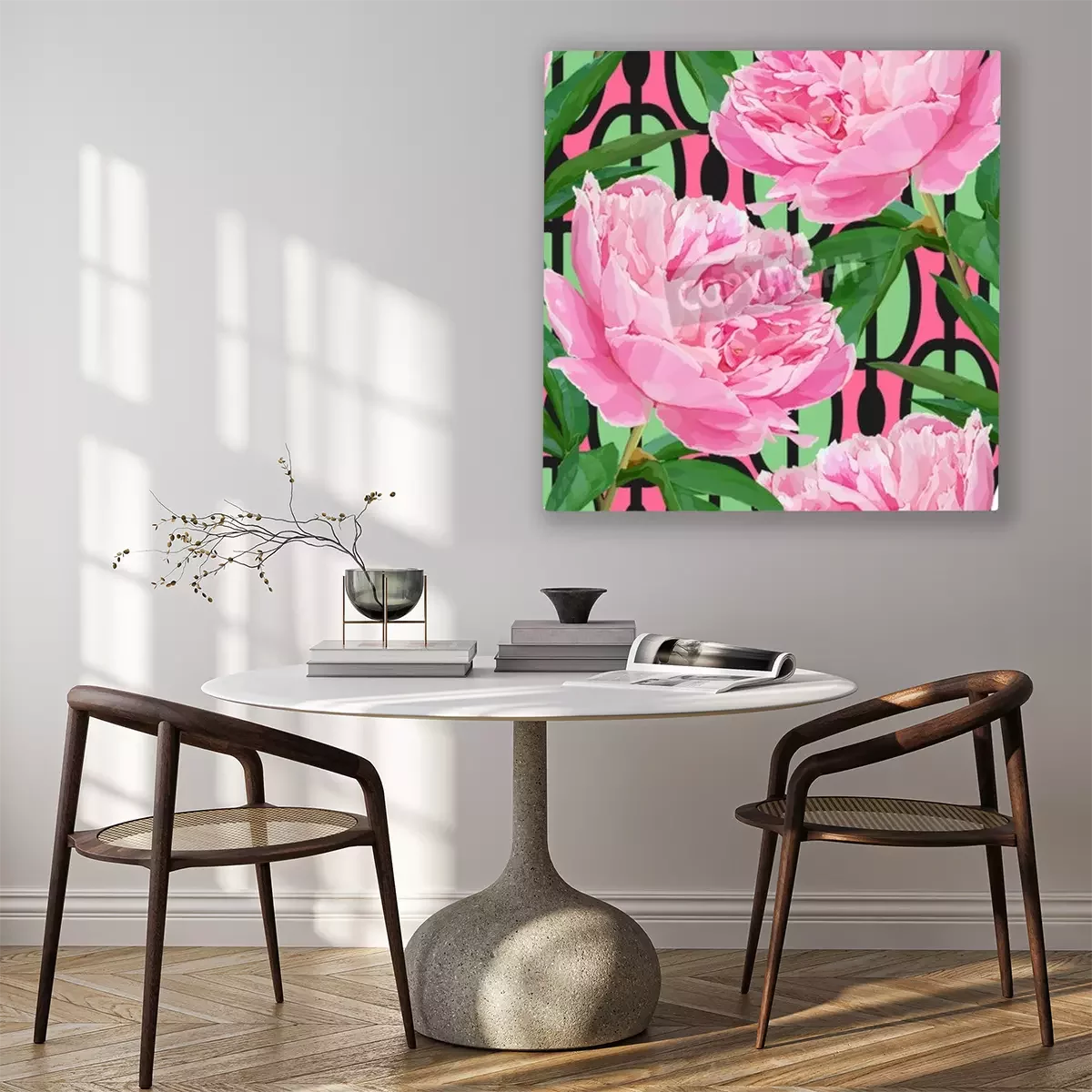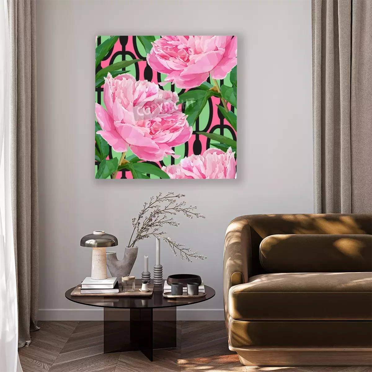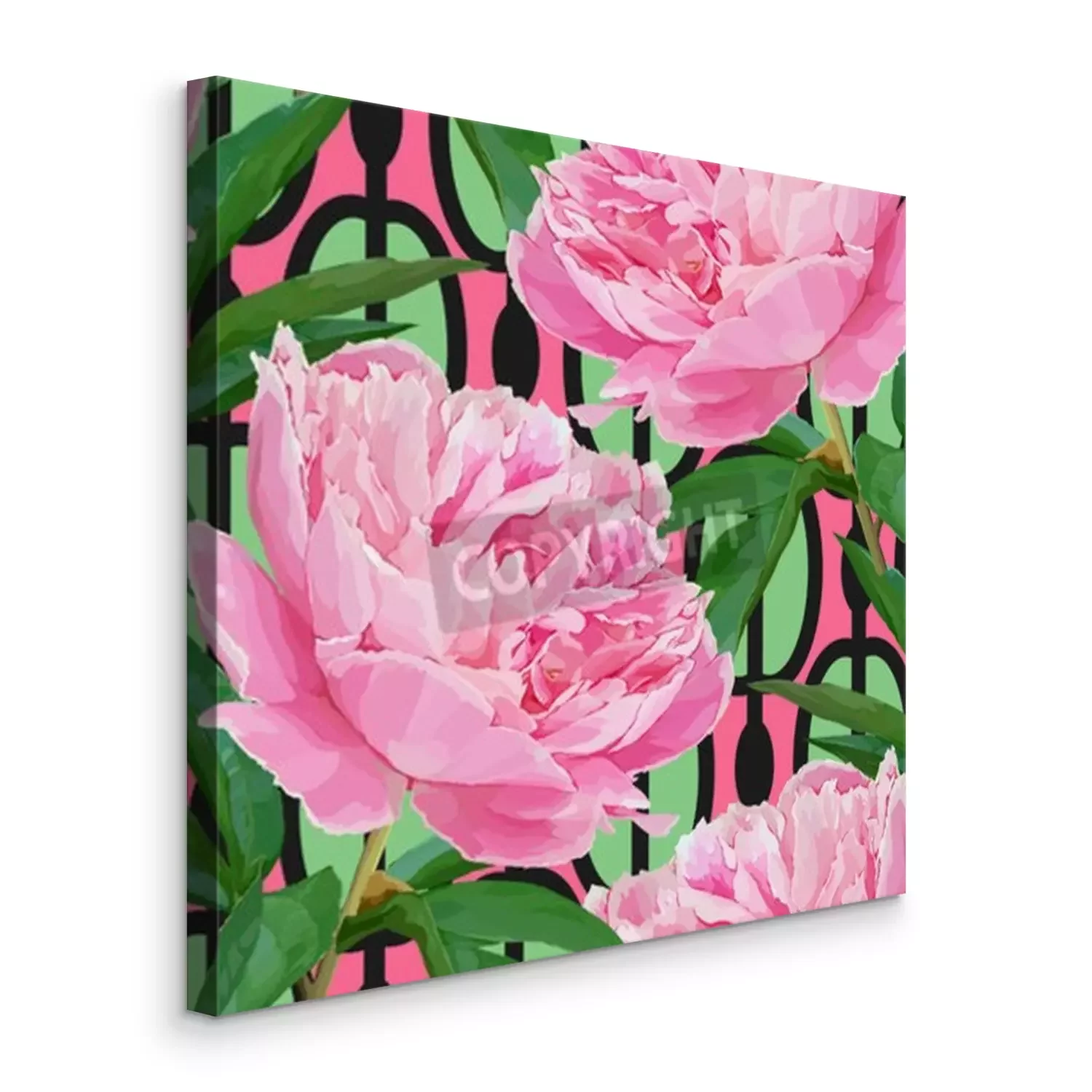 Canvas: Pioenen en bladeren op gekleurde achtergrond