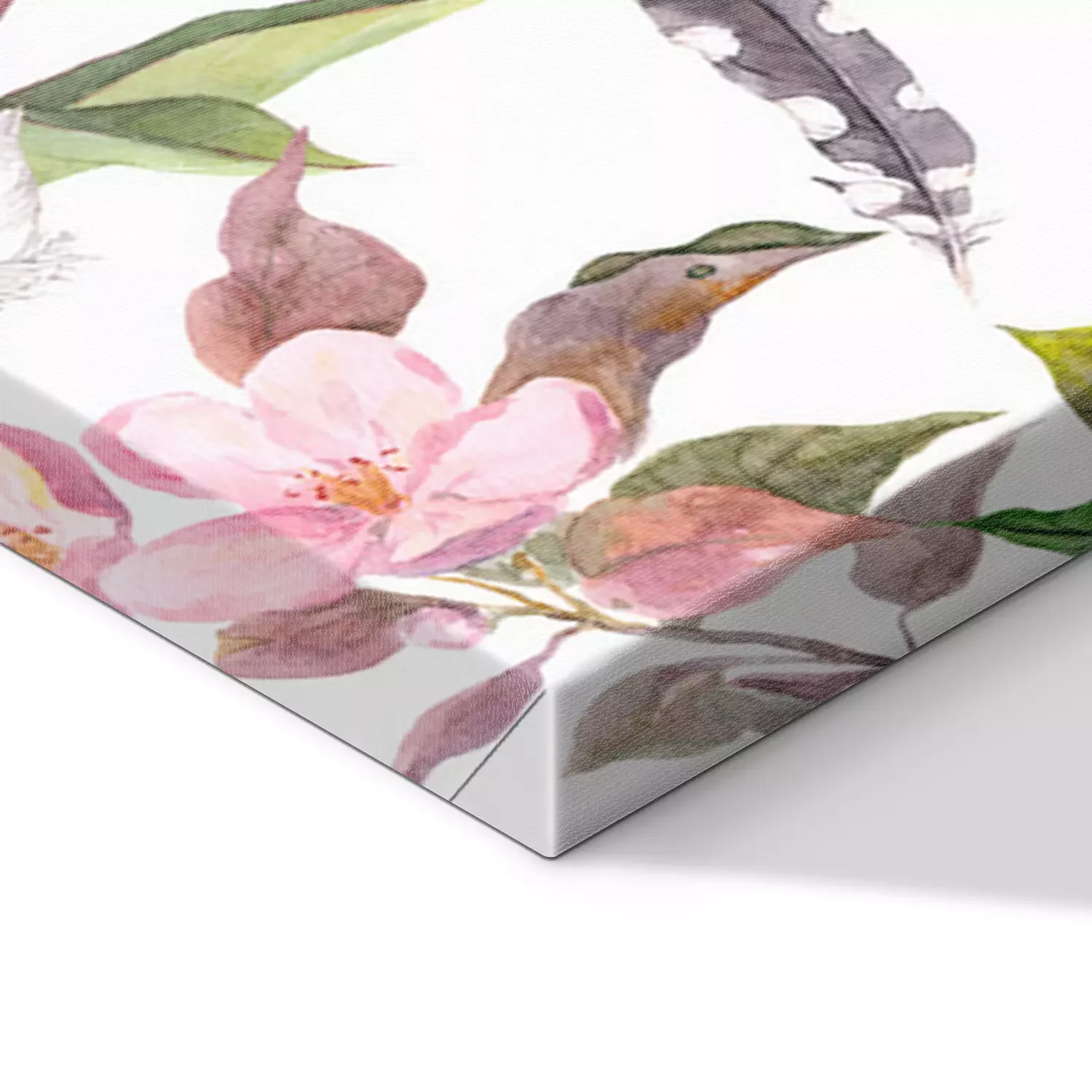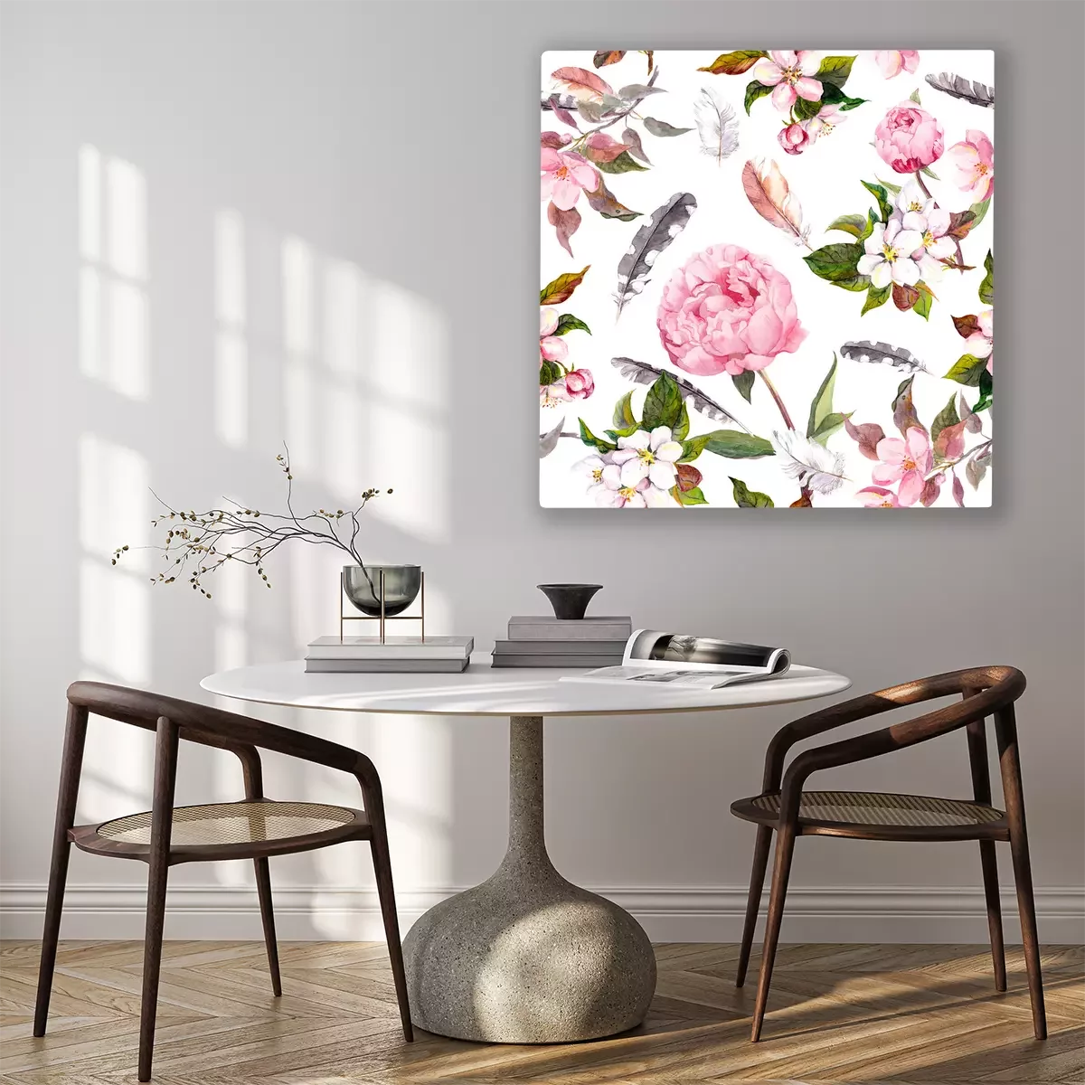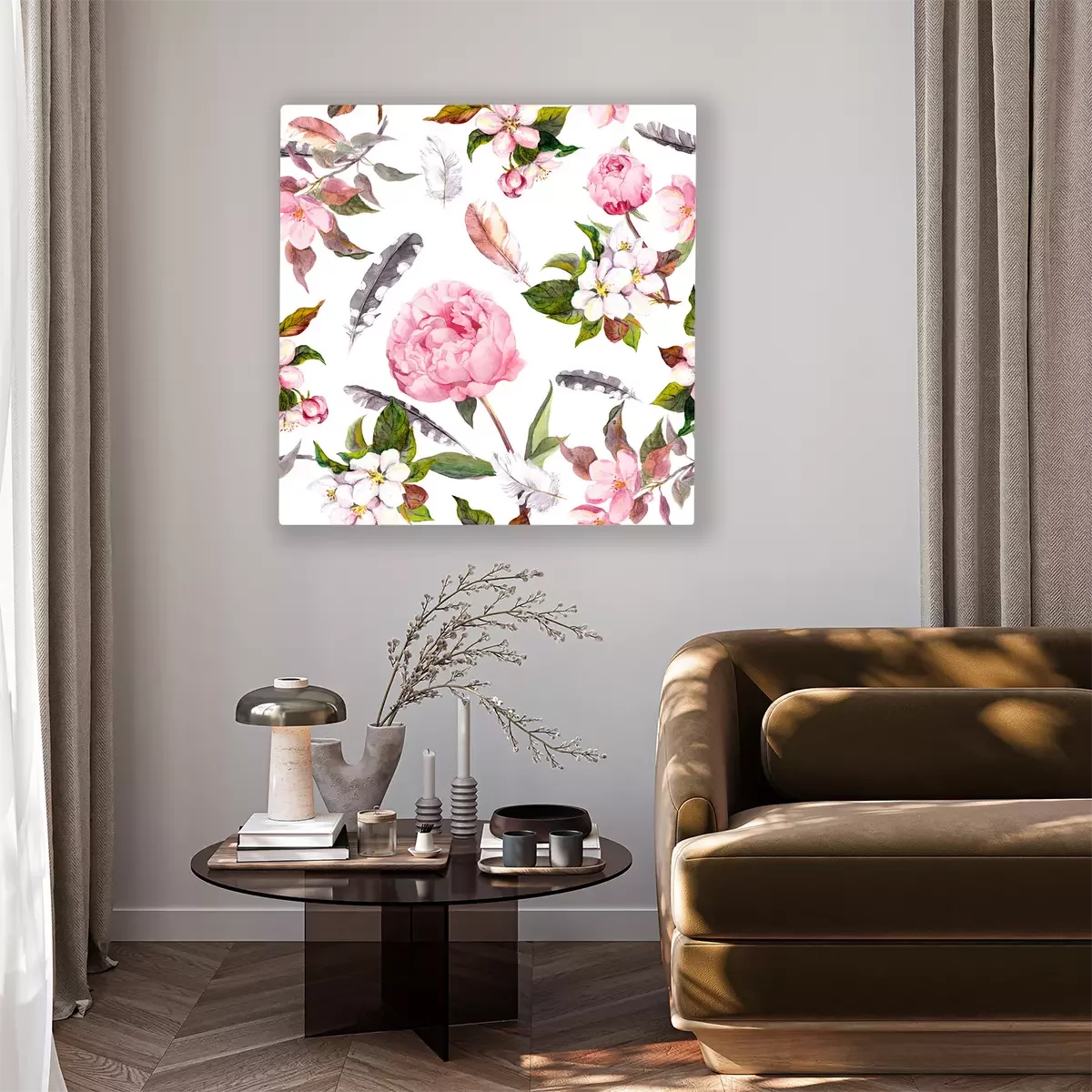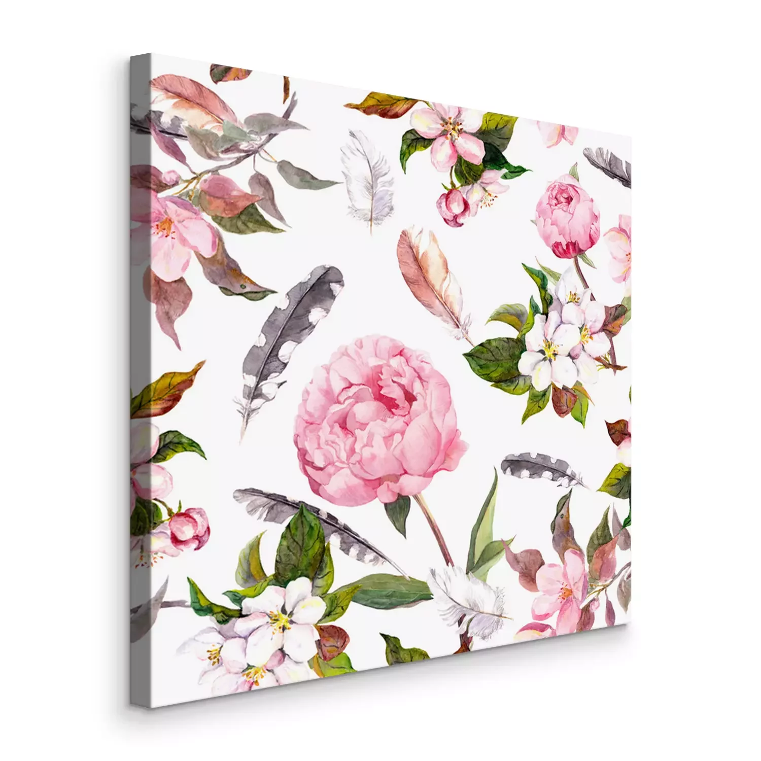 Canvas: Pioenrozen vintage en vogelveren graphics