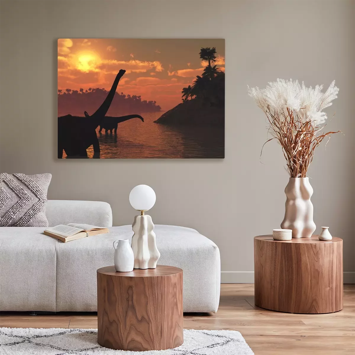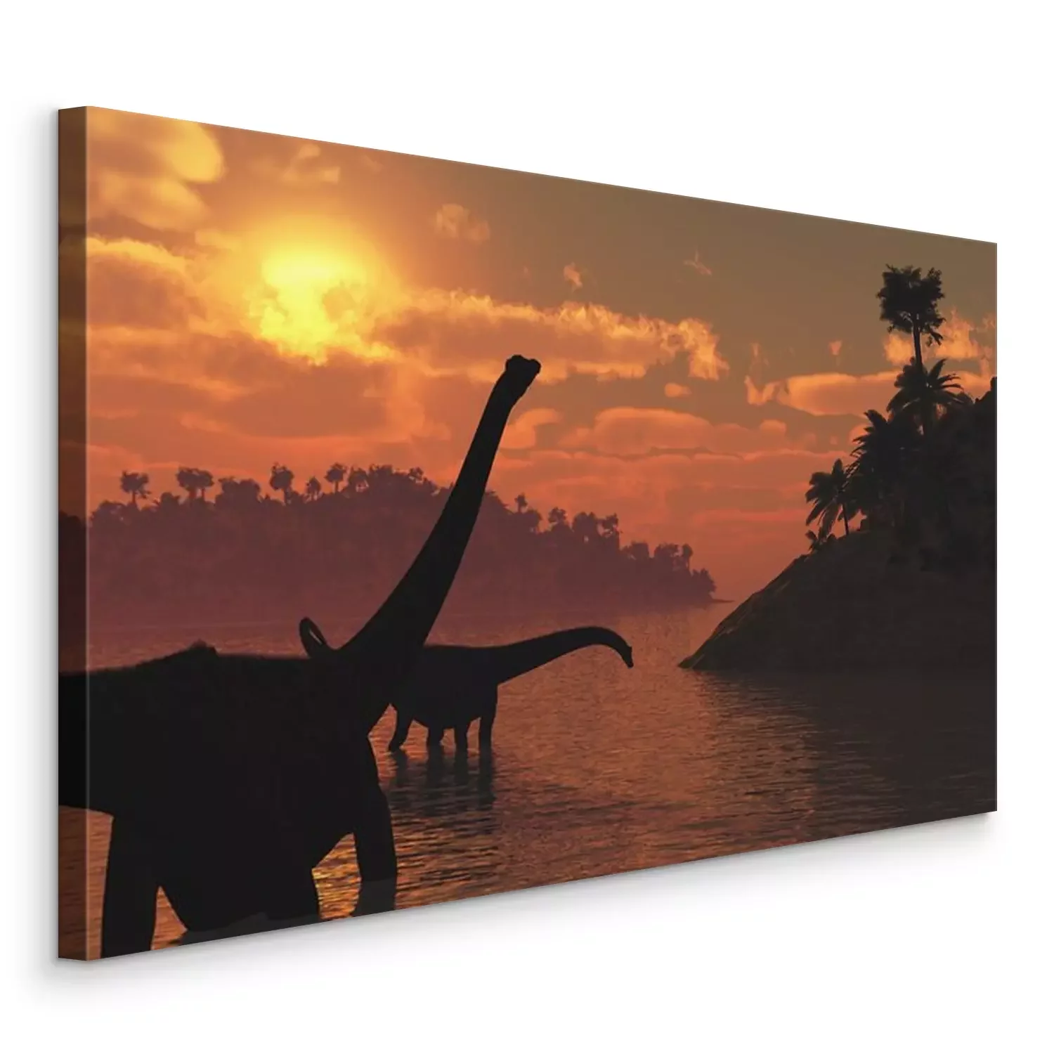 Canvas: Plantenetende dinosaurussen in de rivier tijdens zonsondergang