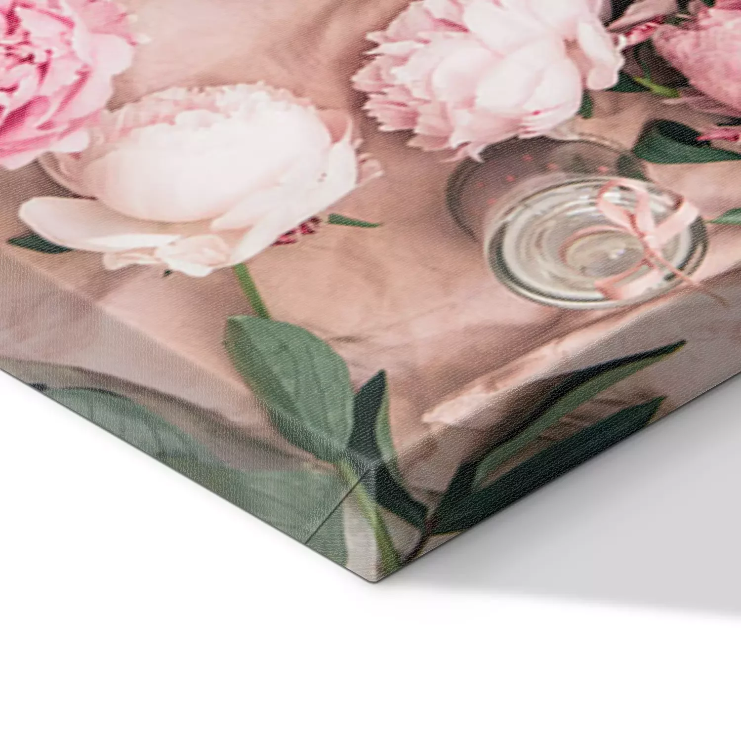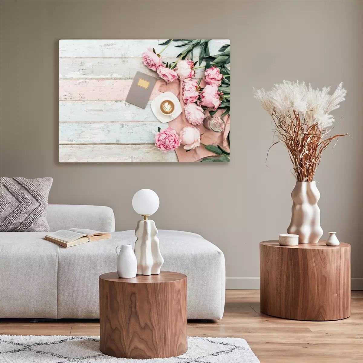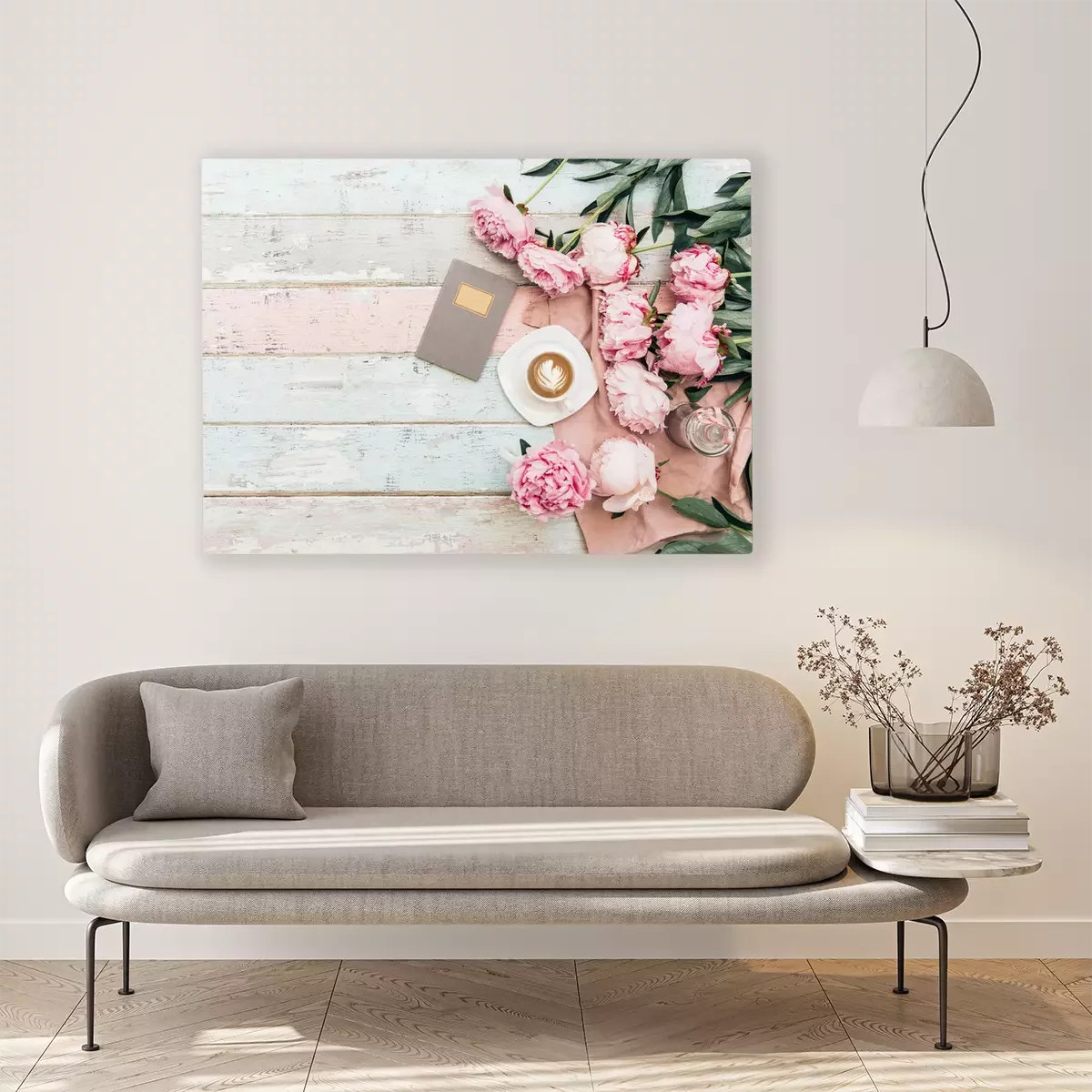 Canvas: Plat leggen kopje koffie en pioenrozen op shabby chic achtergrond.