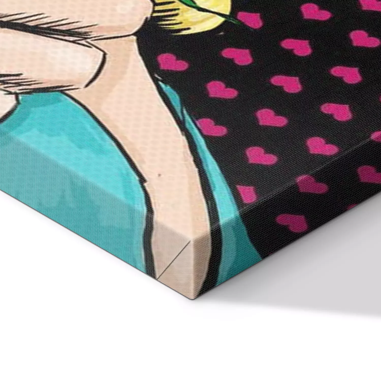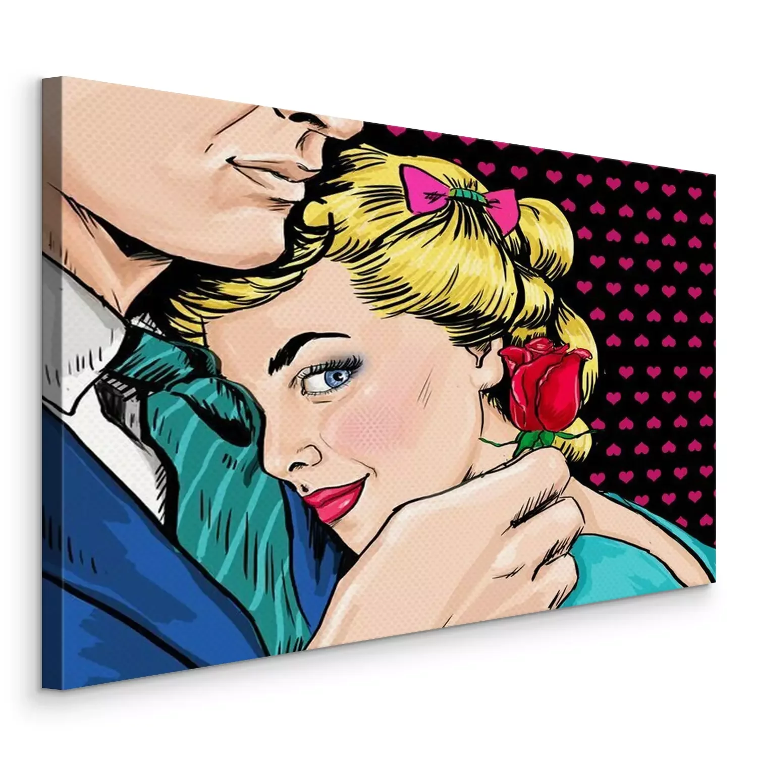 Canvas Pop Art paar. Love paar. Pop-art van de liefde. Valentijnsdag briefkaart. Hollywood-film scene. Echte liefde. Eerste kus. Filmposter. Comic book liefde. Roos. Vrouw en man. Ik hou van je. Ik mis je. M