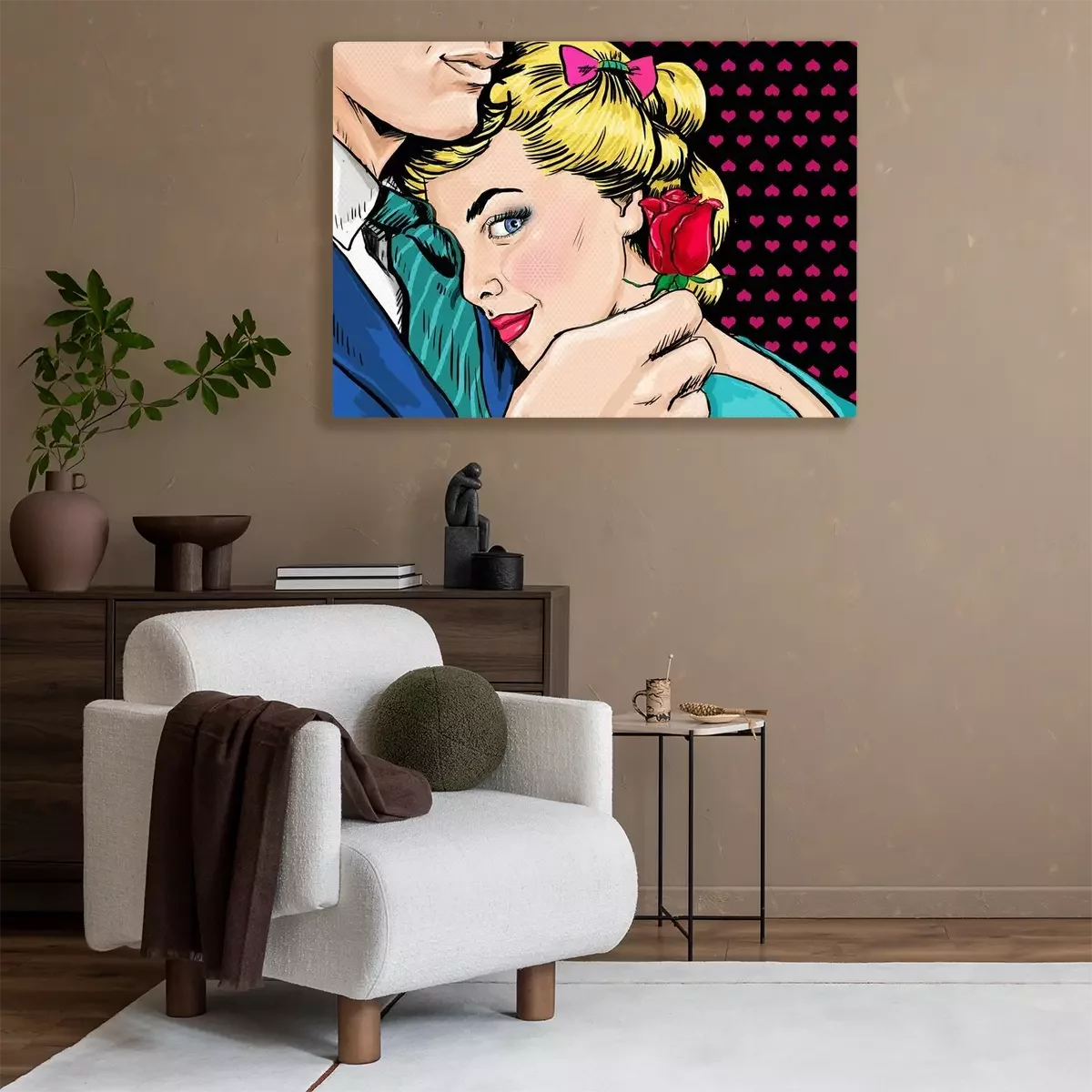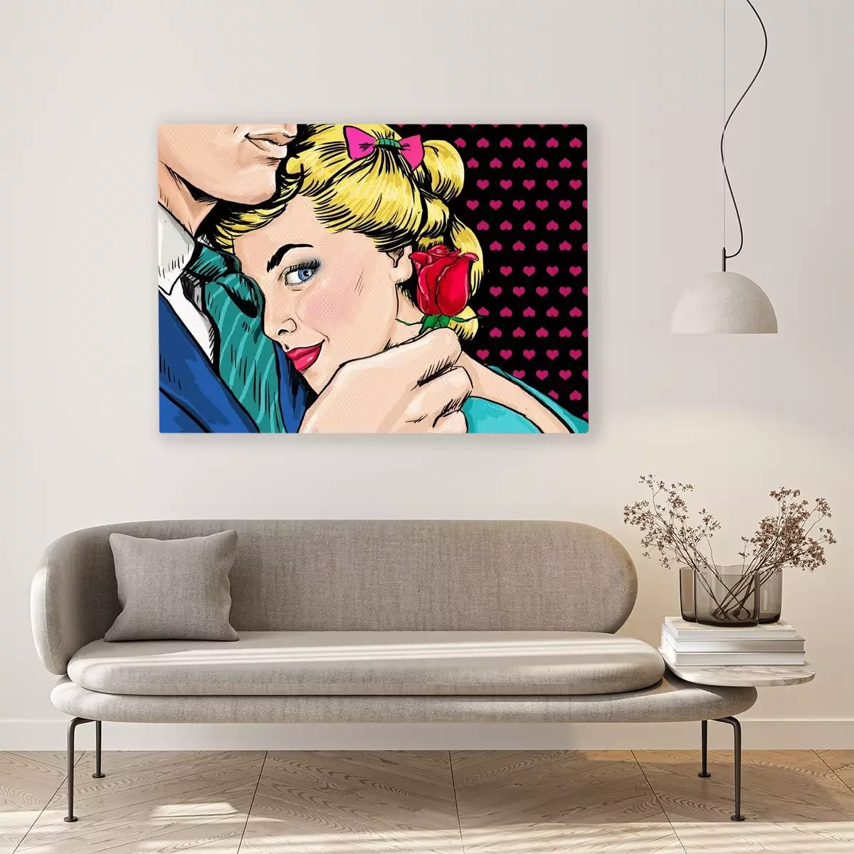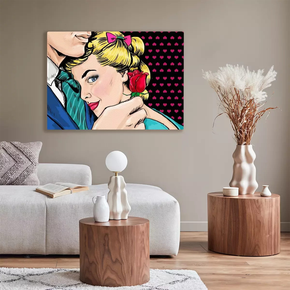 Canvas: Pop Art paar. Love paar. Pop-art van de liefde. Valentijnsdag briefkaart. Hollywood-film scene. Echte liefde. Eerste kus. Filmposter. Comic book liefde. Roos. Vrouw en man. Ik hou van je. Ik mis je. M