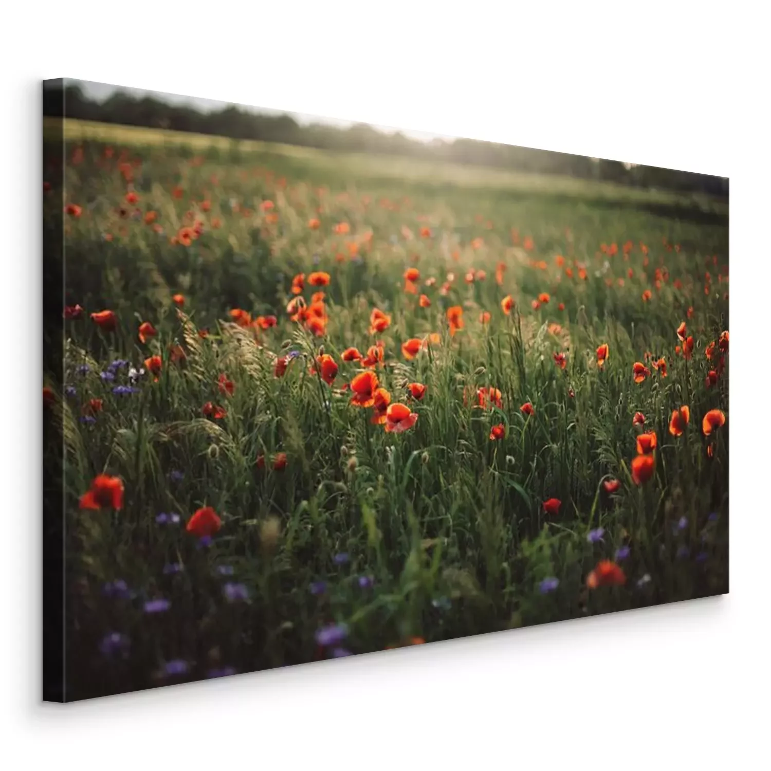 Canvas Poppy and cornflowers in sunset light in summer meadow. Atmospheric beautiful moment. Copy space. Wildflowers in warm light, flowers in countryside. Rural simple life