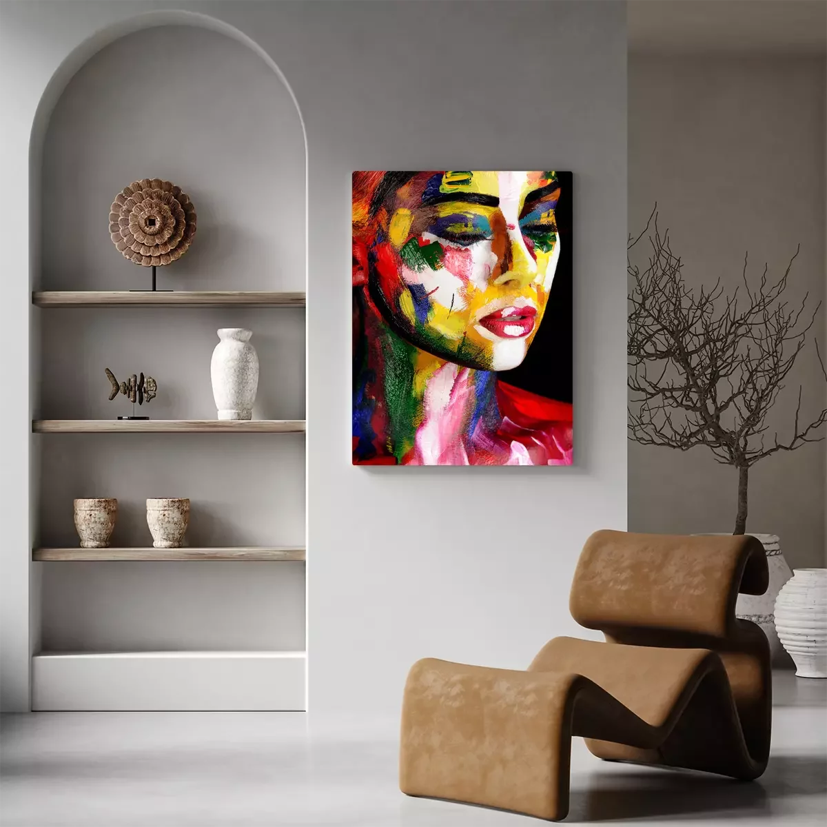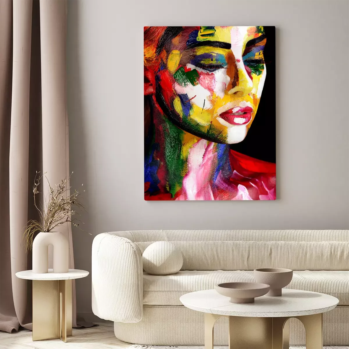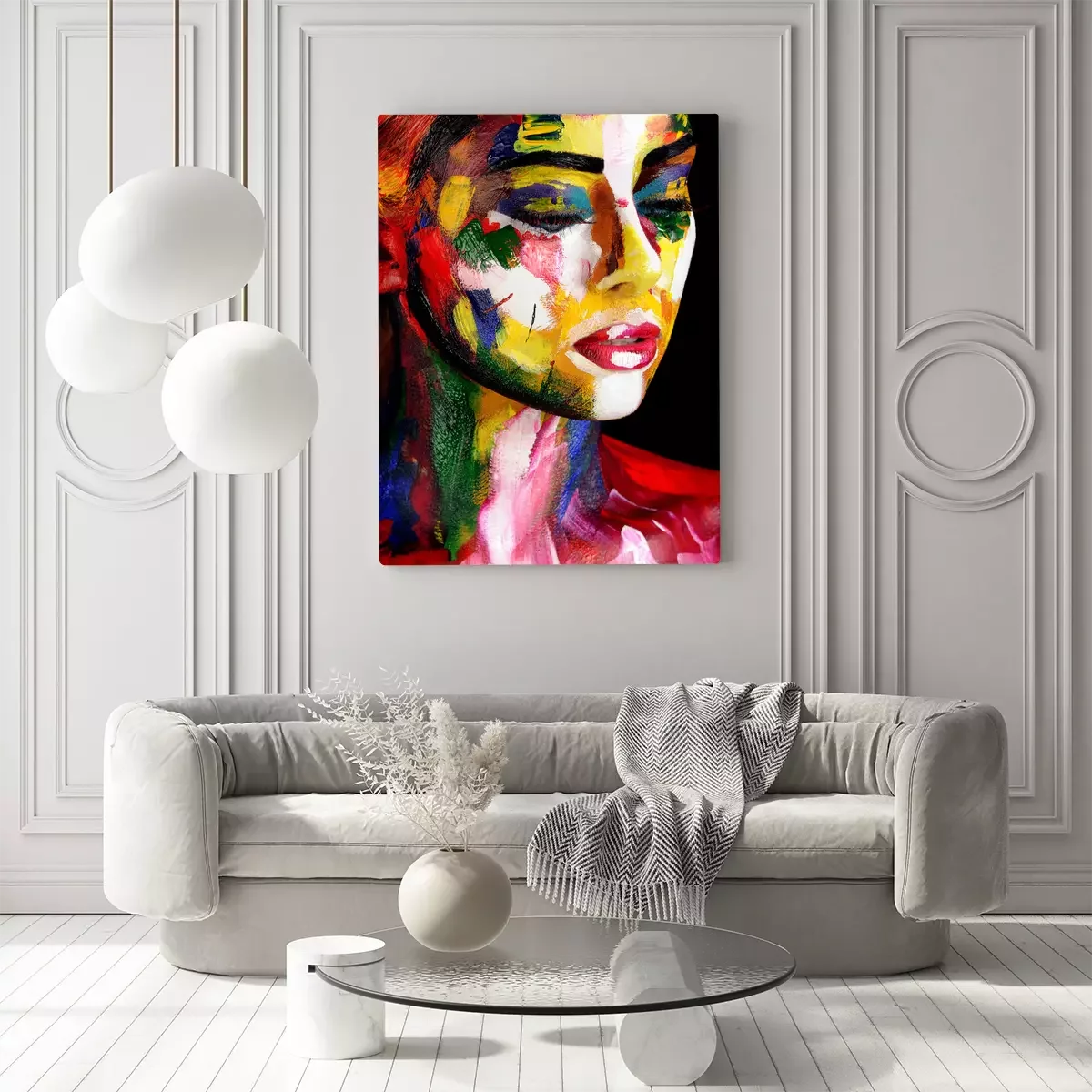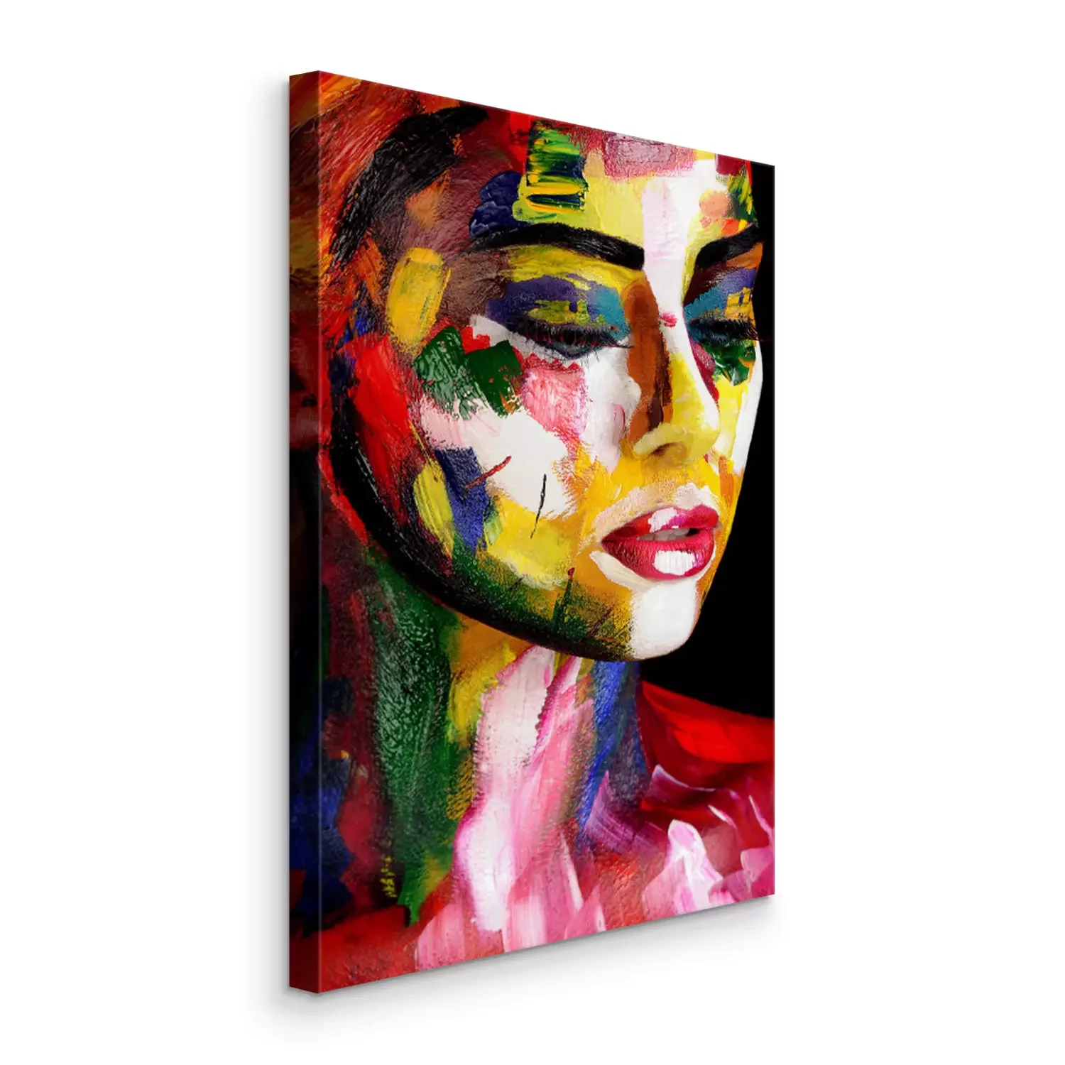Canvas: Portret van een jonge vrouw in kleurrijke verf