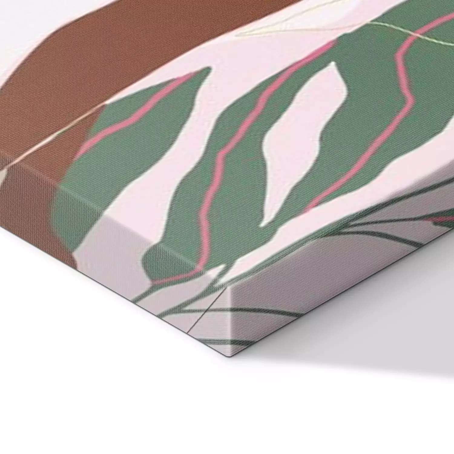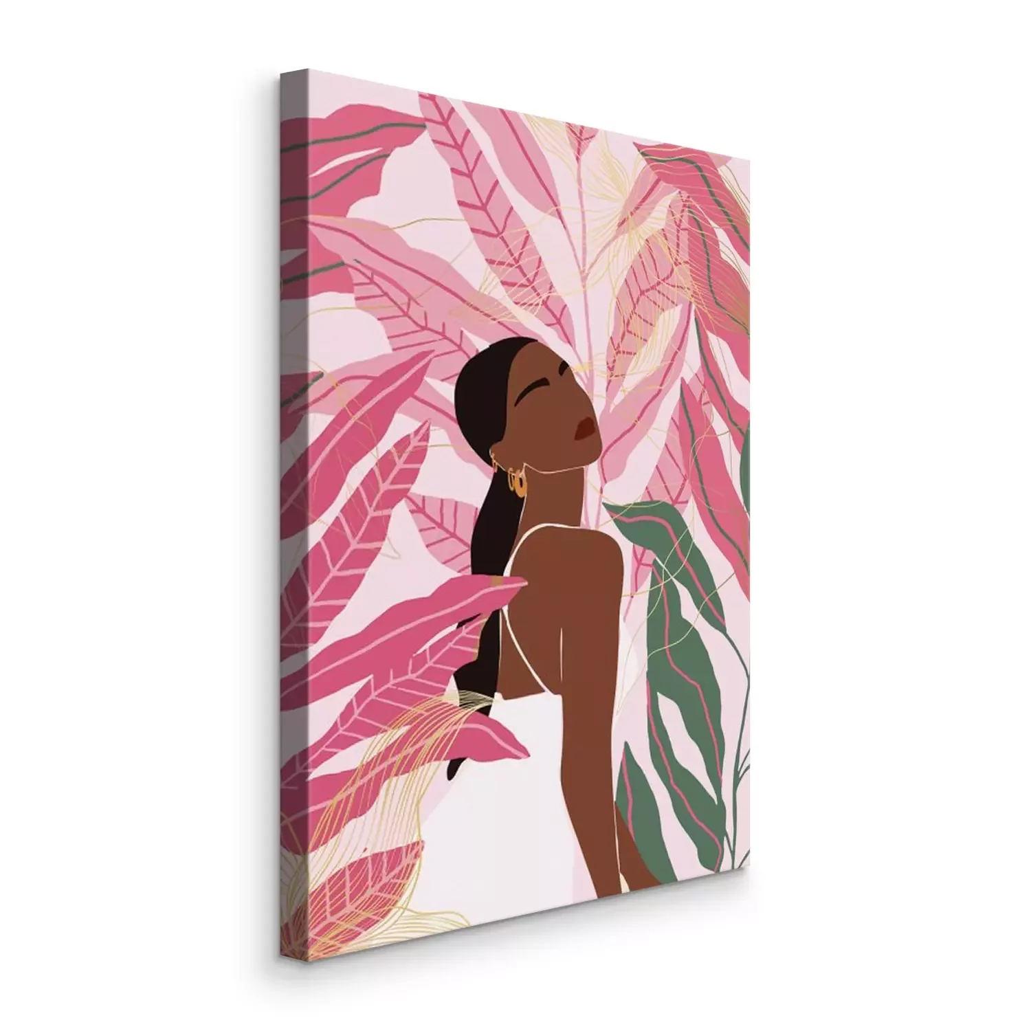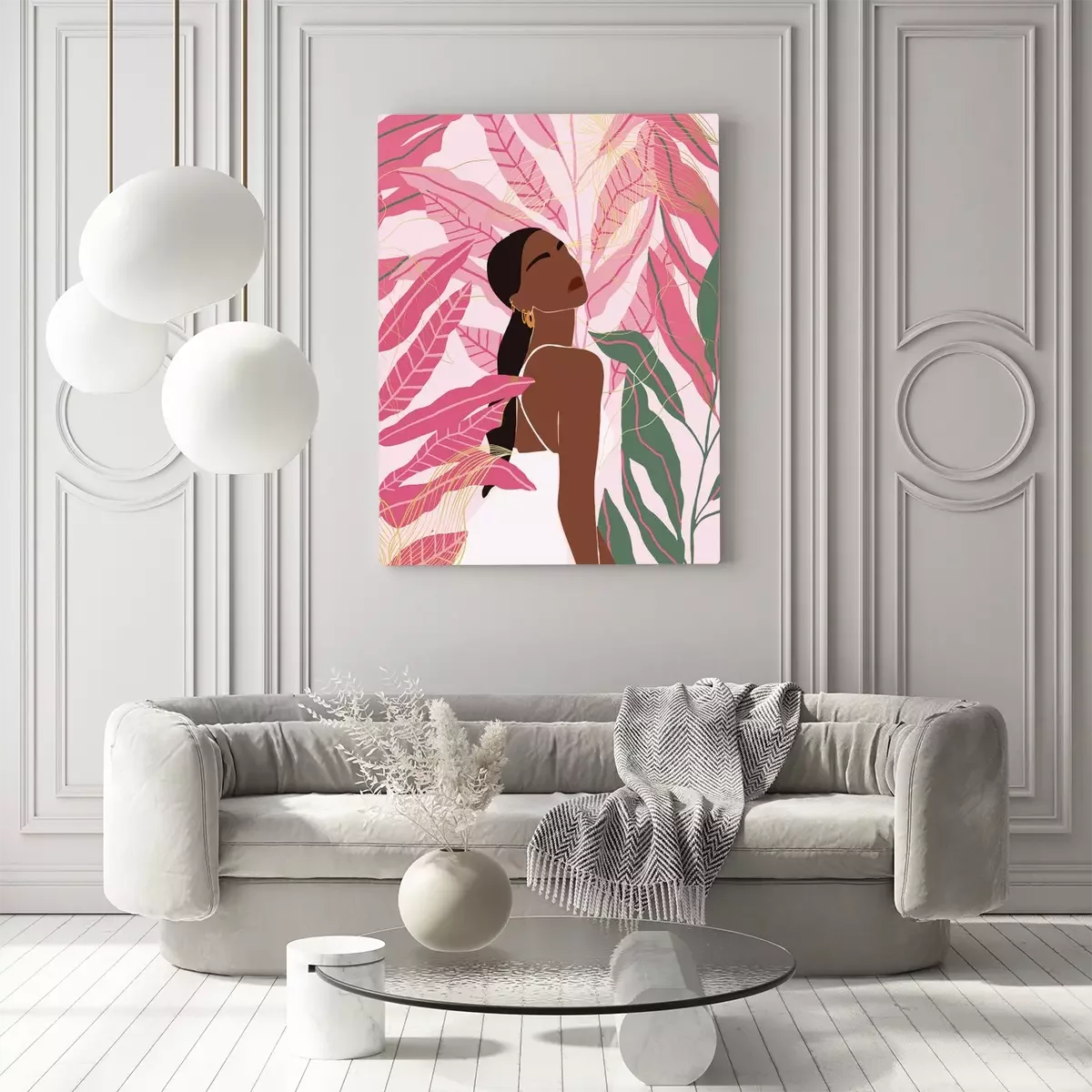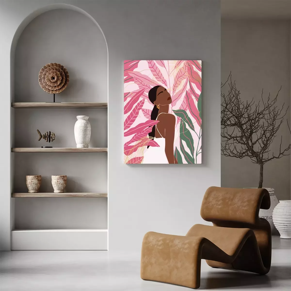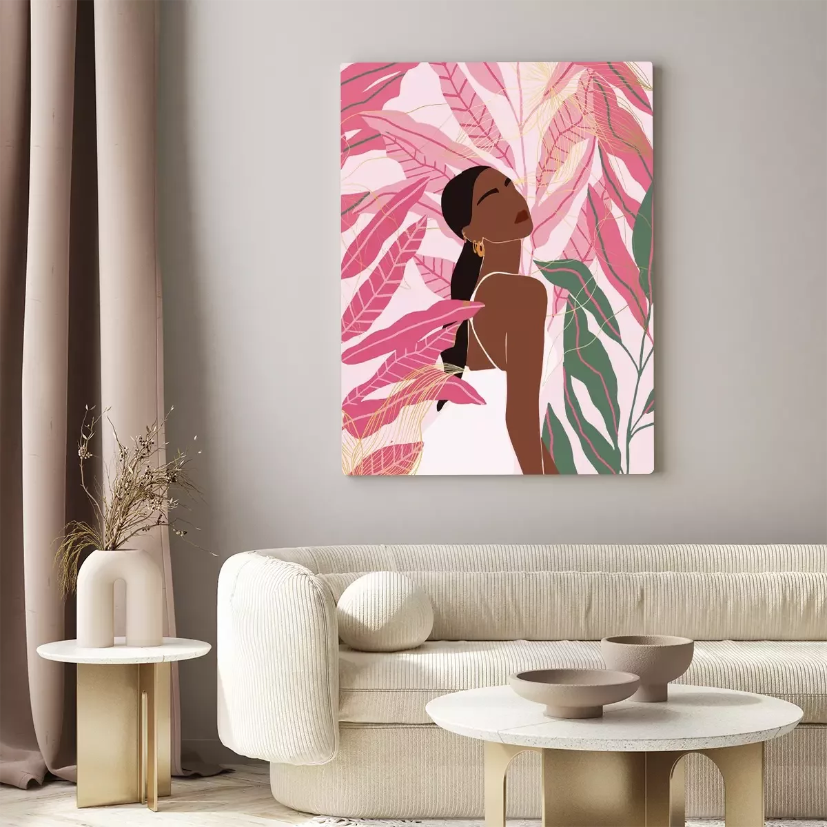 Portret van een vrouw in een witte jurk met roze bladeren op de achtergrond