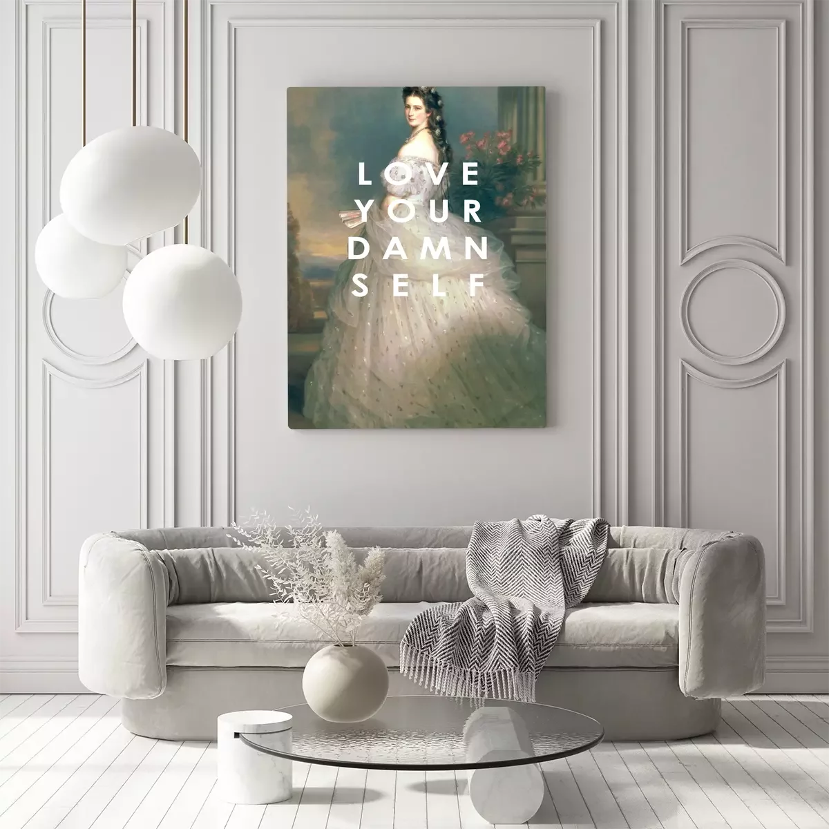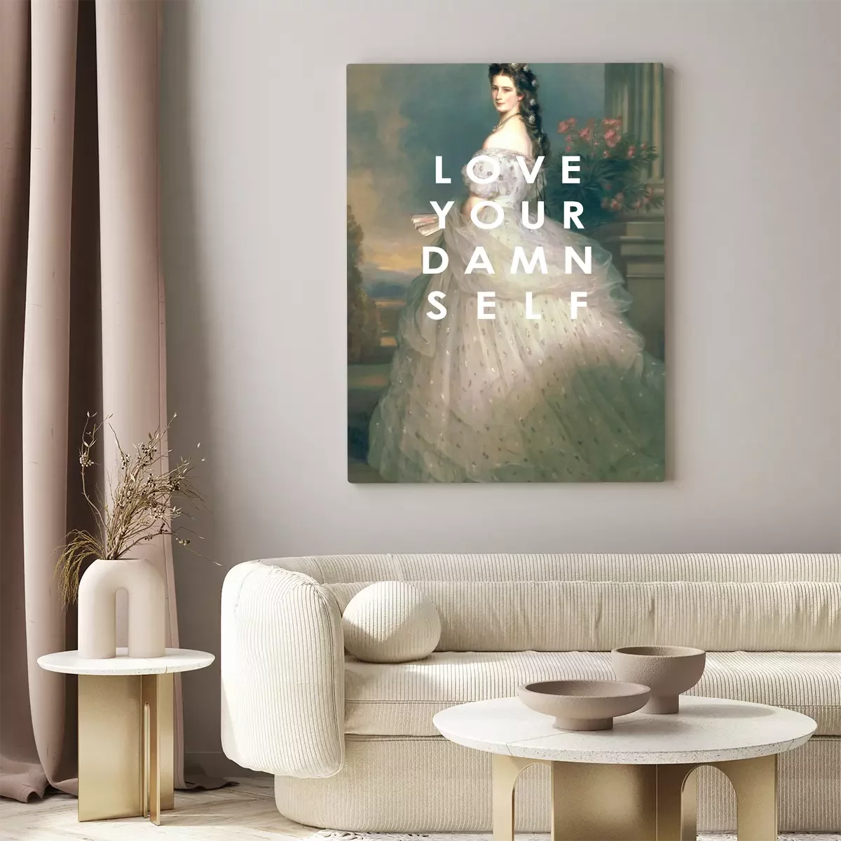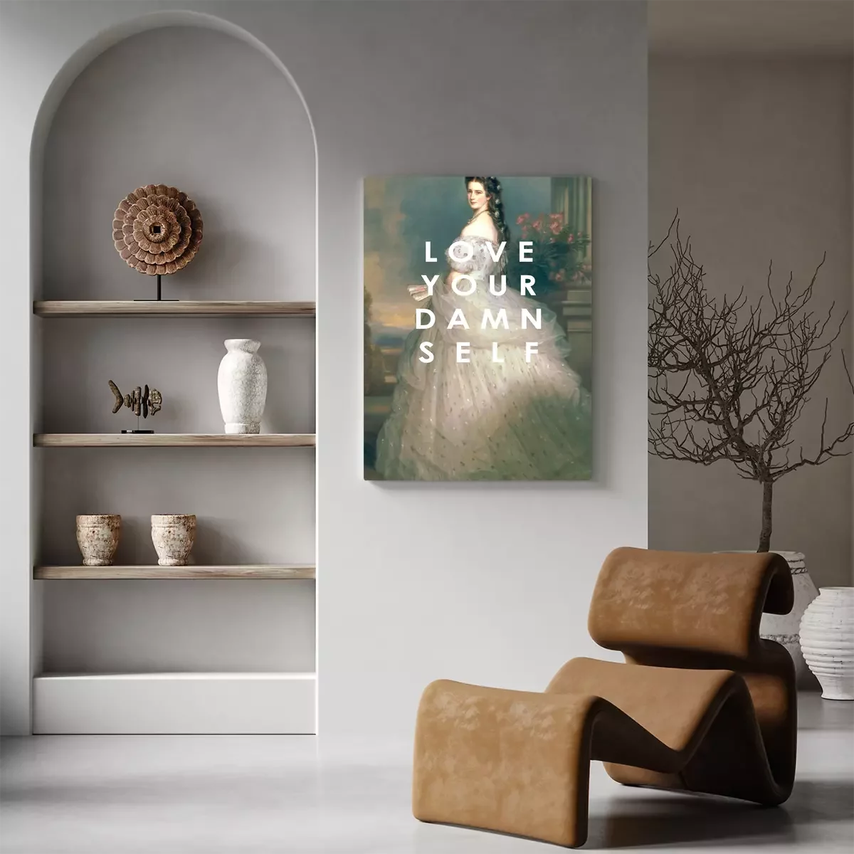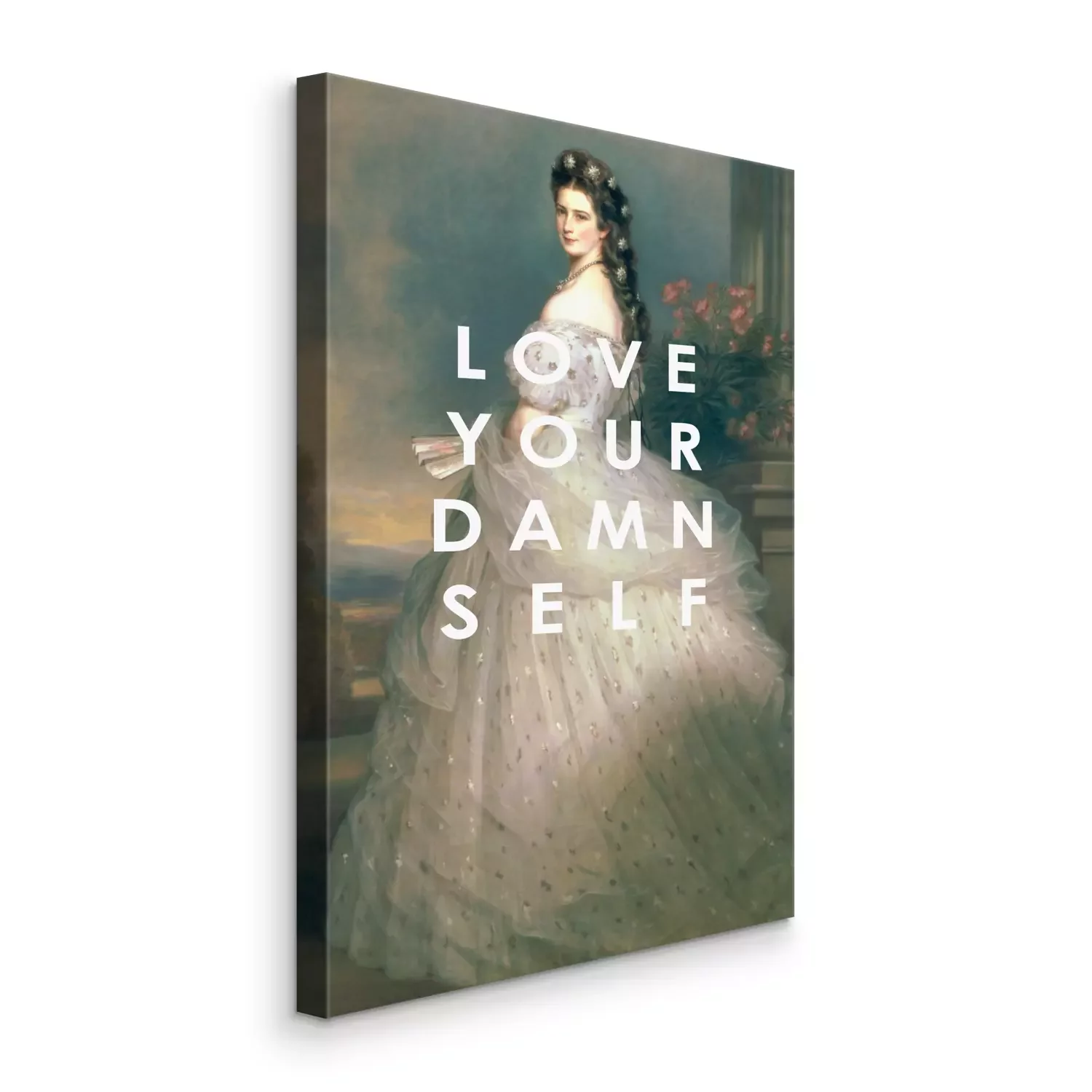 Portret van een vrouw in klassiek-moderne stijl met inscriptie