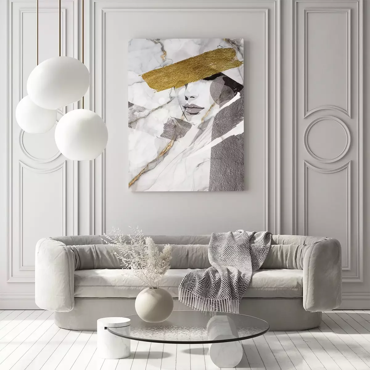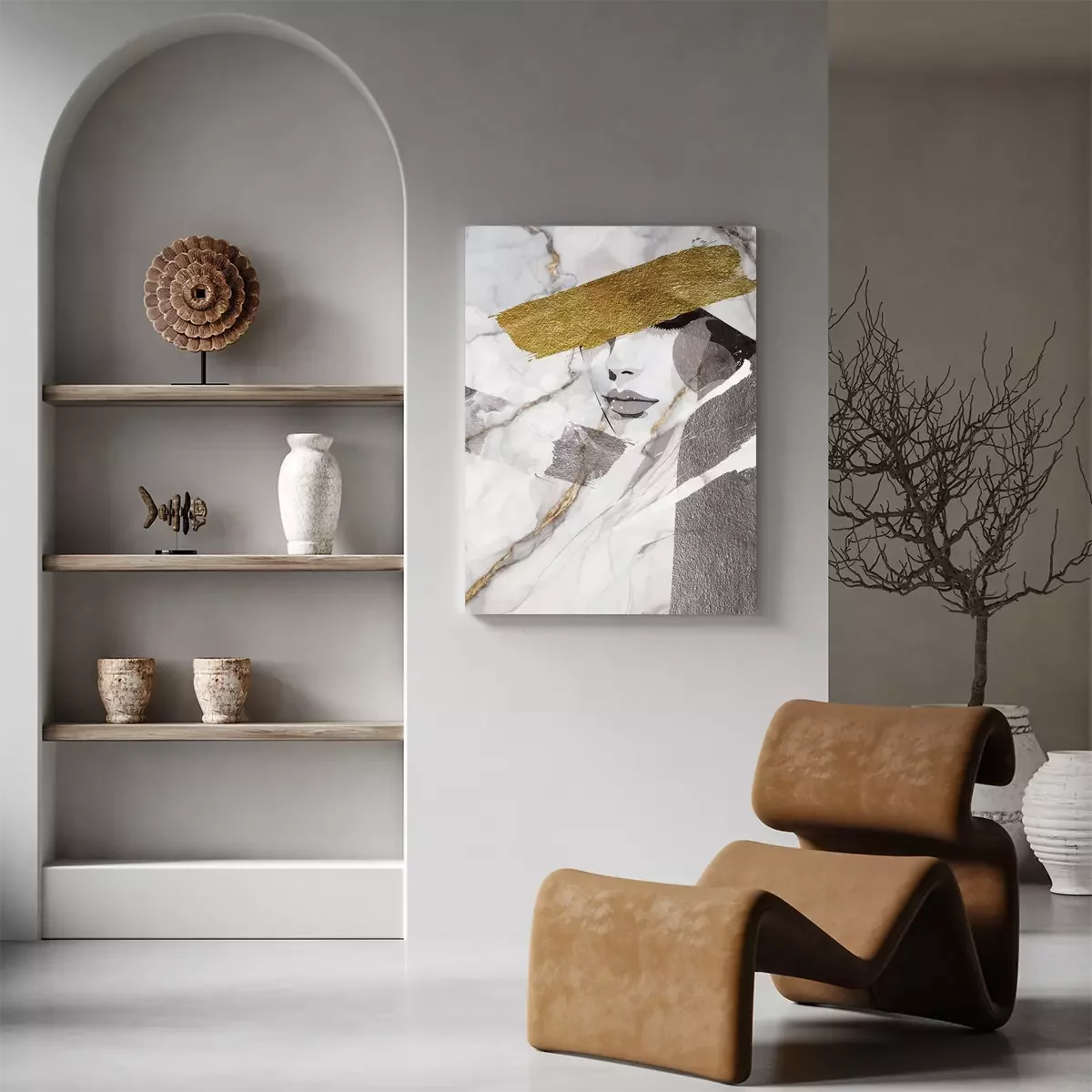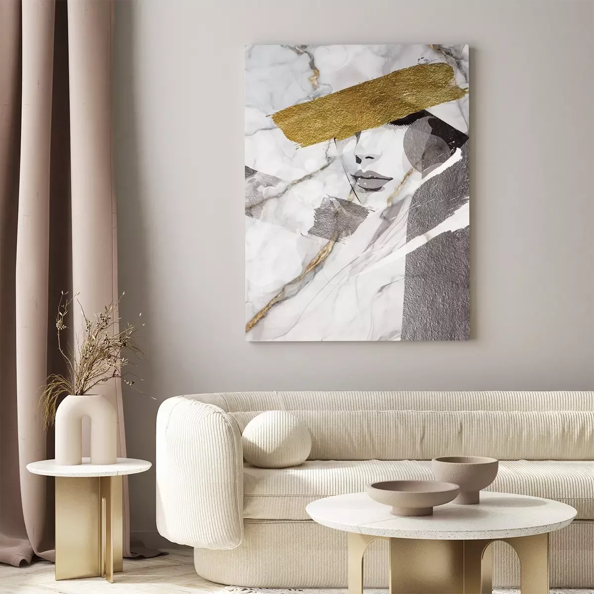 Portret van een vrouw tegen een marmeren achtergrond met gouden accenten