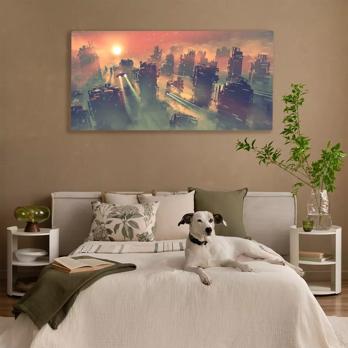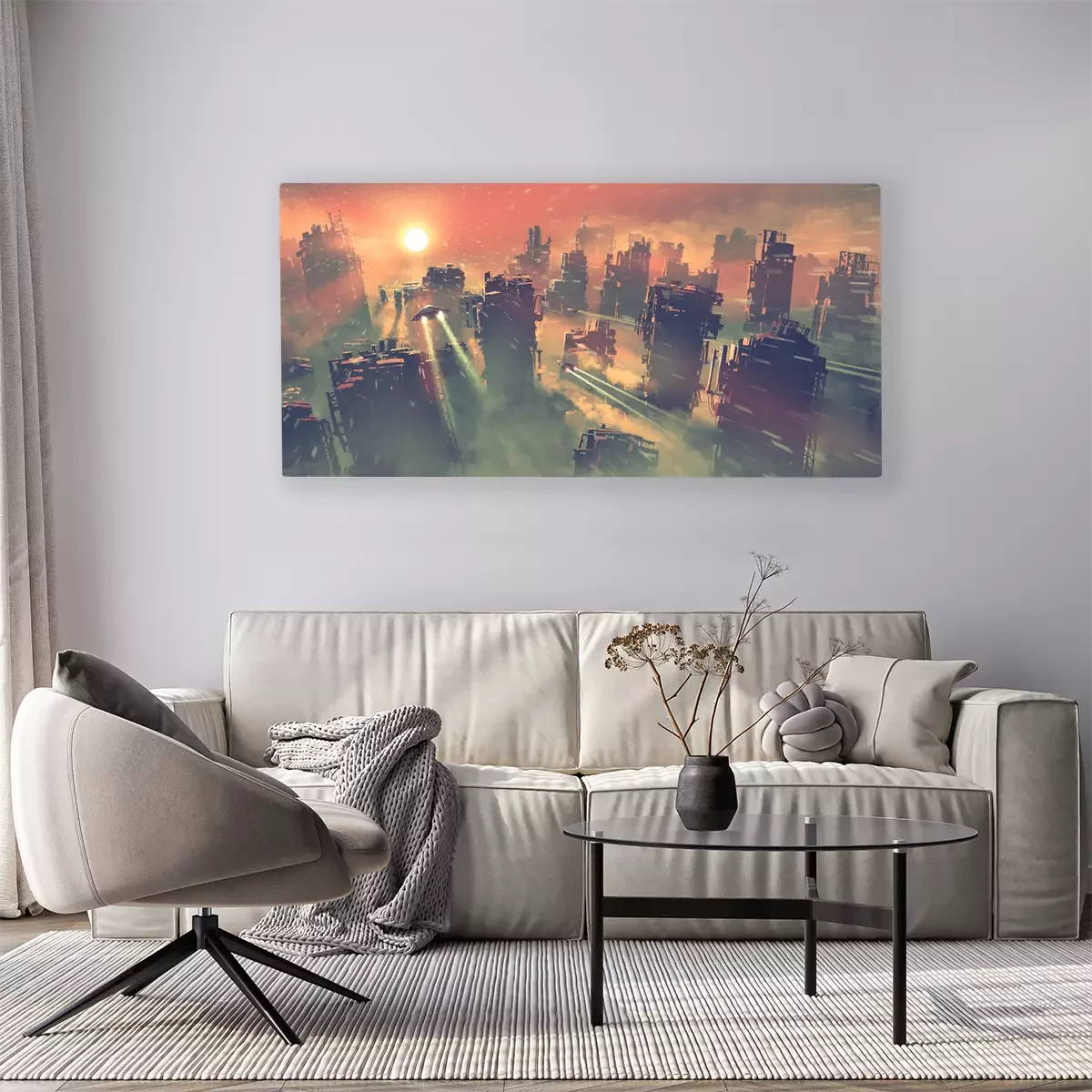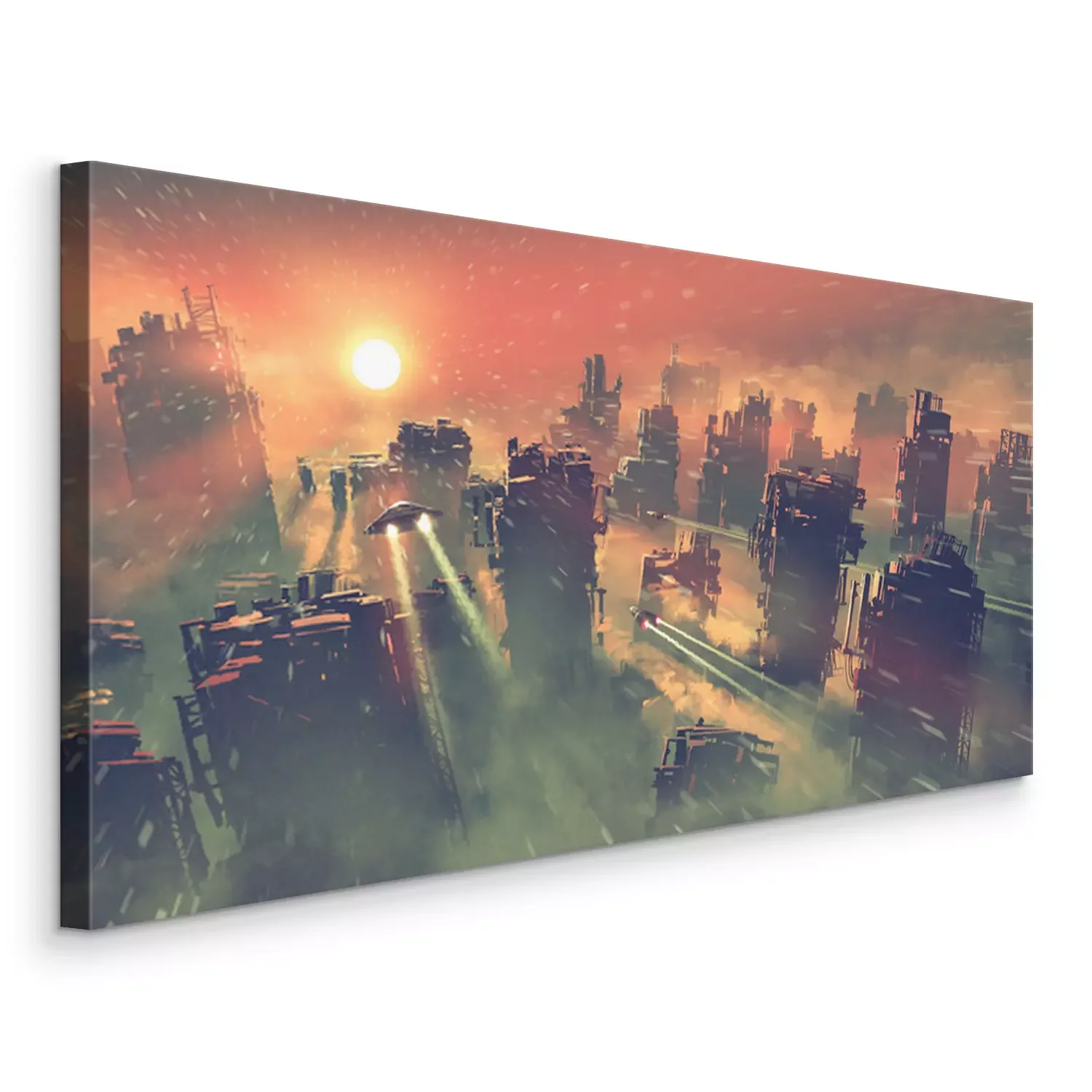 Canvas post apocalypse scenery showing of spaceships flying above abandoned skyscrapers, digital art style, illustration painting