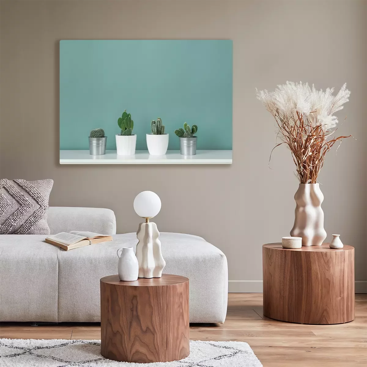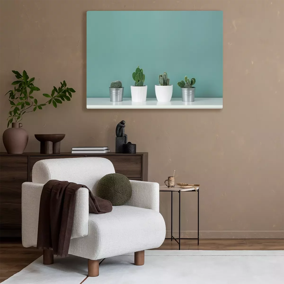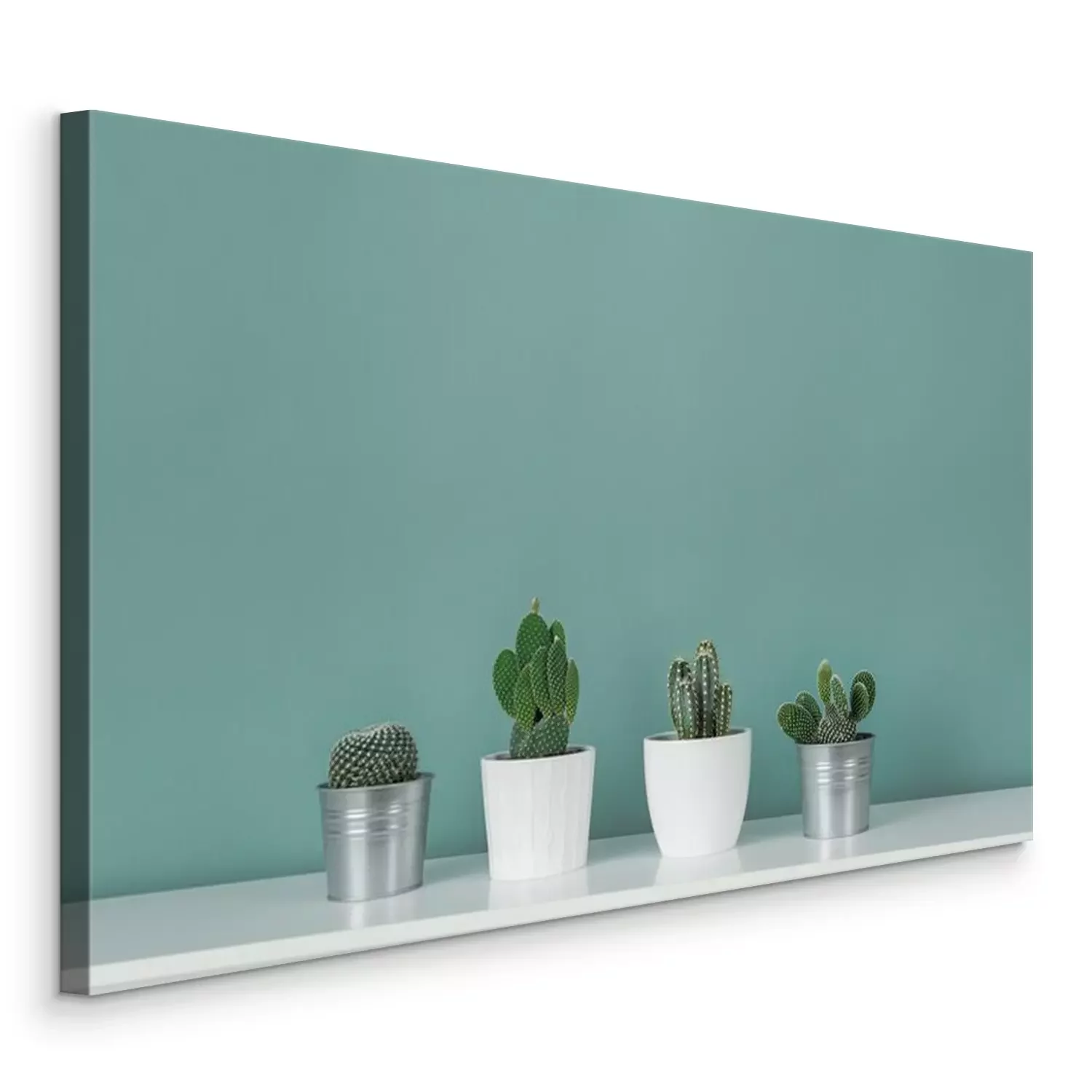 Moderne kamerinrichting. De inzameling van diverse ingemaakte installaties van het cactushuis op witte plank tegen pastelkleur turkoois kleurde muur. Cactus planten banner.