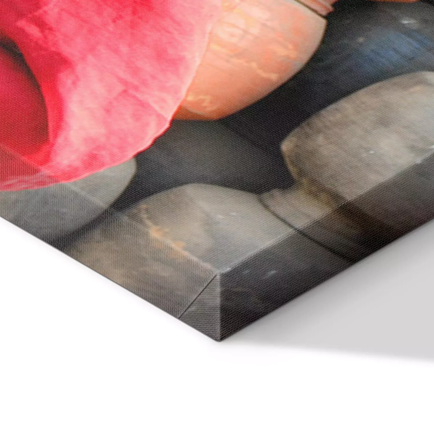 De print wordt aangebracht op hoogwaardig canvas dat op een schildersweefgetouw (spieraam) wordt gespannen. Omdat de print de zijranden bedekt, hoeft het ontwerp niet met een extra kader te worden omlijst. Wij raden ook composities aan die uit meerdere foto's bestaan en zo een coherente compositie vormen.
