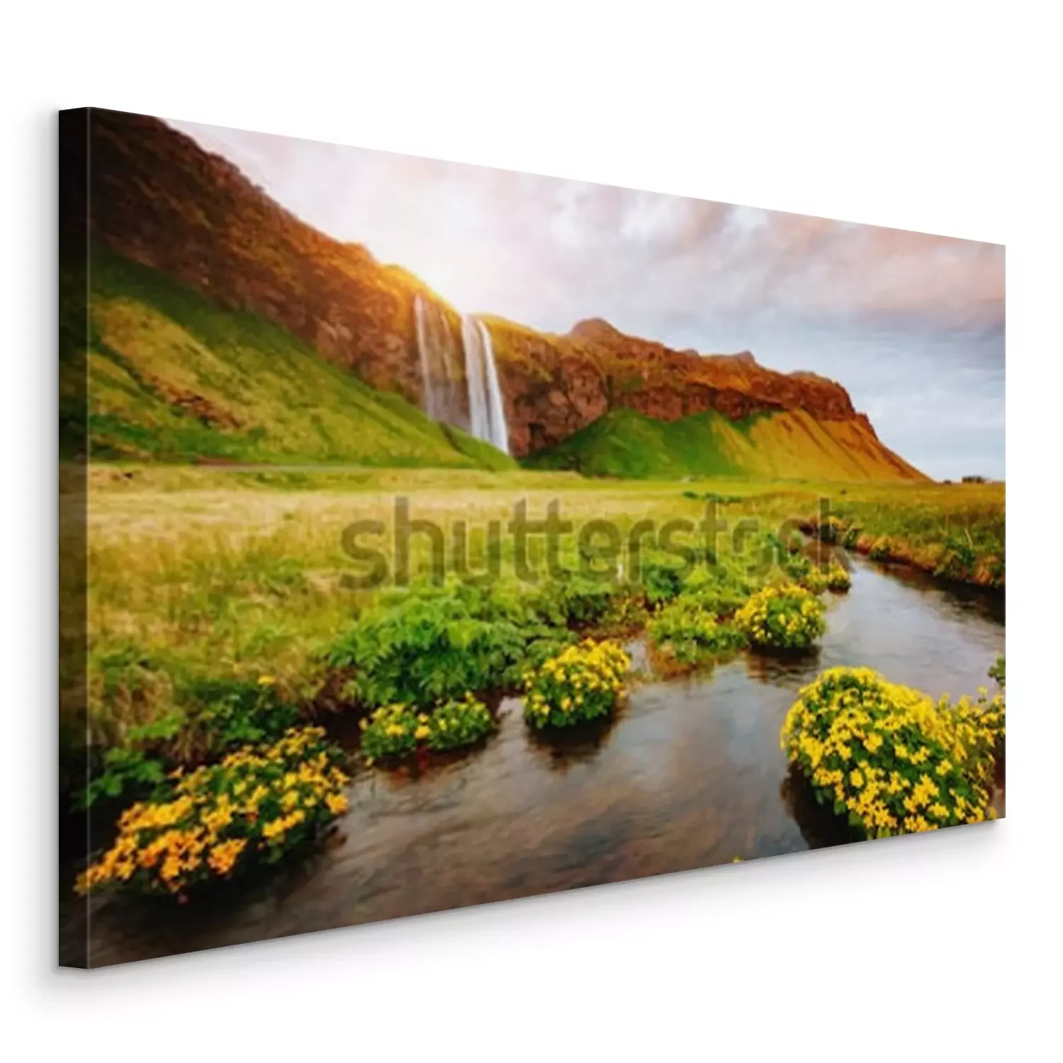 Canvas: Prachtig uitzicht op de bloeiende groene veld in zonlicht. Dramatische en prachtige scène. Populaire attractie attractie. Locatie plaats beroemde Seljalandsfoss waterval, IJsland, Europa. Ontdek de