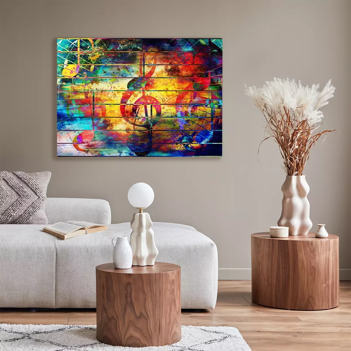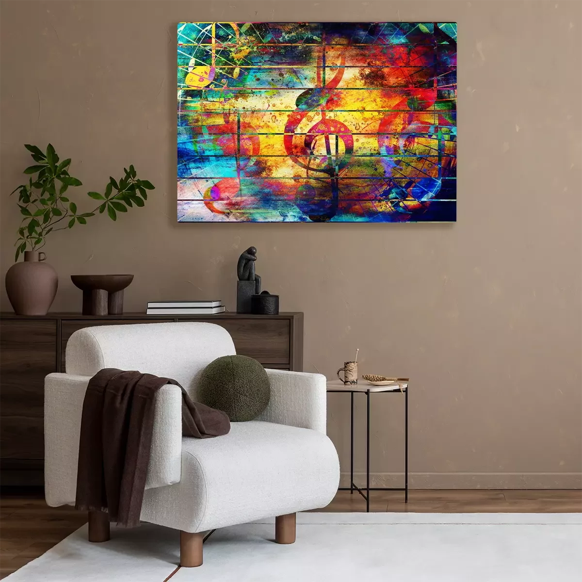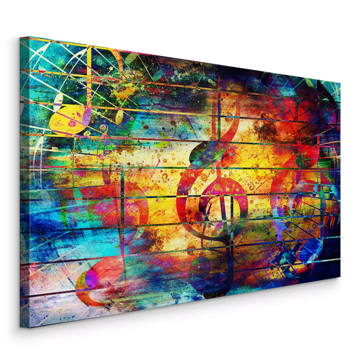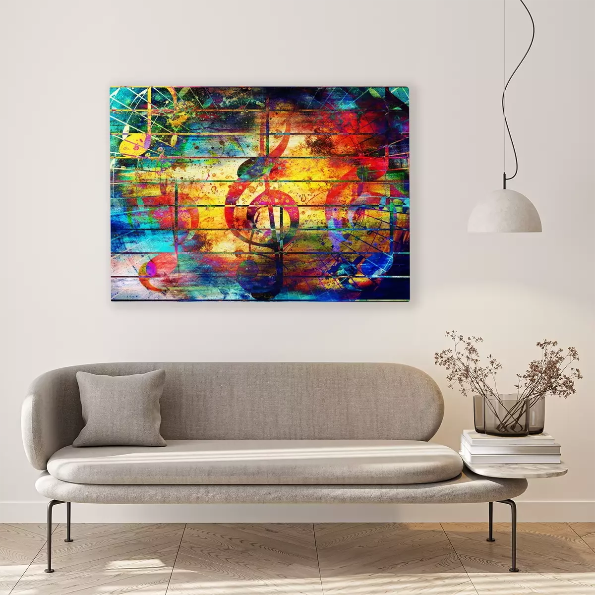 Canvas: Prachtige abstracte kleurrijke collage met muziek notities en de vioolsleutel.