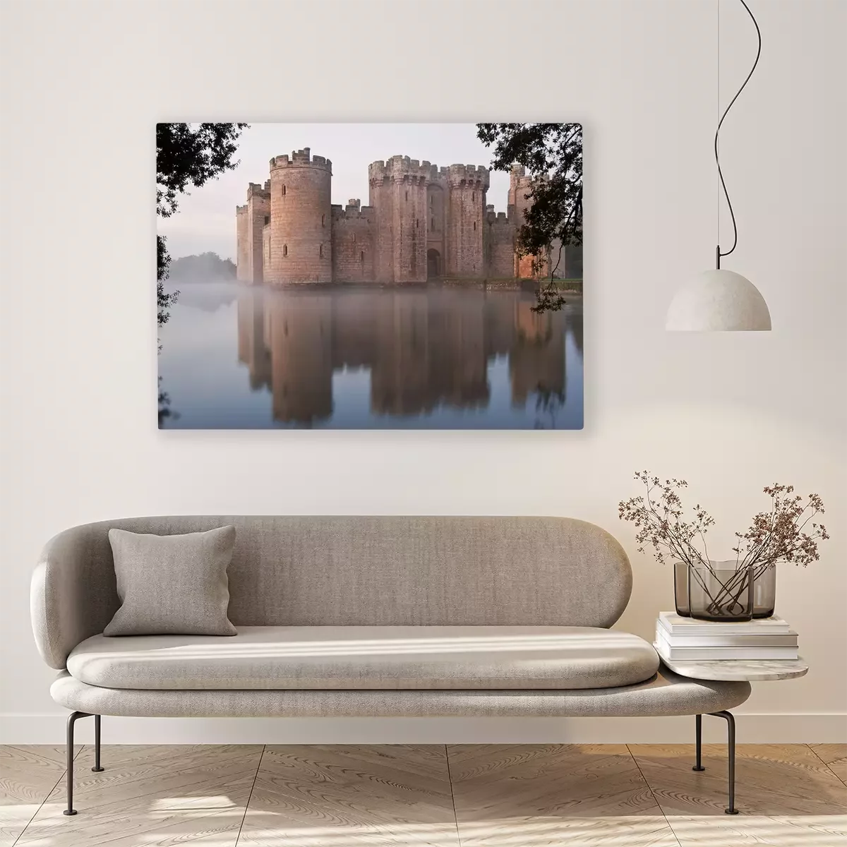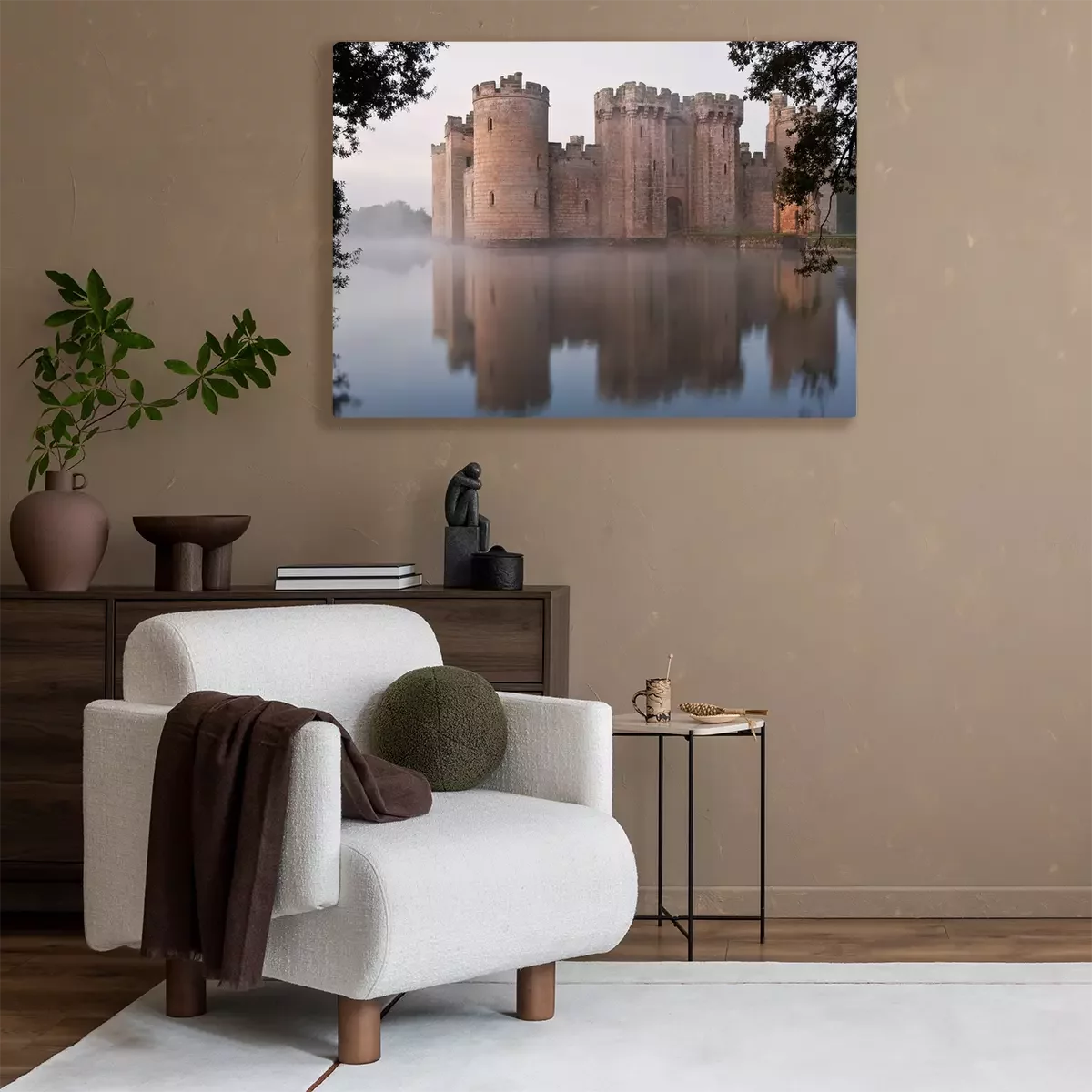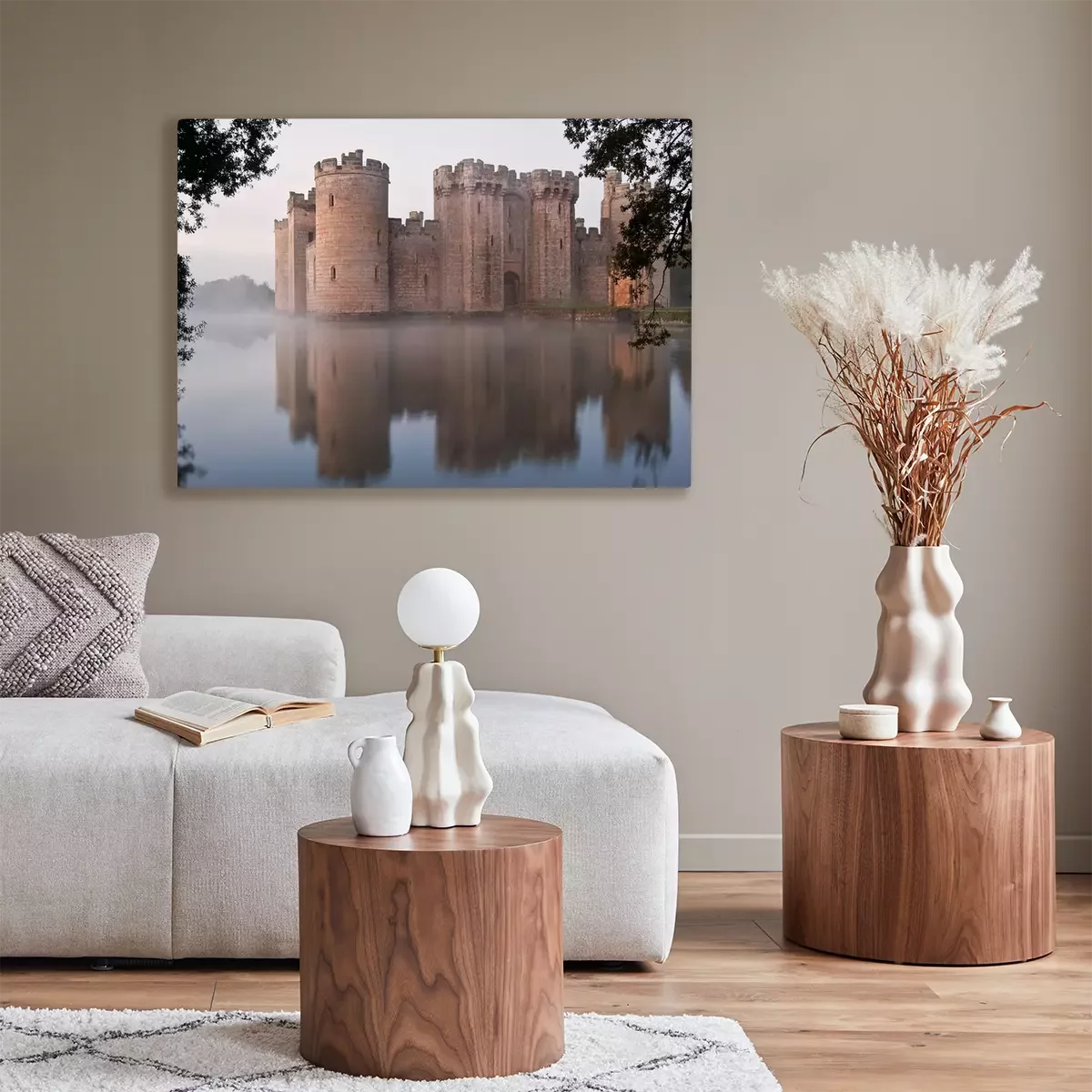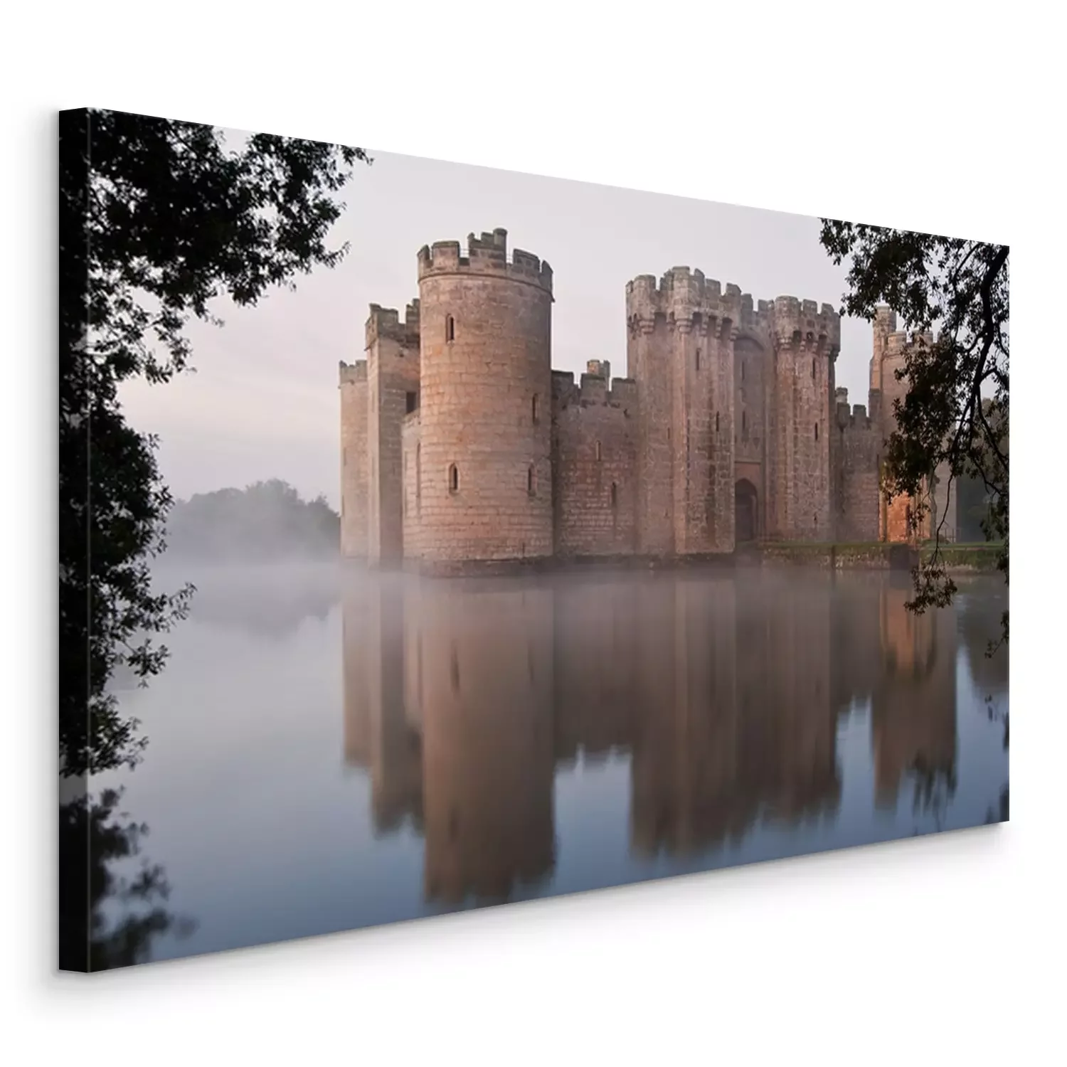 Canvas: Prachtige gracht en het kasteel in de herfst vallen zonsopgang met mist over m