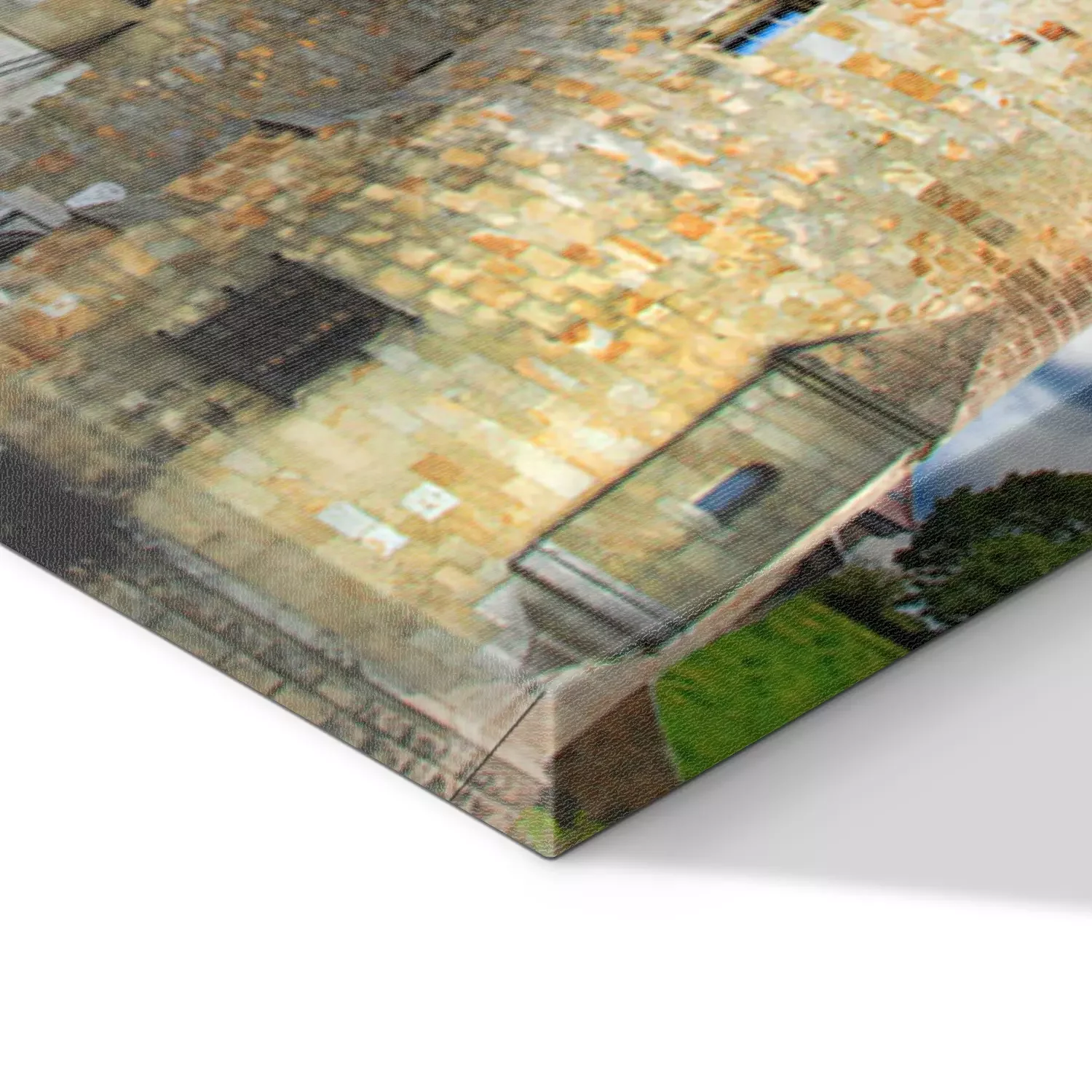 De print wordt aangebracht op hoogwaardig canvas dat op een schildersweefgetouw (spieraam) wordt gespannen. Omdat de print de zijranden bedekt, hoeft het ontwerp niet met een extra kader te worden omlijst. Wij raden ook composities aan die uit meerdere foto's bestaan en zo een coherente compositie vormen.