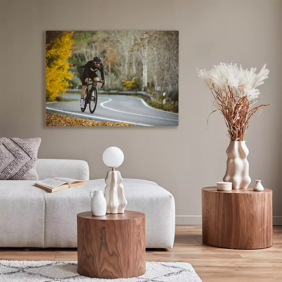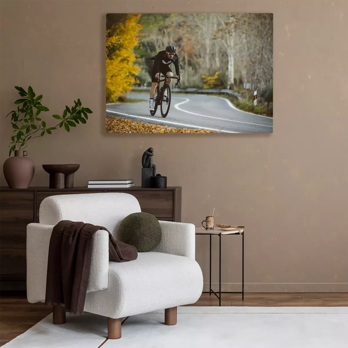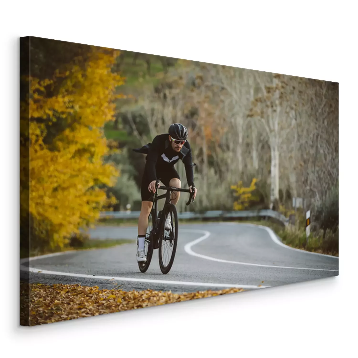 Canvas Professionele racefiets racer in actie. Mannen fietsen mountain racefiets bij zonsondergang.