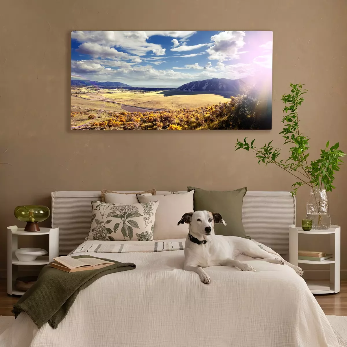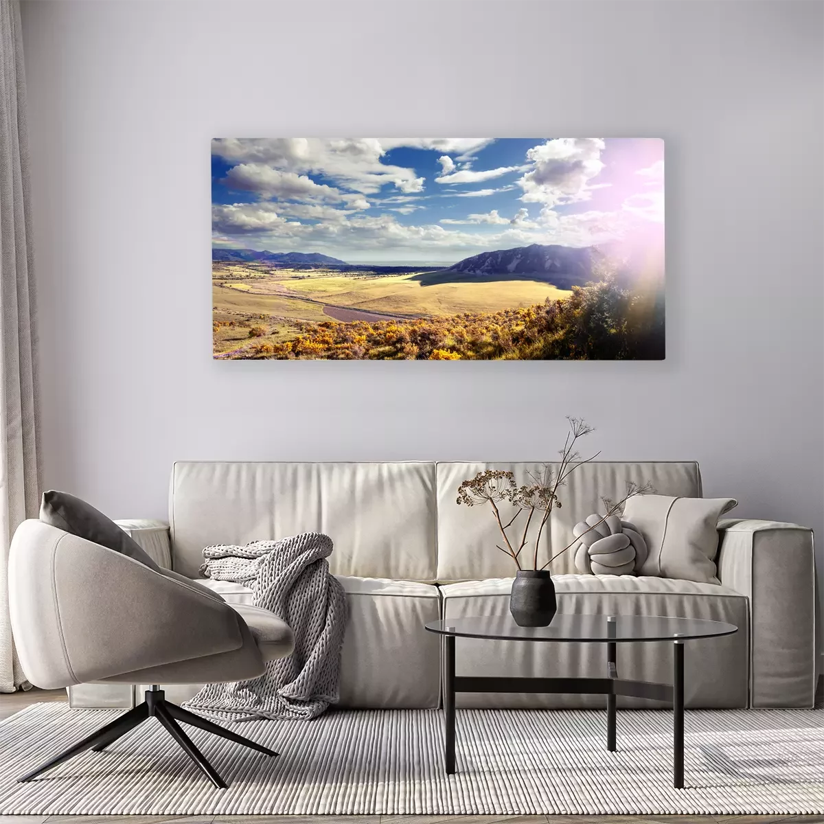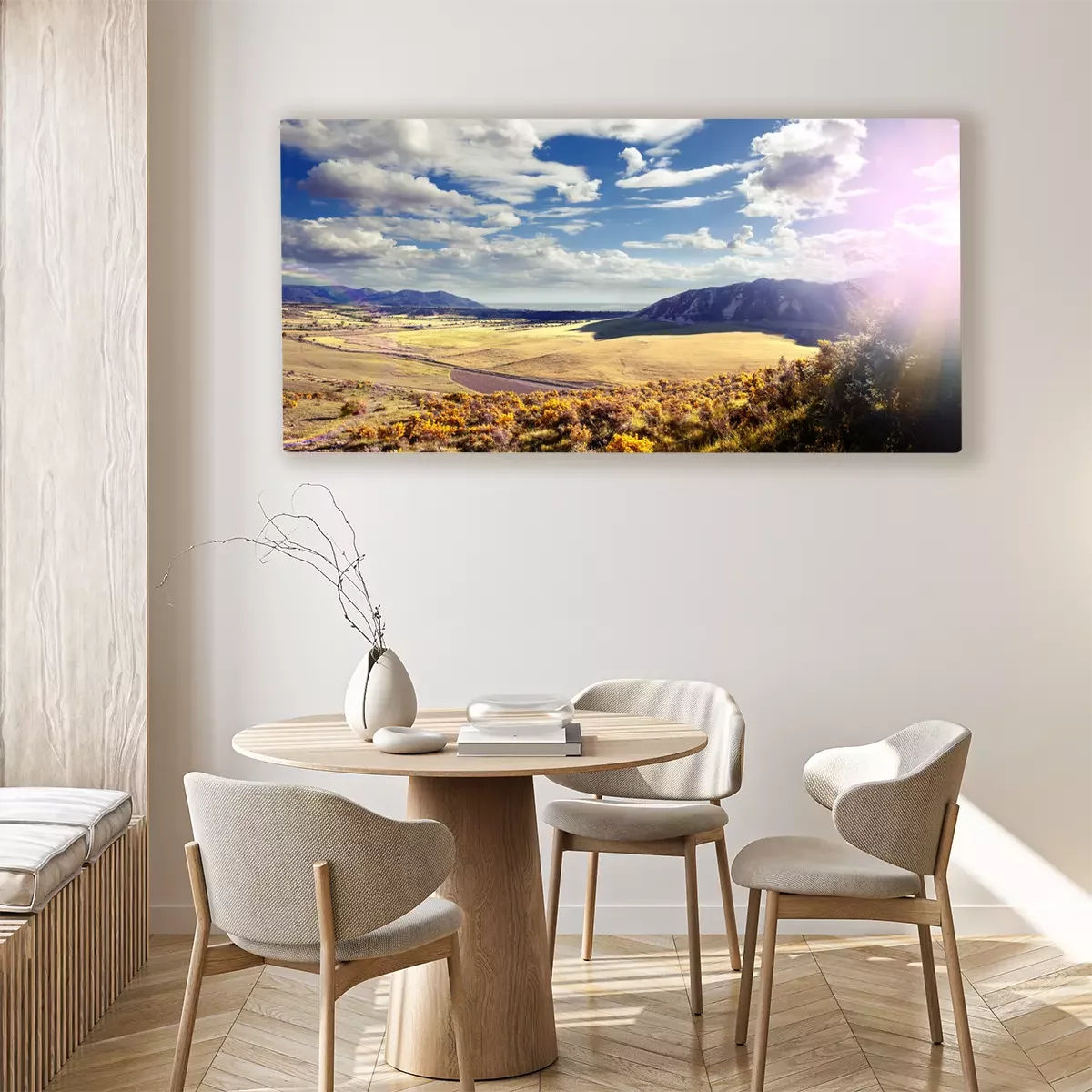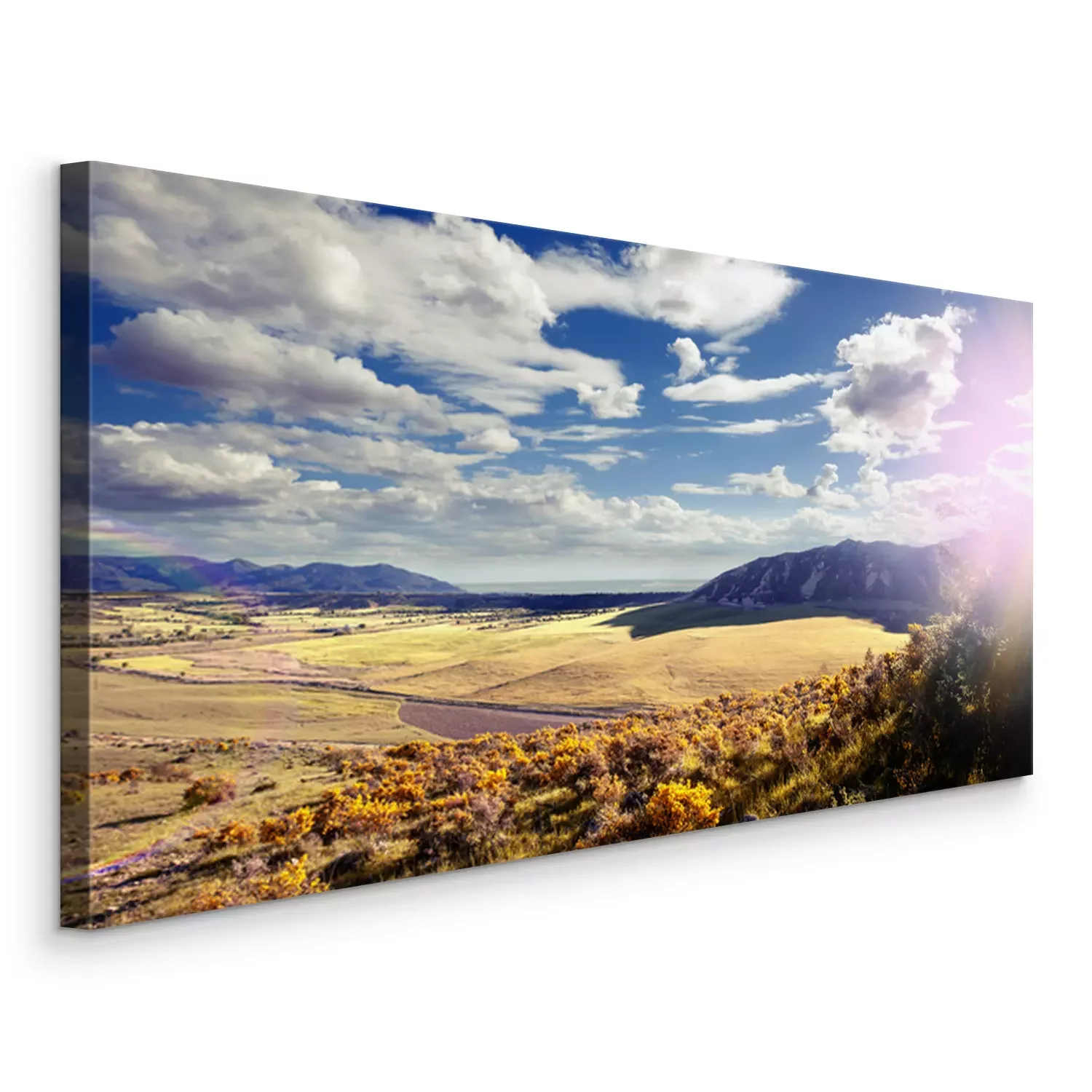 Canvas Puesta del sol paisaje. Los campos y sol. Cielo azul y nubes