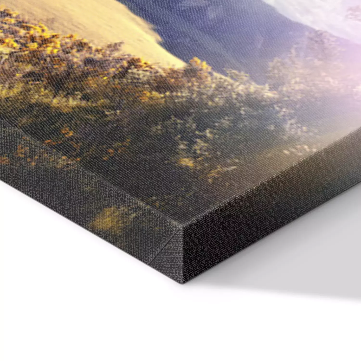 De print wordt aangebracht op hoogwaardig canvas dat op een schildersweefgetouw (spieraam) wordt gespannen. Omdat de print de zijranden bedekt, hoeft het ontwerp niet met een extra kader te worden omlijst. Wij raden ook composities aan die uit meerdere foto's bestaan en zo een coherente compositie vormen.