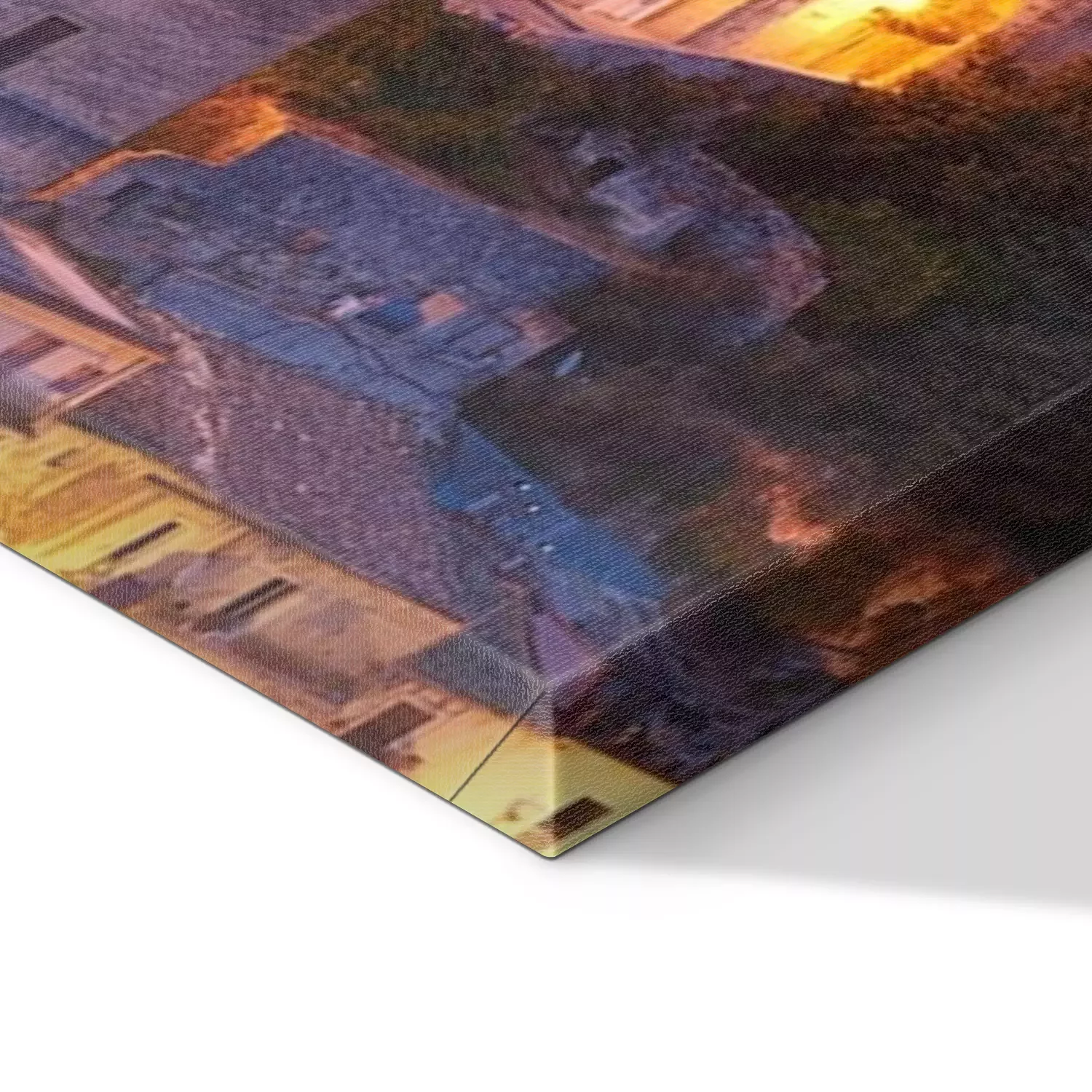 De print wordt aangebracht op hoogwaardig canvas dat op een schildersweefgetouw (spieraam) wordt gespannen. Omdat de print de zijranden bedekt, hoeft het ontwerp niet met een extra kader te worden omlijst. Wij raden ook composities aan die uit meerdere foto's bestaan en zo een coherente compositie vormen.