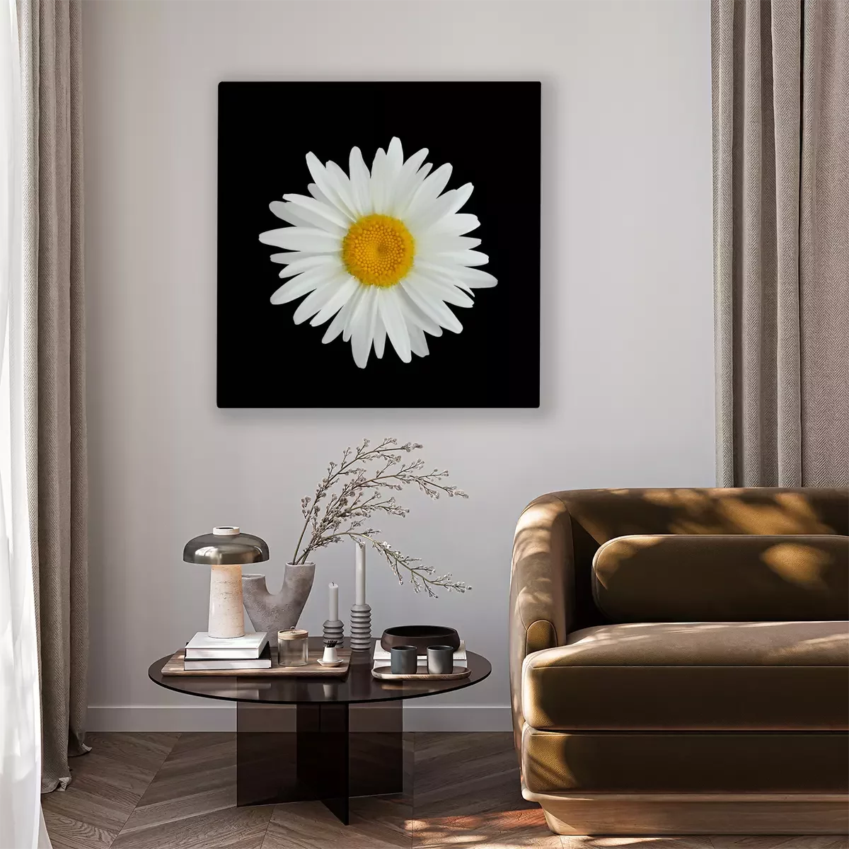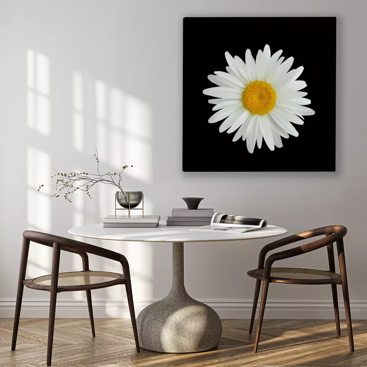 Canvas: Realistische madeliefjebloem die op donkere achtergrond wordt geïsoleerd