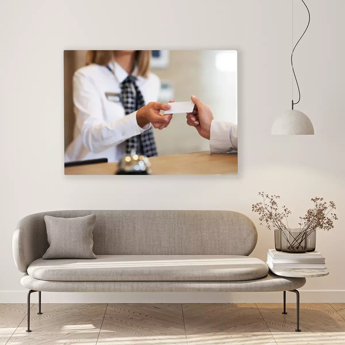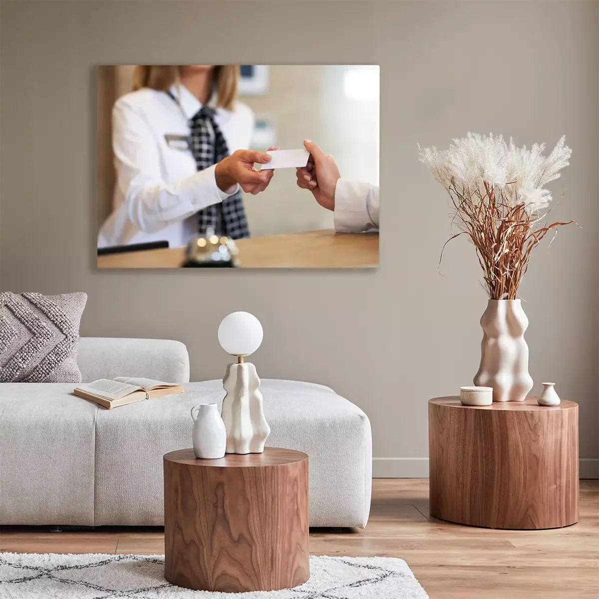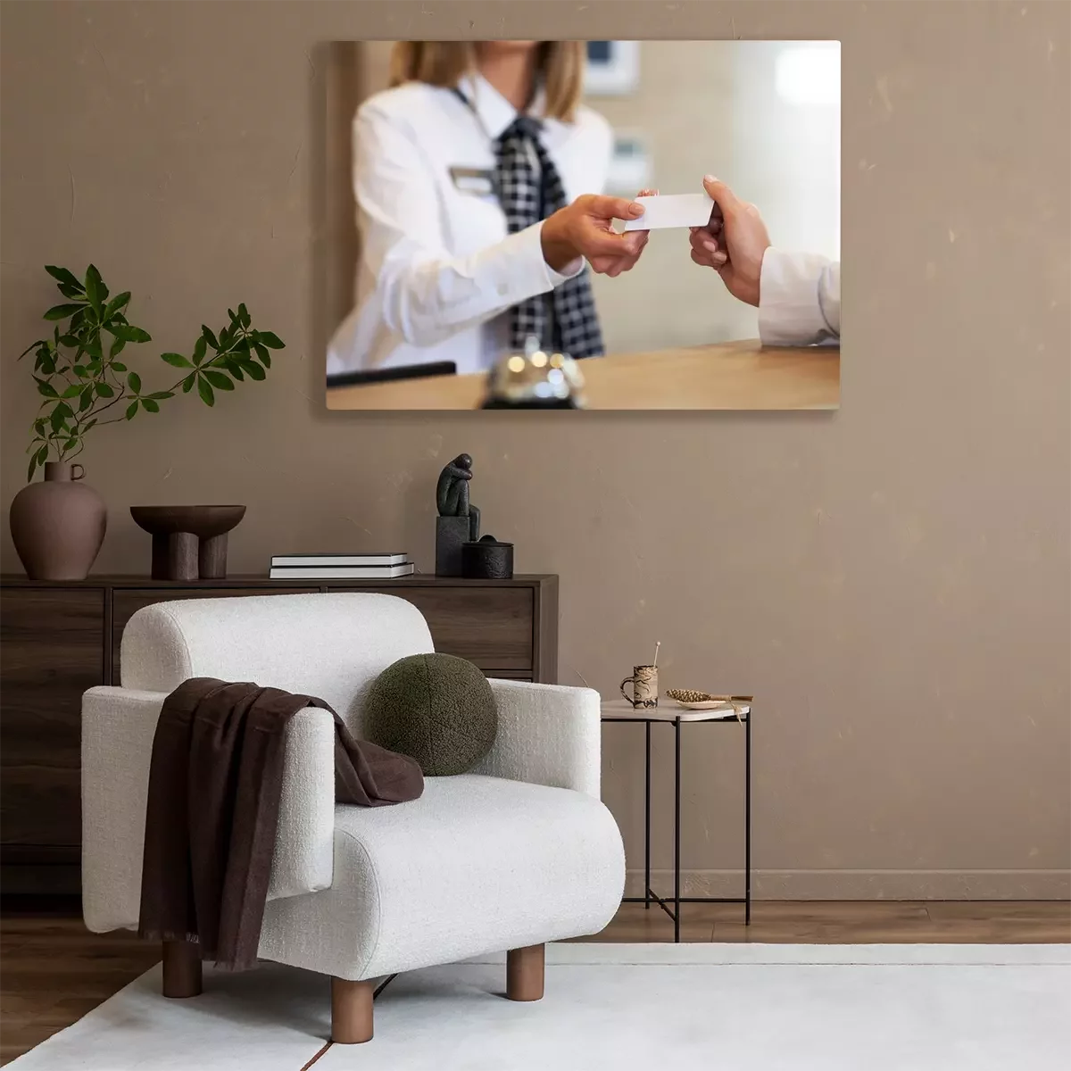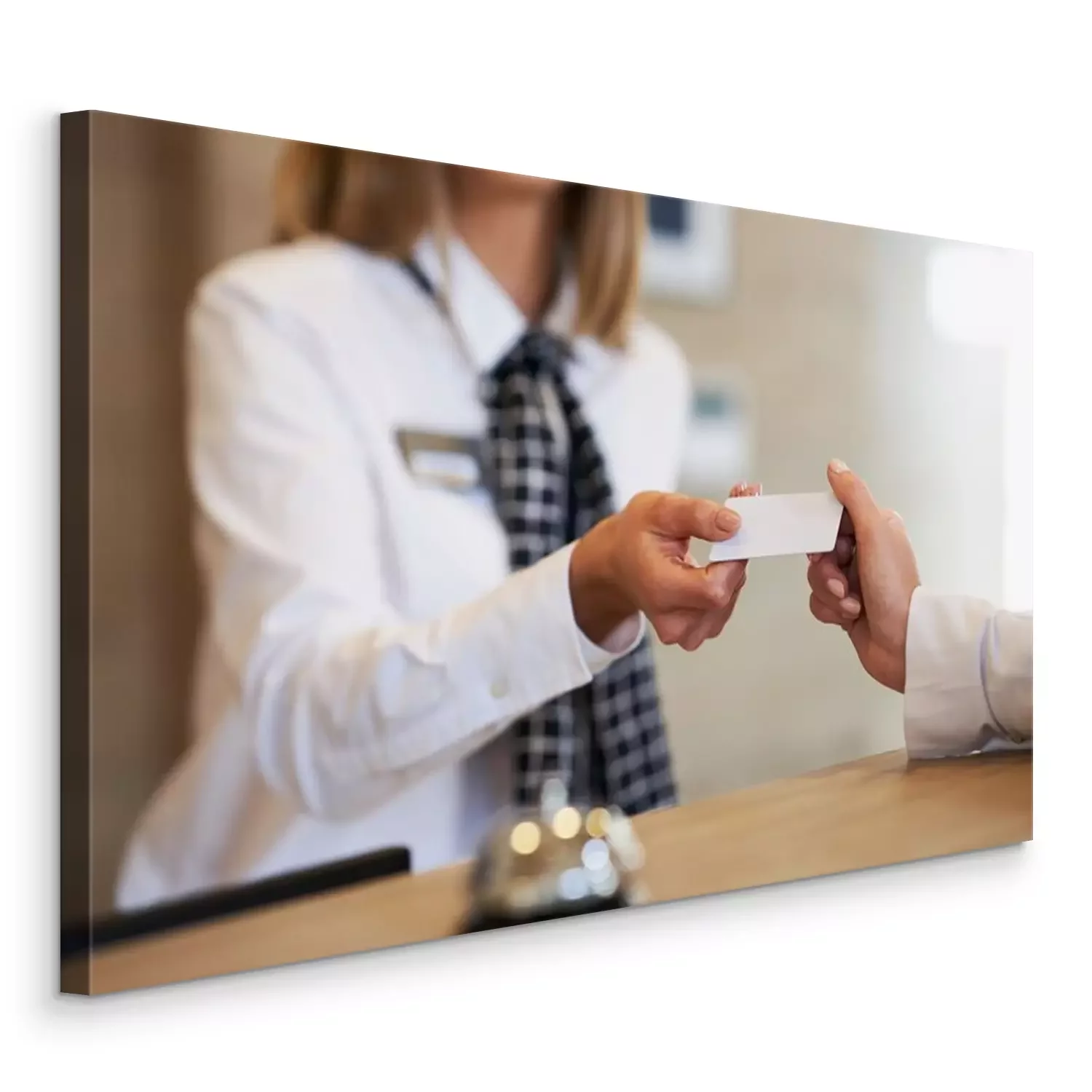 Canvas: Receptionist giving key card to businesswoman at hotel front desk