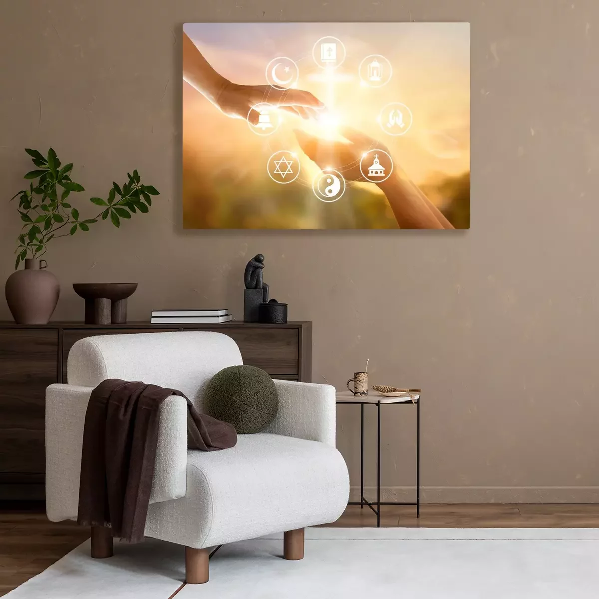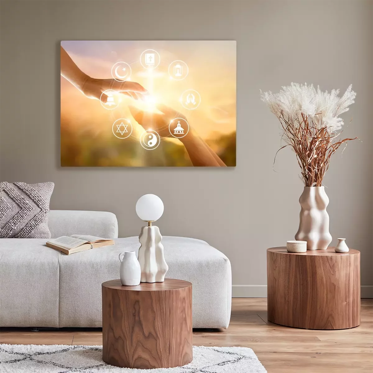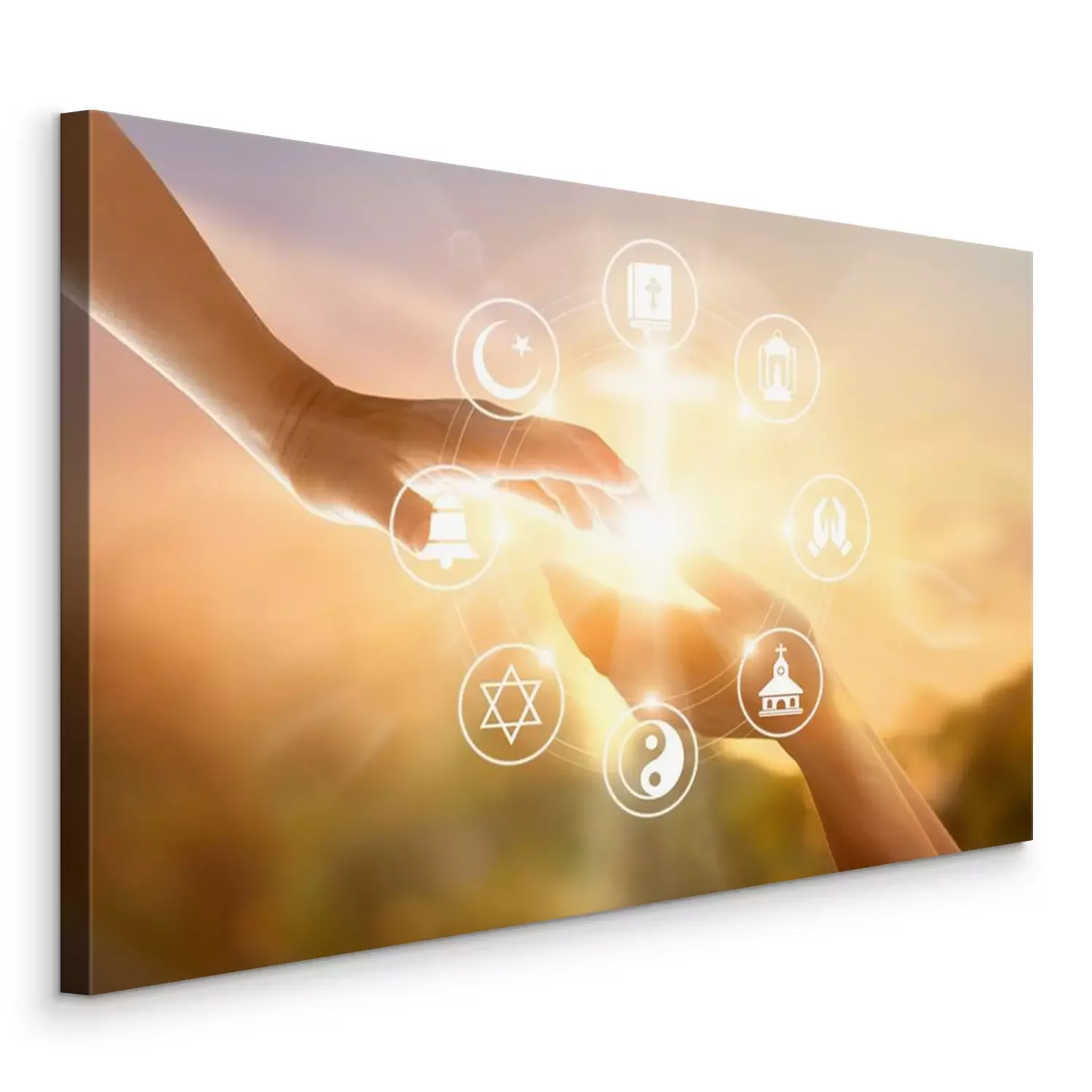 Canvas Religie concept. Menselijke handen samen vergeeft en zegent. Bidden en religies pictogram op hemel zonsondergang achtergrond