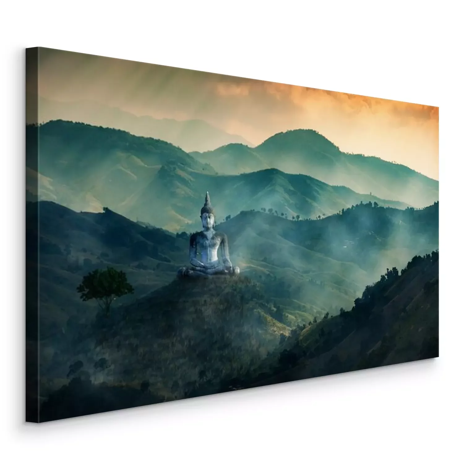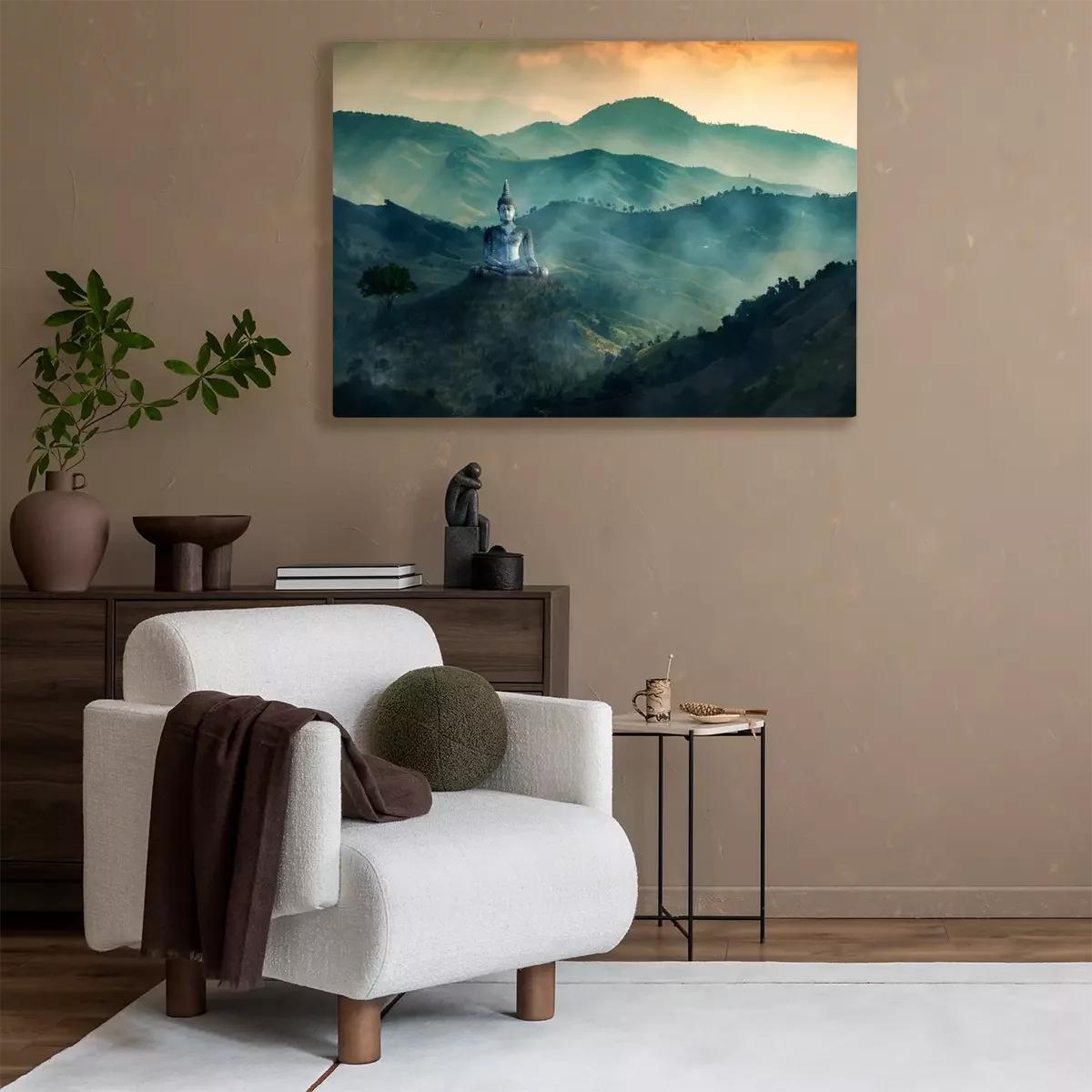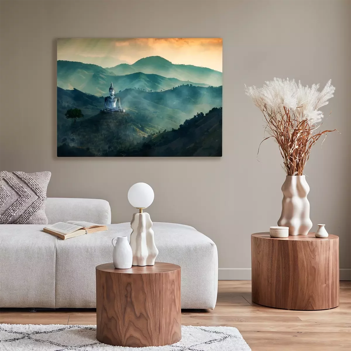 Canvas Religieus standbeeld tegen een prachtig berglandschap