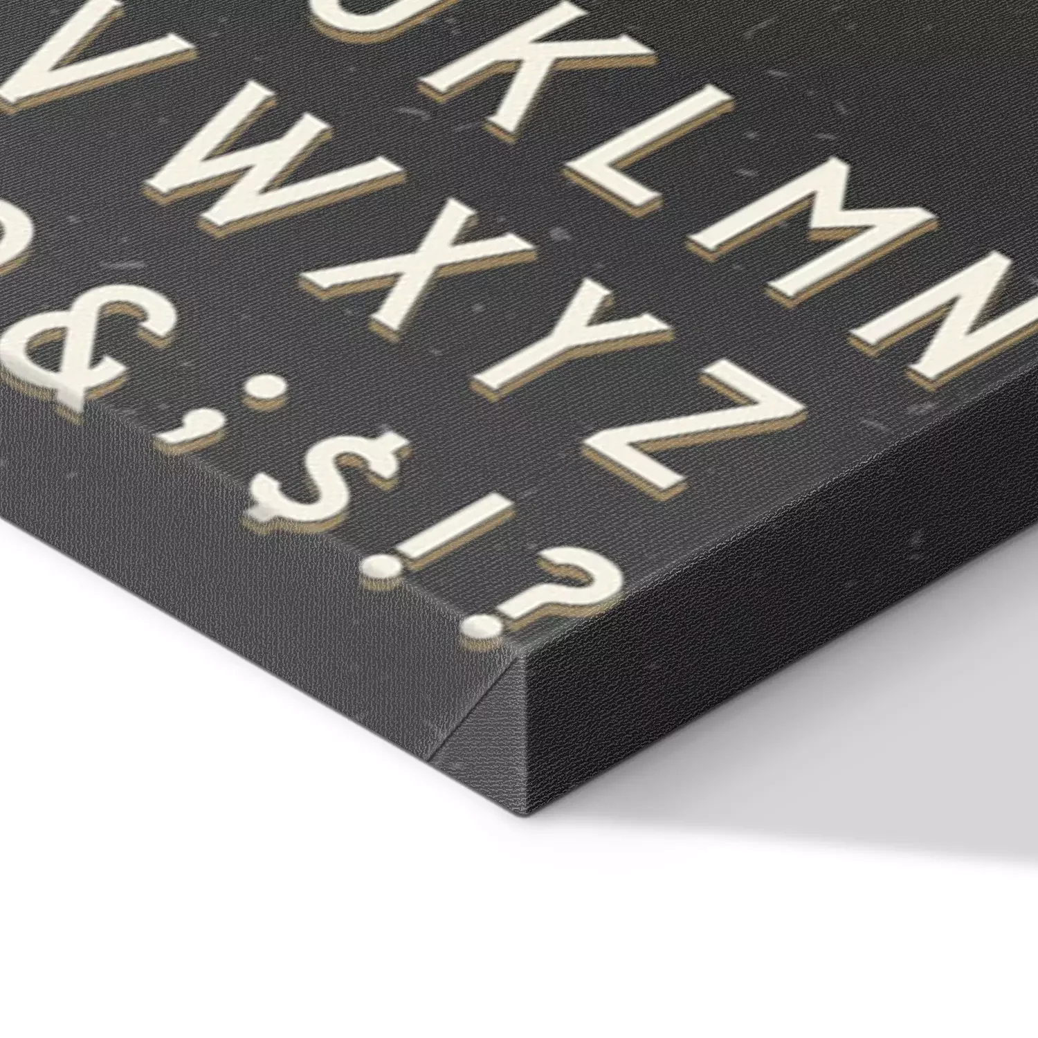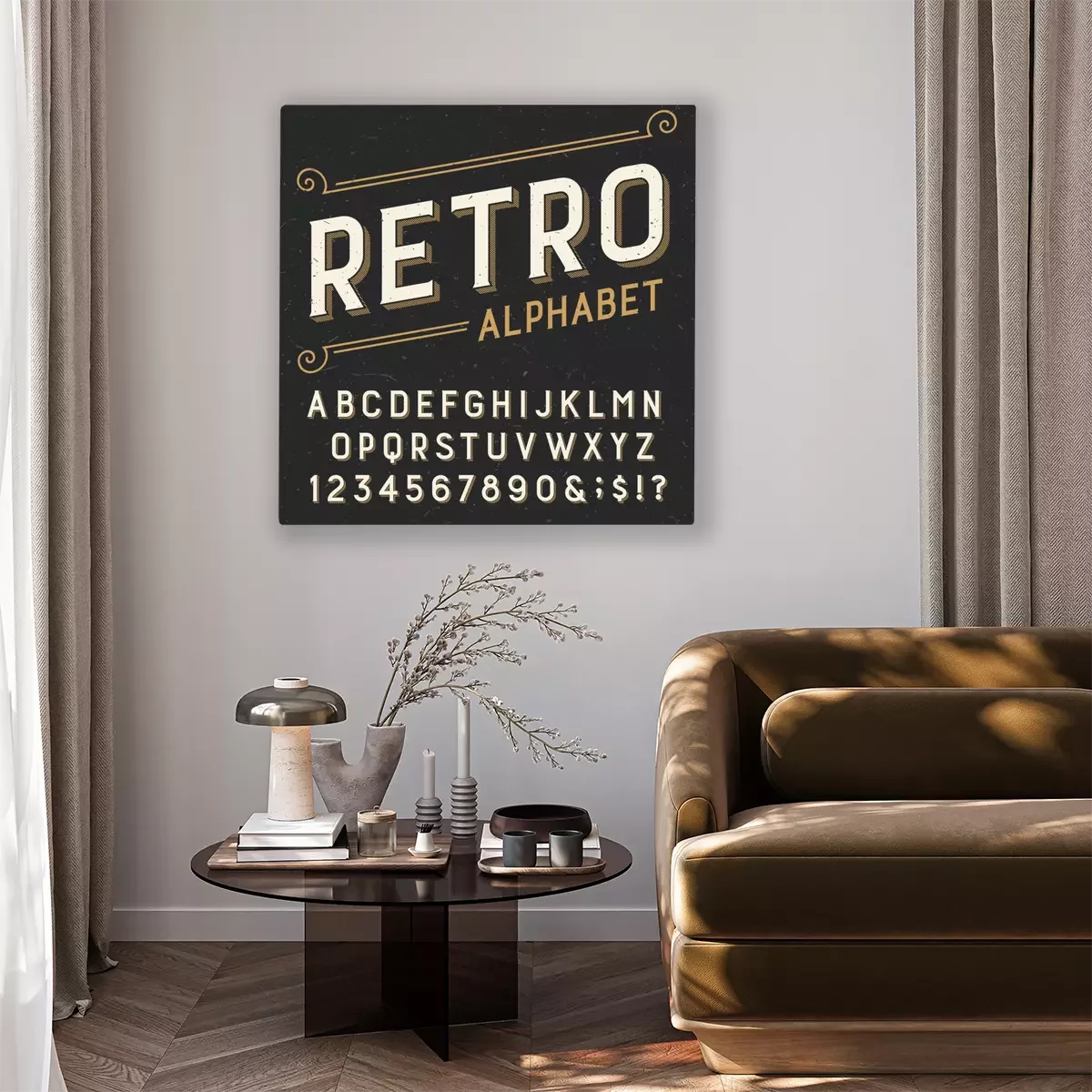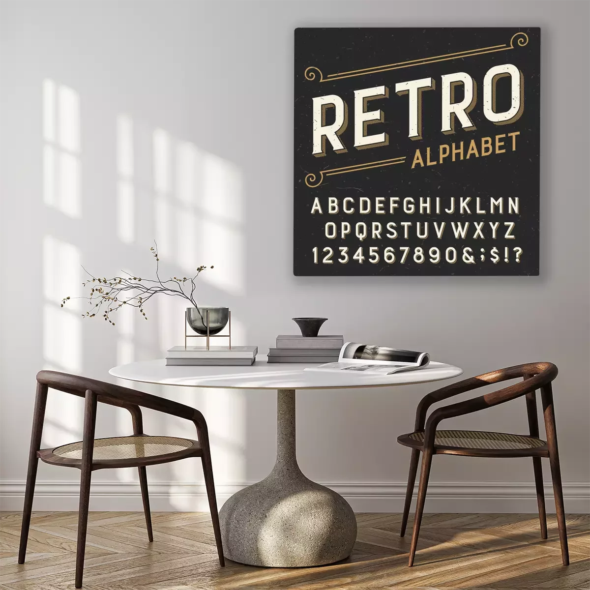 Canvas Retro alfabet vector lettertype. Serif soort letters, cijfers en symbolen. op een donkere verontruste gekraste achtergrond. Stock vector typografie voor etiketten, koppen, posters etc.