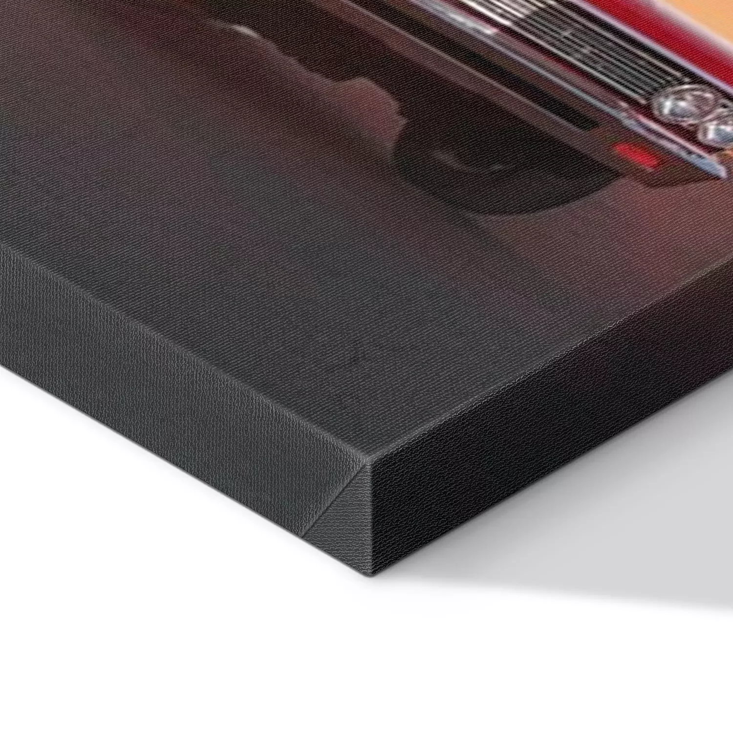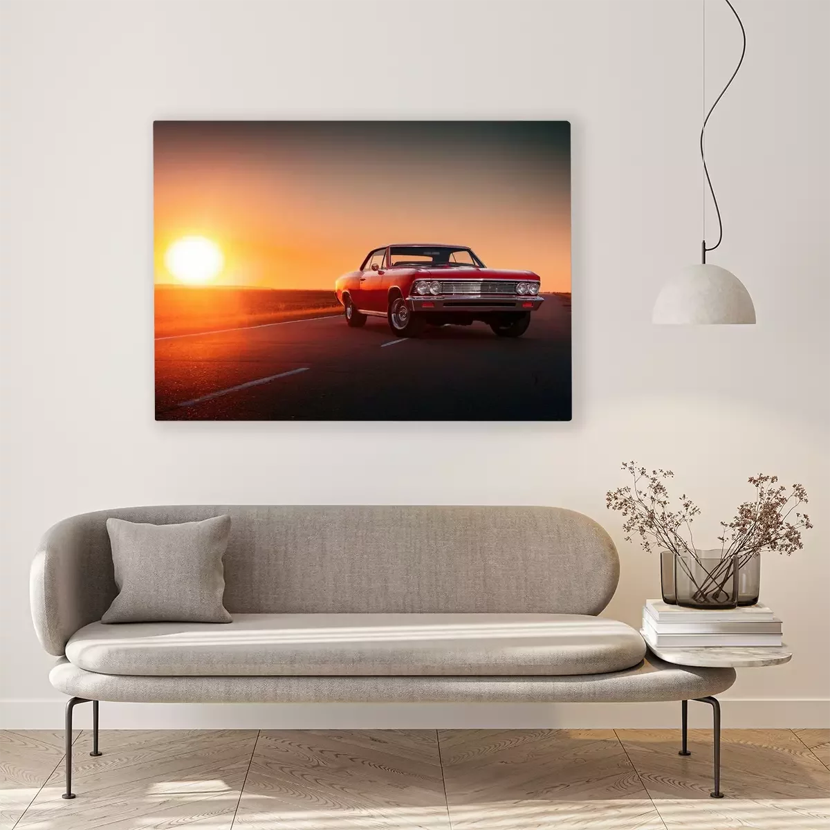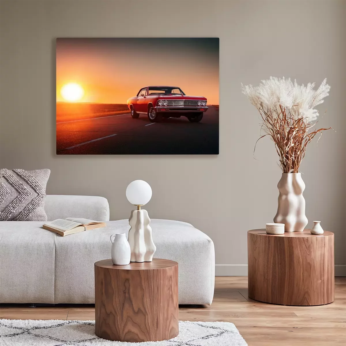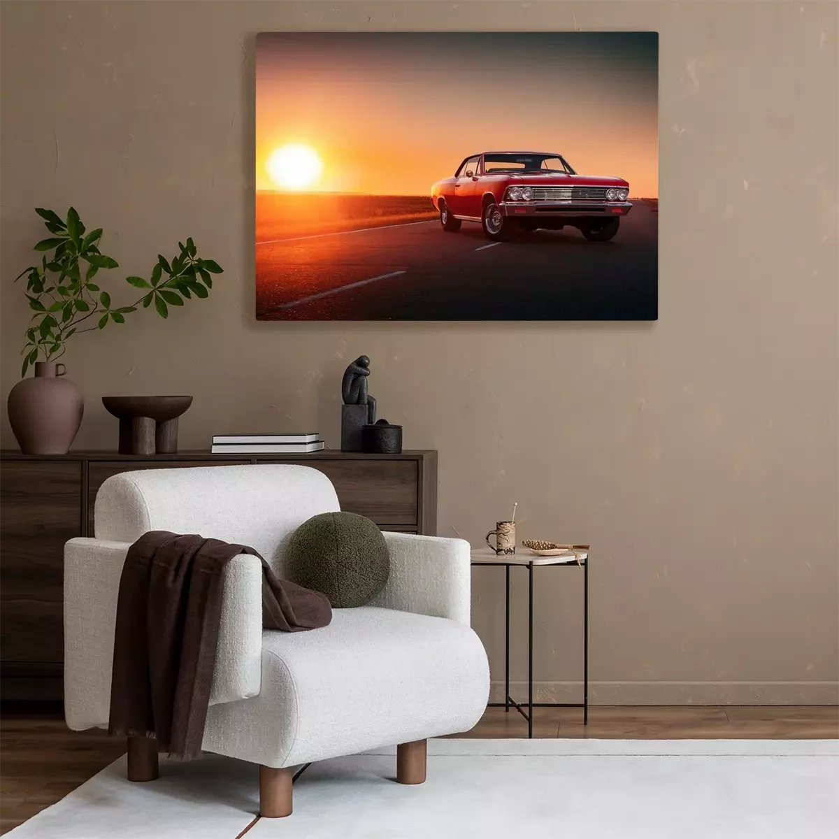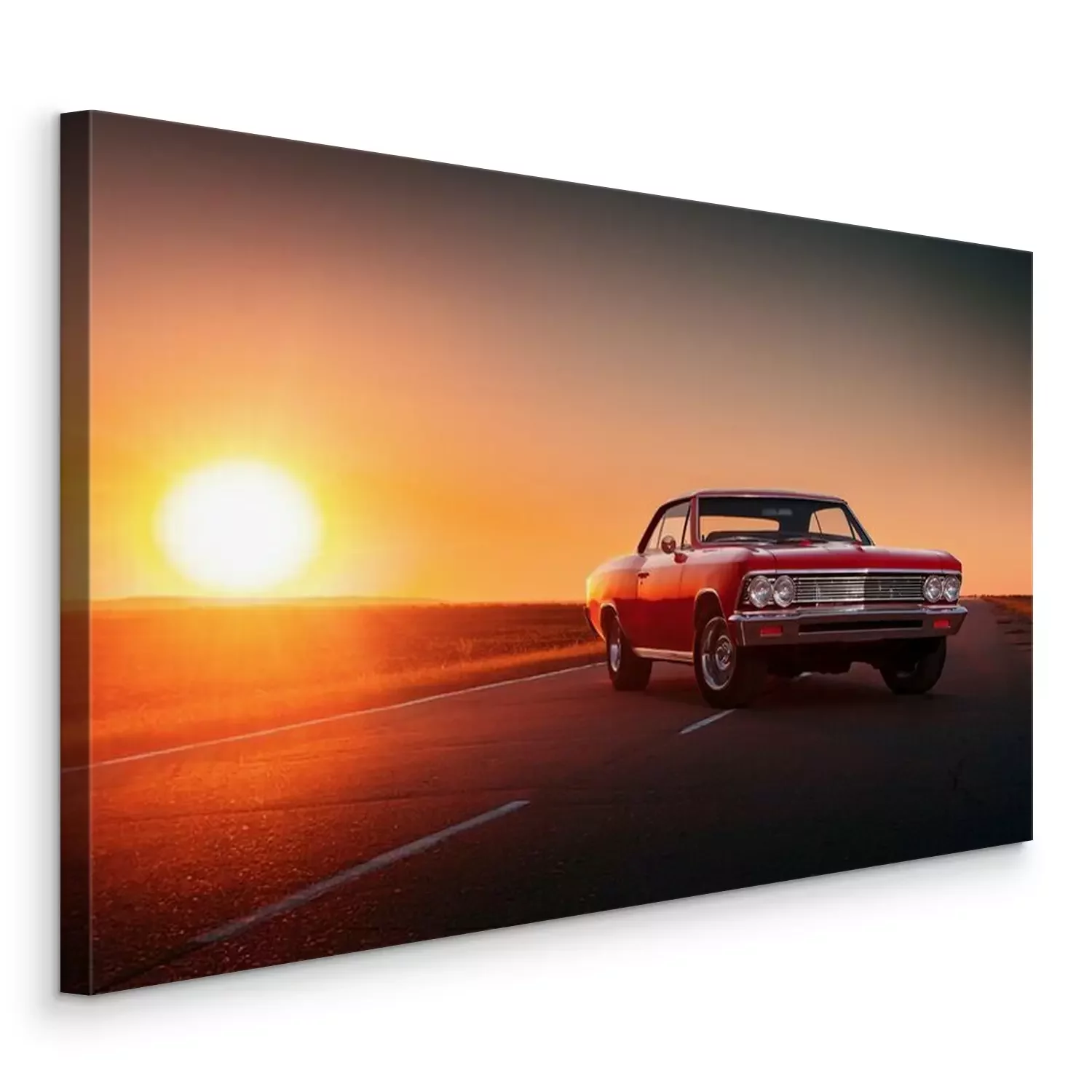 Canvas Retro rode auto staande op asfalt weg bij zonsondergang
