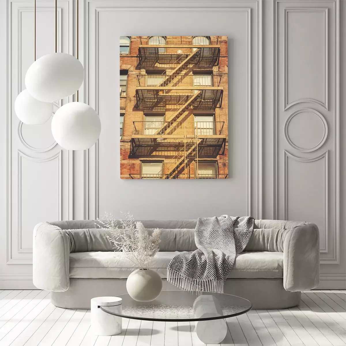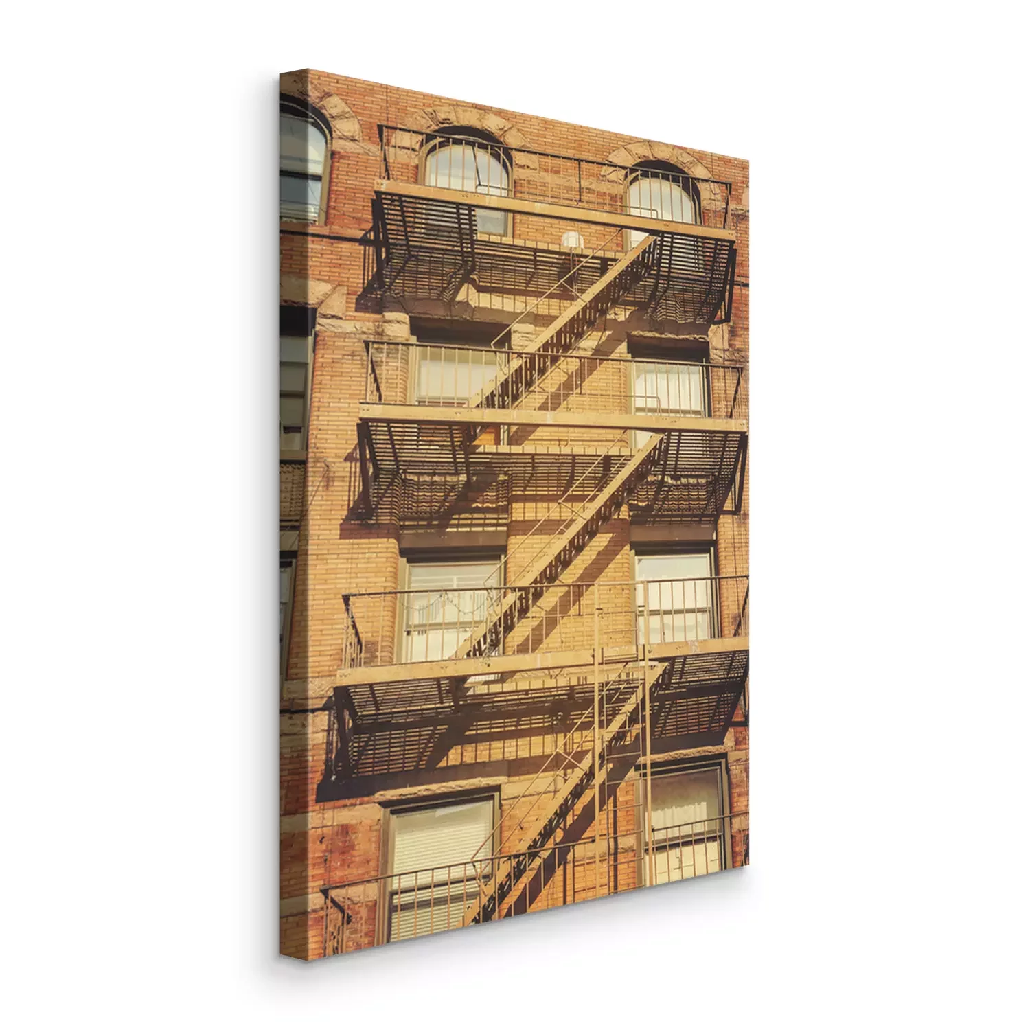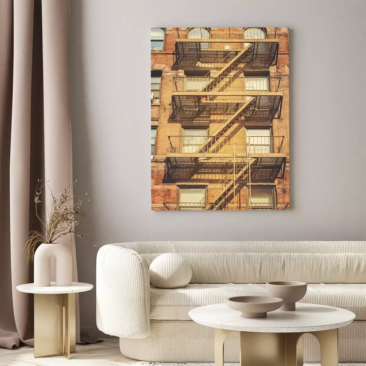Canvas: Retro-stijl foto van het gebouw met brandtrap ladders, NYC.