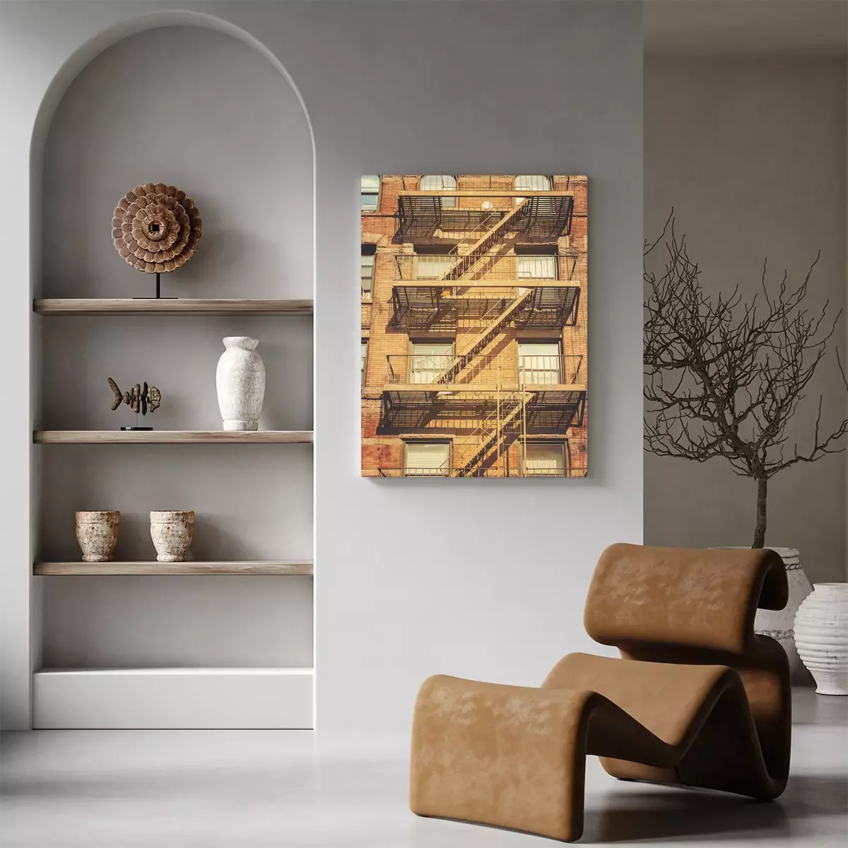 Canvas Retro-stijl foto van het gebouw met brandtrap ladders, NYC.