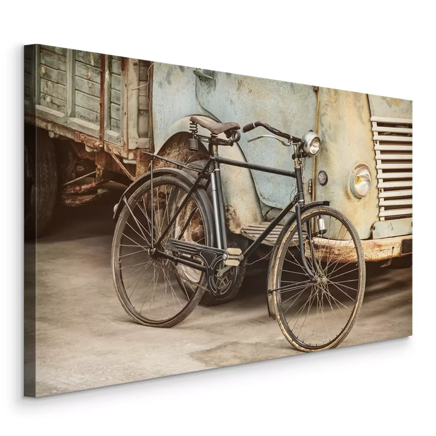 Canvas: Retro styled image of an ancient bike and truck