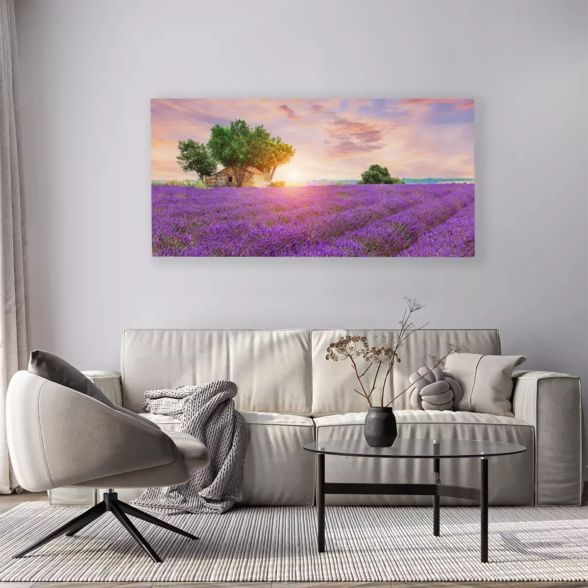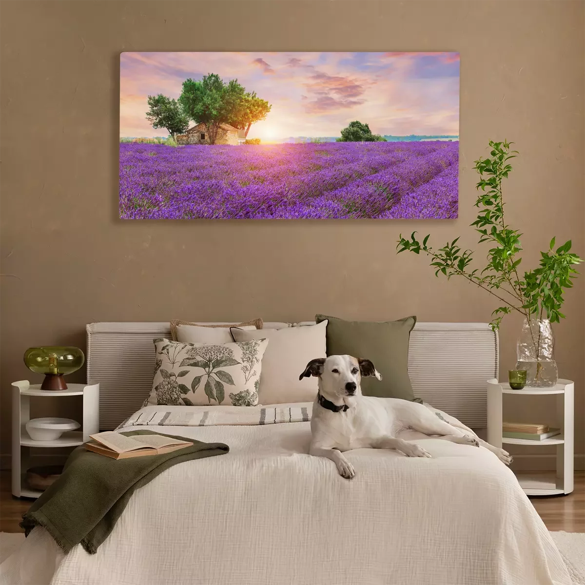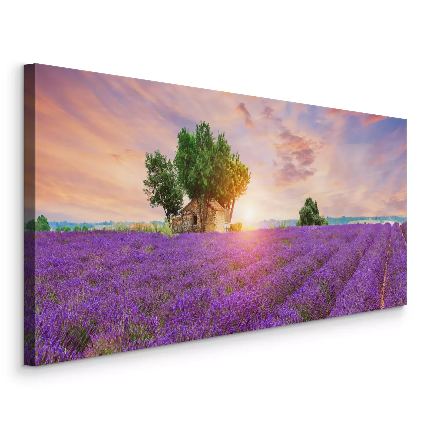 Rijen lavendel in het licht van de zonsondergang en een huisje