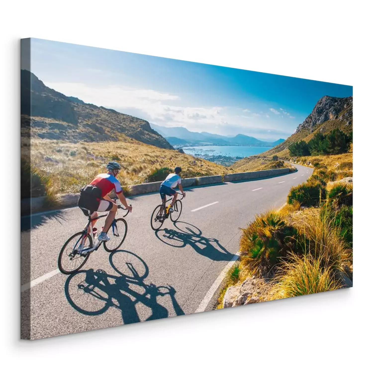 Canvas Road cycling photo. Two triathlete train in beautiful nature. Sea and mountains in background. Alcudia, Mallorca, Spain