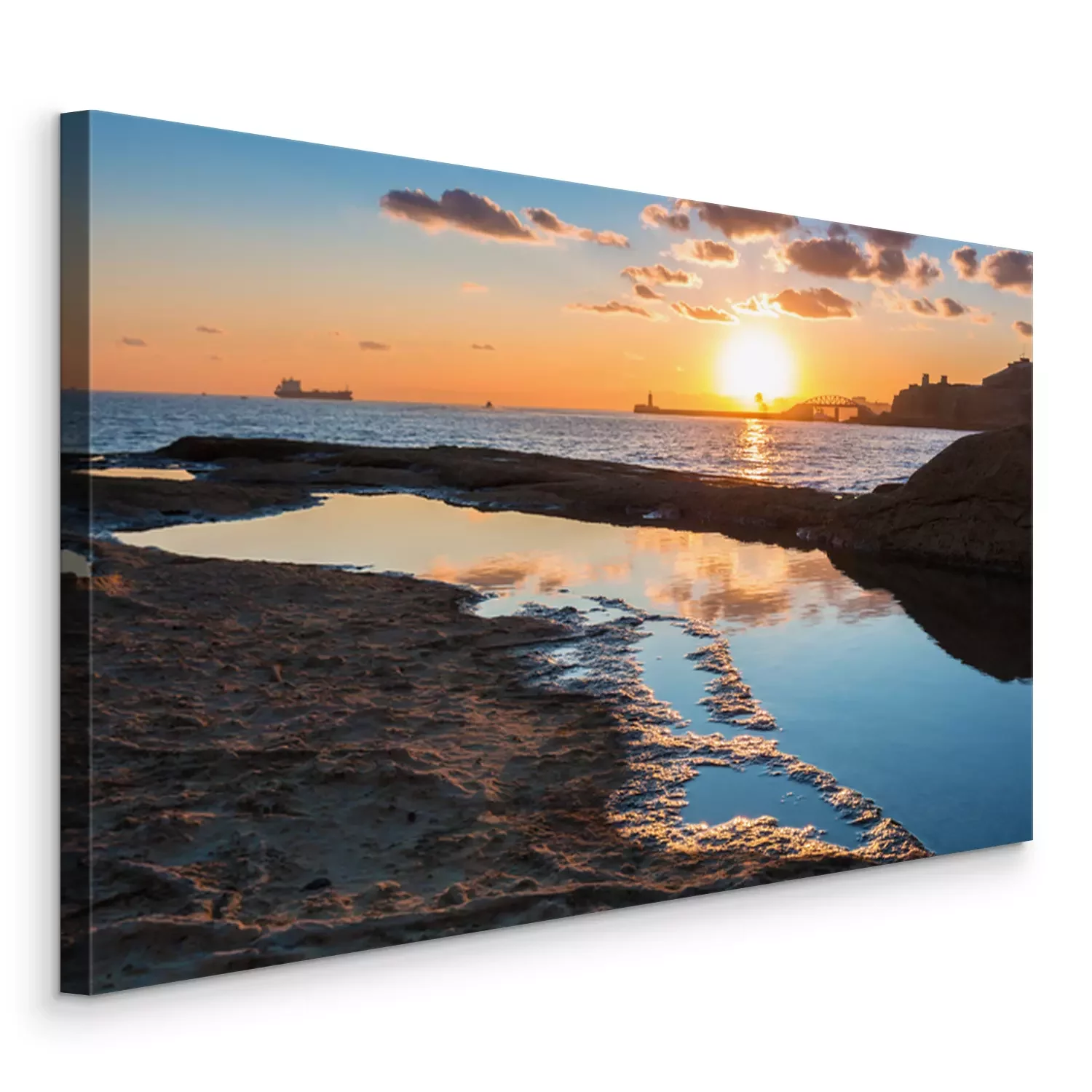 Canvas: Rocky coastline of Malta and Mediterranean Sea at sunrise