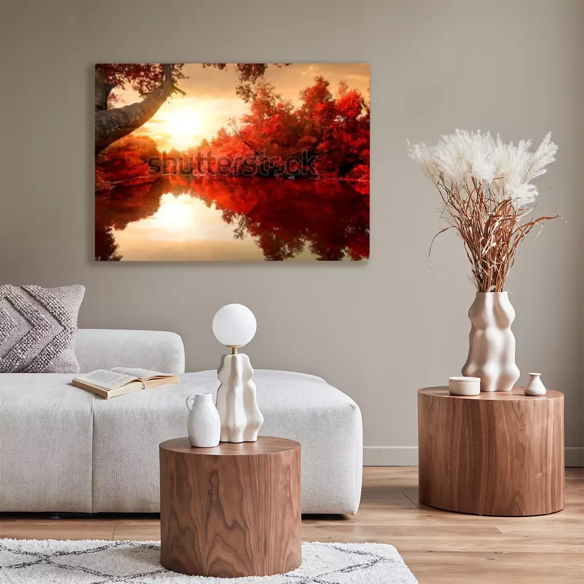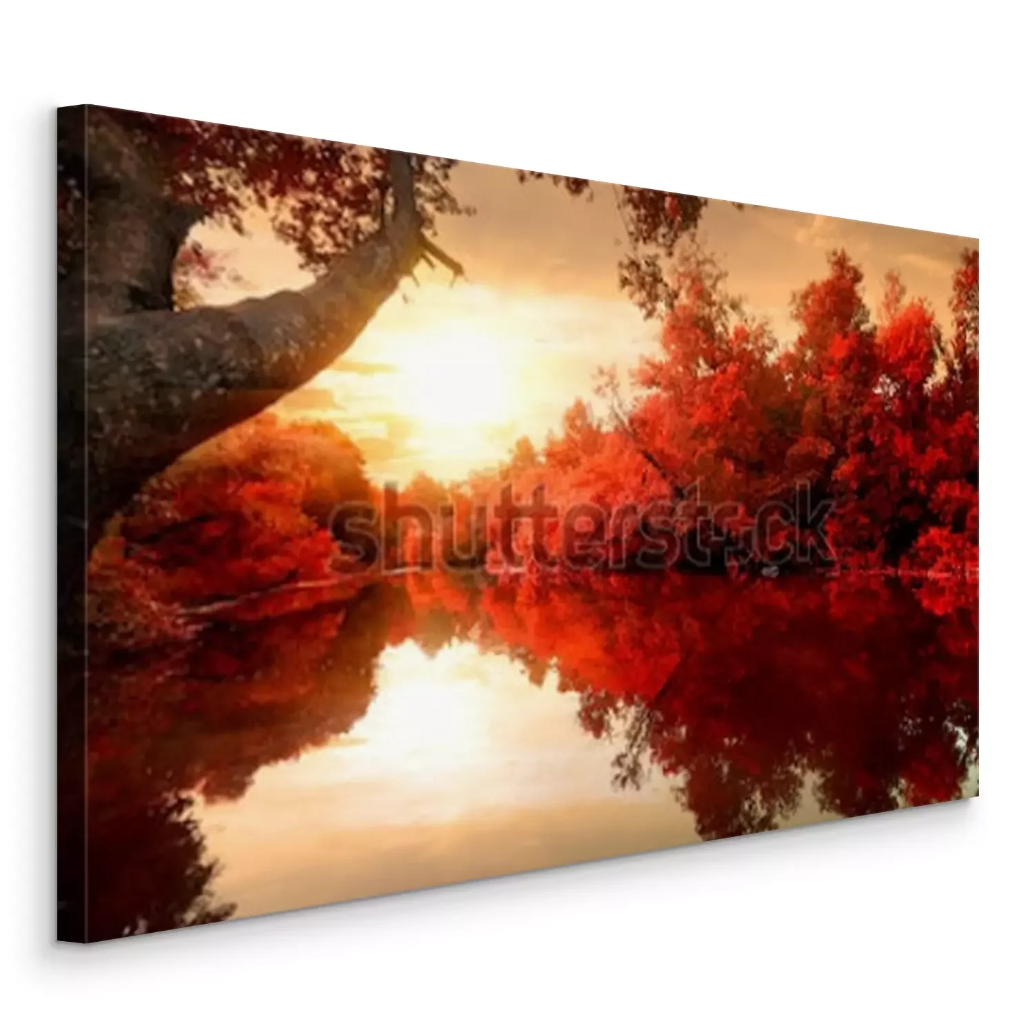 Canvas: Rode bladeren op bomen slow de rivier in de herfst