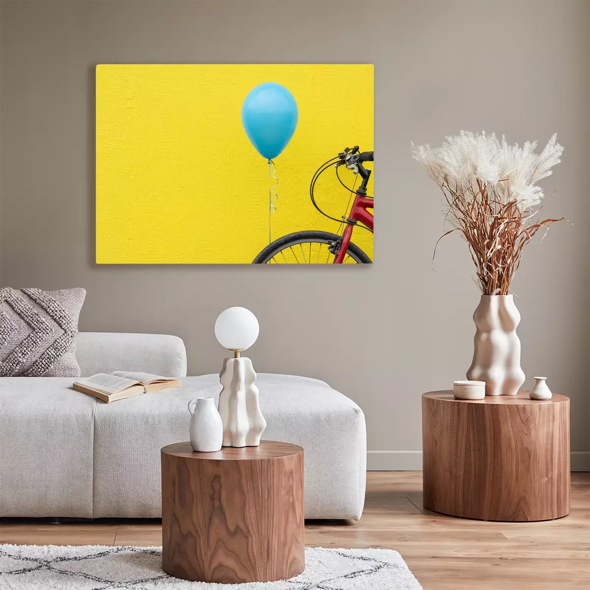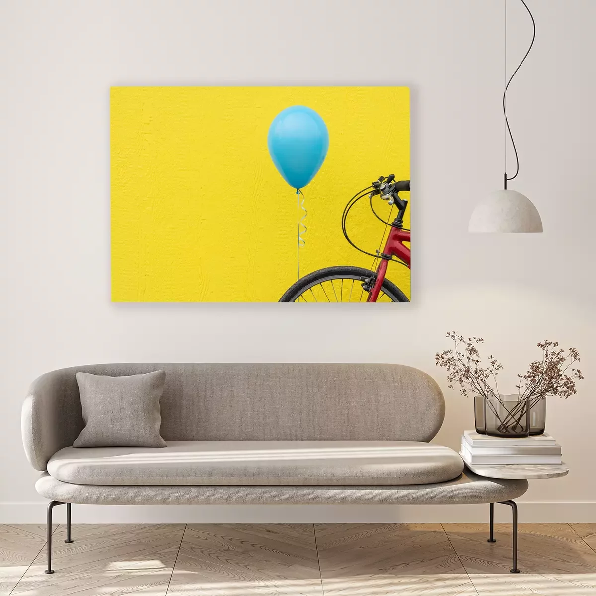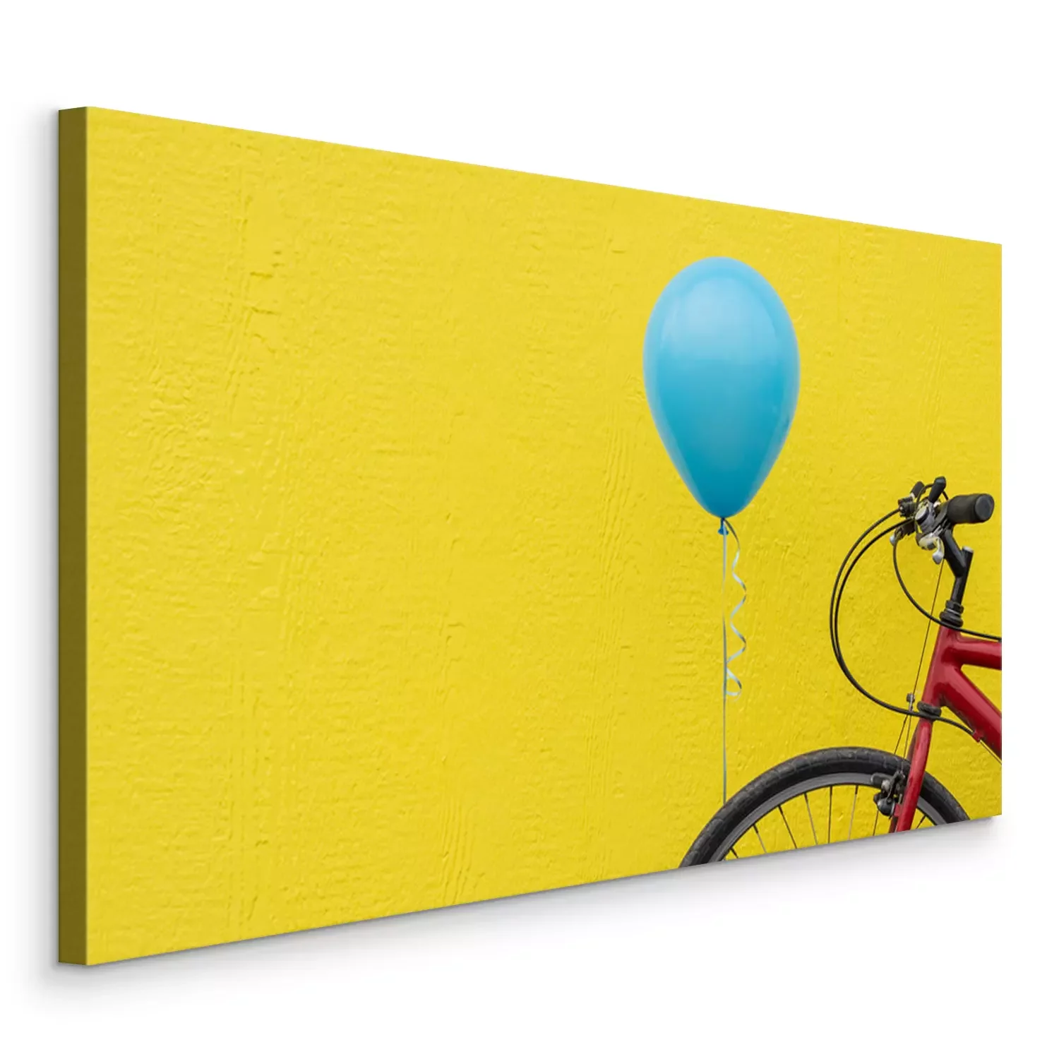 Canvas: Rode fiets met een blauwe ballon tegen een fel gele muur.