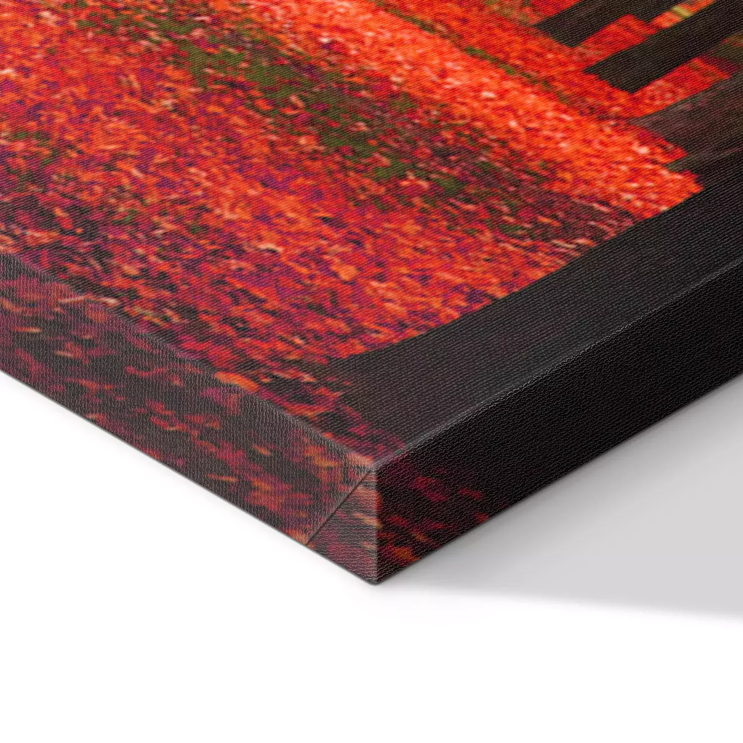 De print wordt aangebracht op hoogwaardig canvas dat op een schildersweefgetouw (spieraam) wordt gespannen. Omdat de print de zijranden bedekt, hoeft het ontwerp niet met een extra kader te worden omlijst. Wij raden ook composities aan die uit meerdere foto's bestaan en zo een coherente compositie vormen.