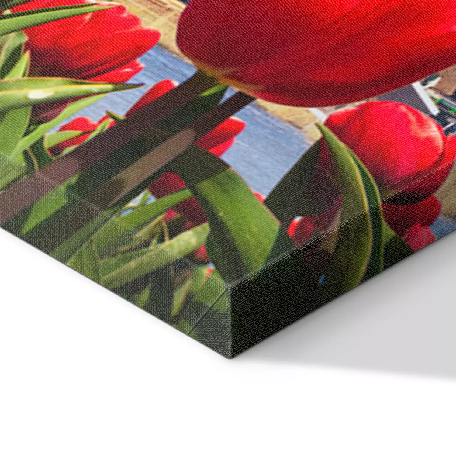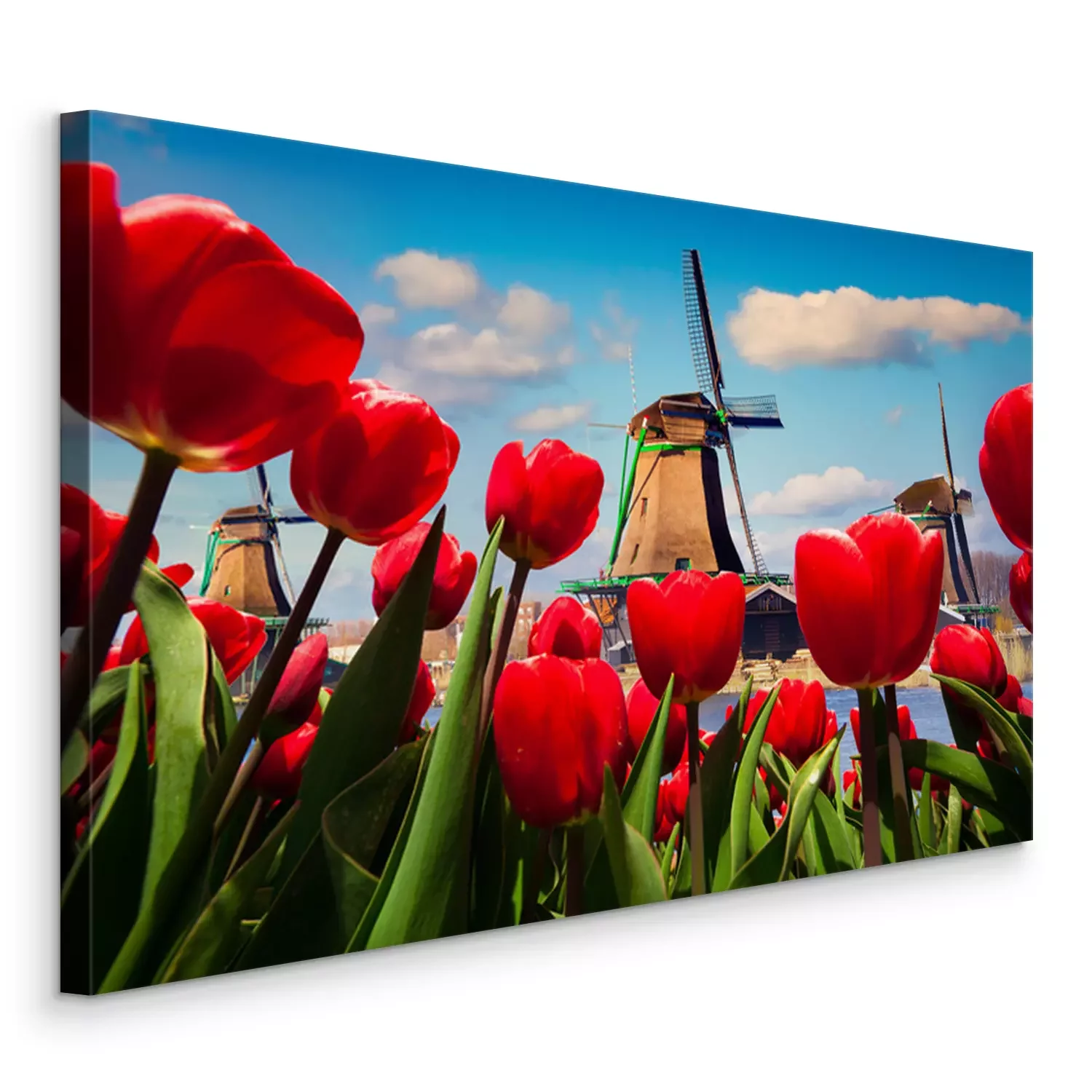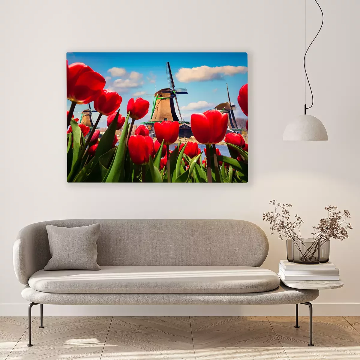 Canvas: Rode tulpen op de achtergrond van de windmolen