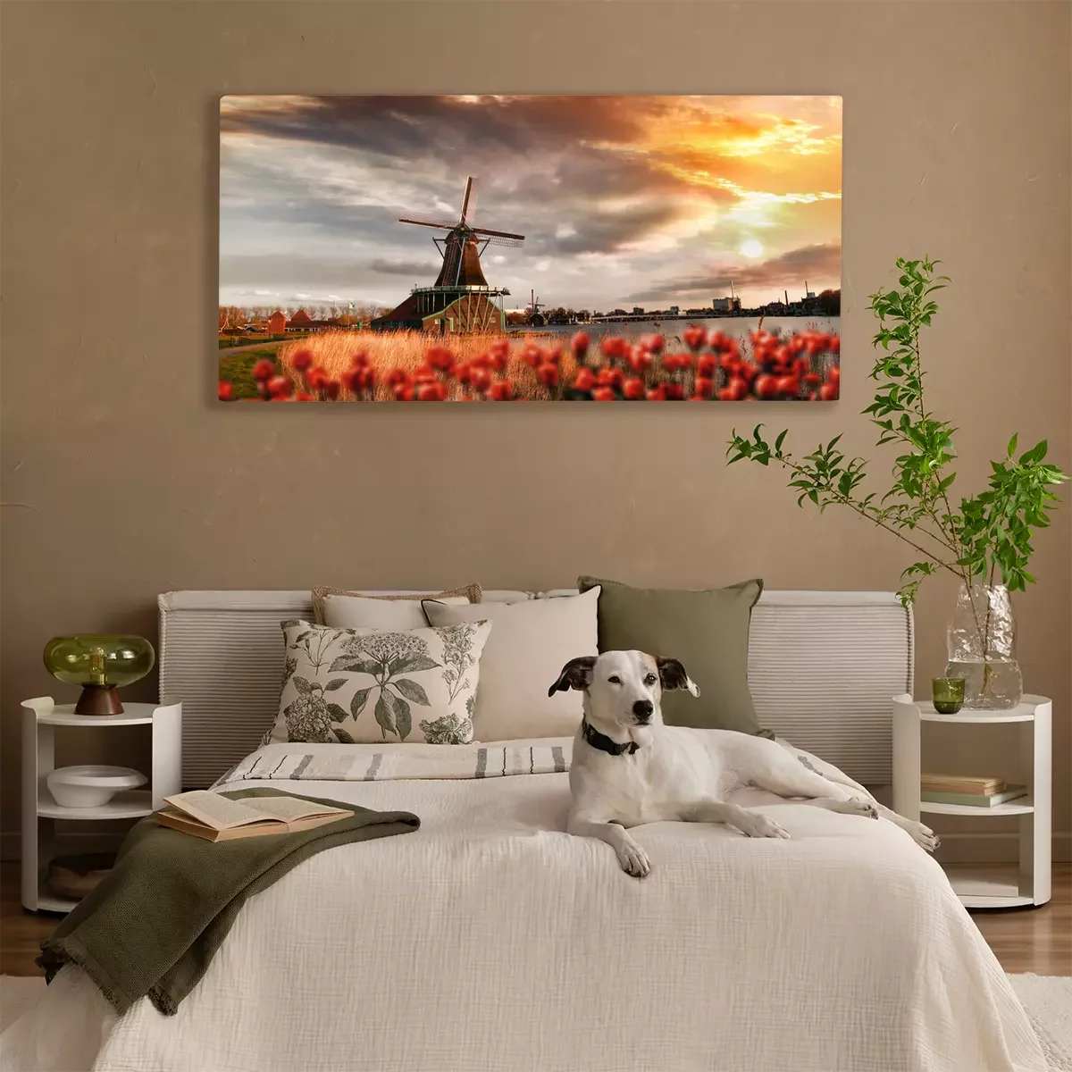 Canvas: Rode tulpen op de achtergrond van een windmolen
