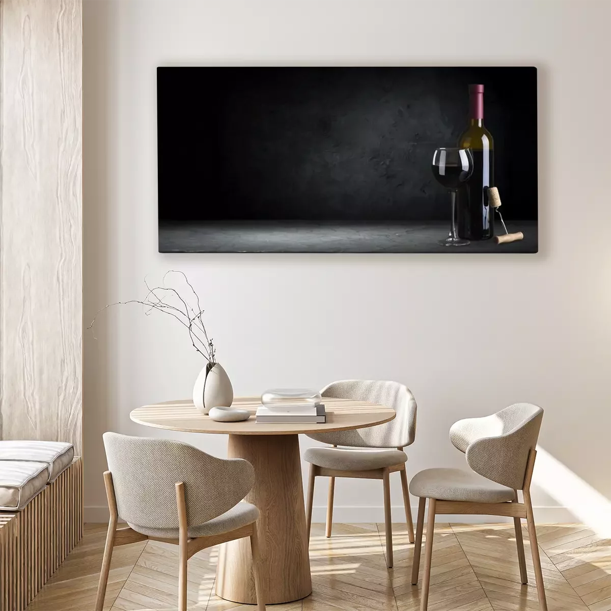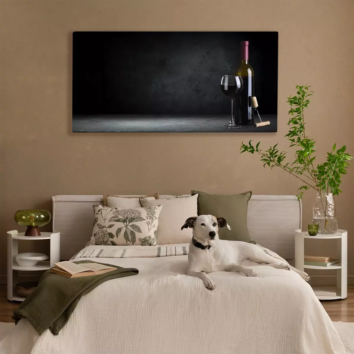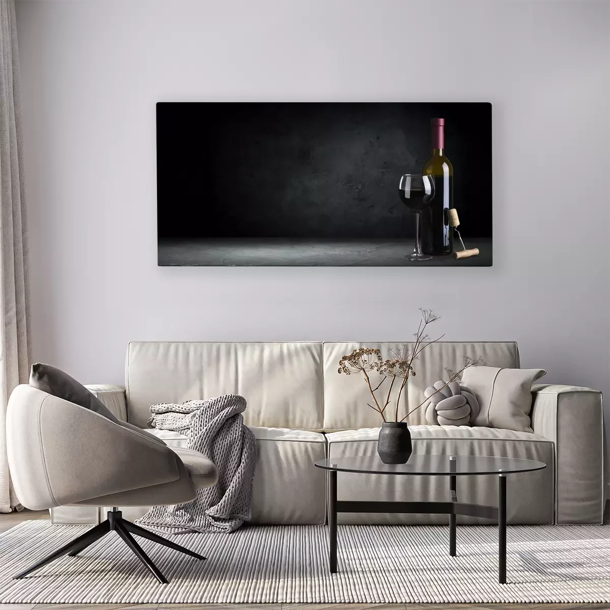 Canvas: Rode wijnglazen en fles op steenachtergrond. Bovenaanzicht met kopie ruimte