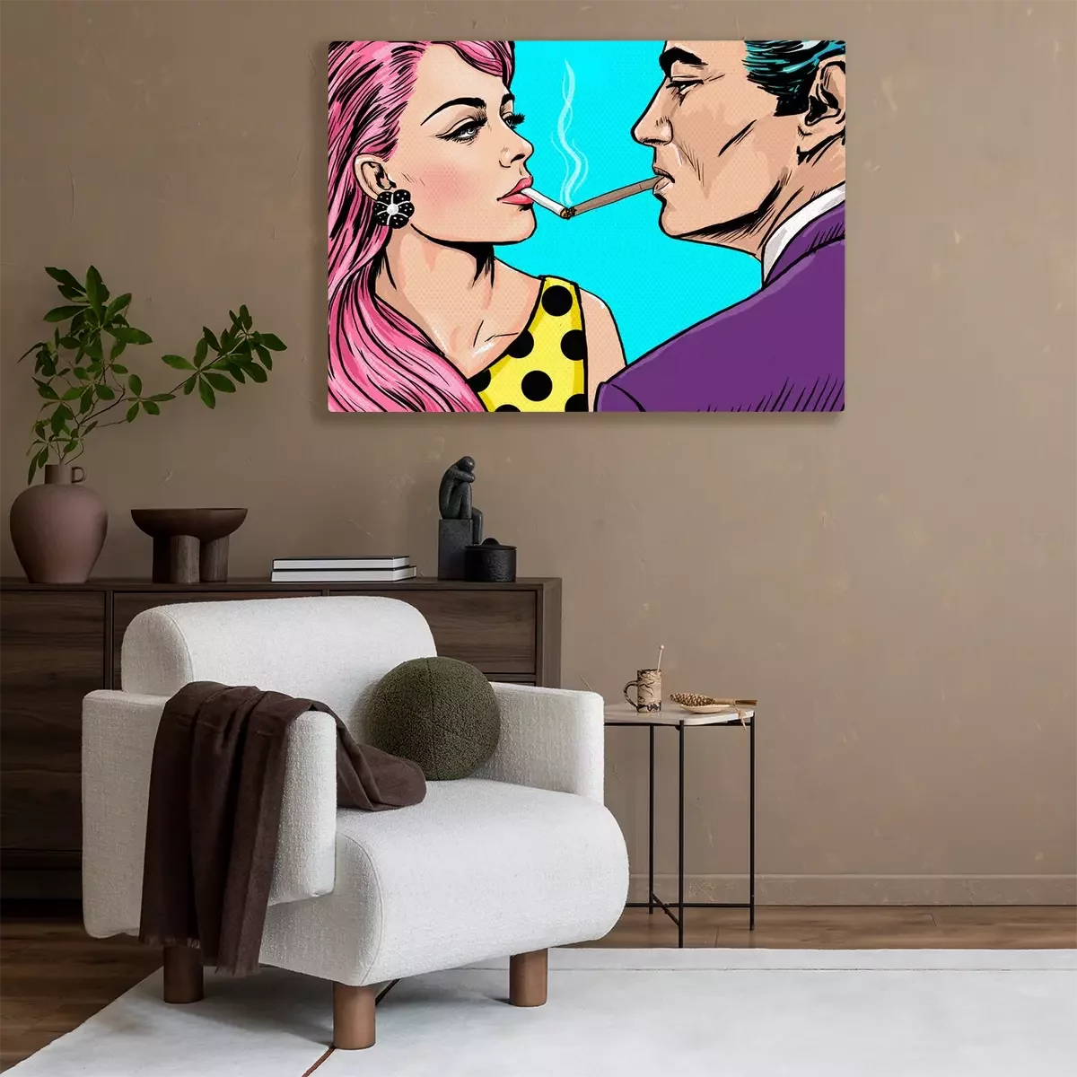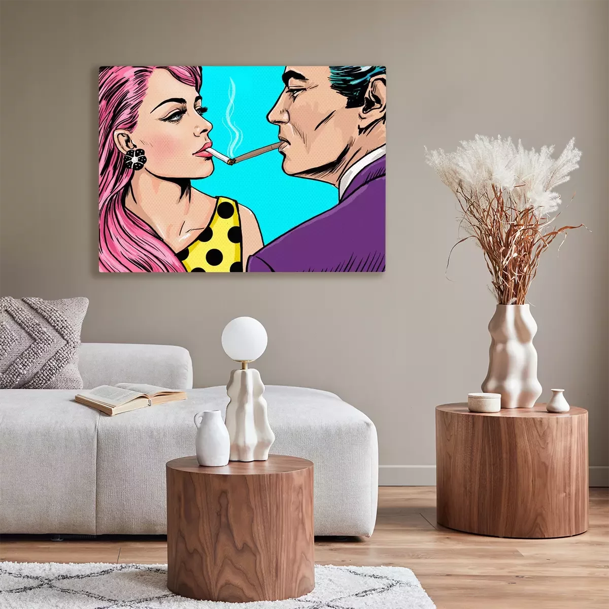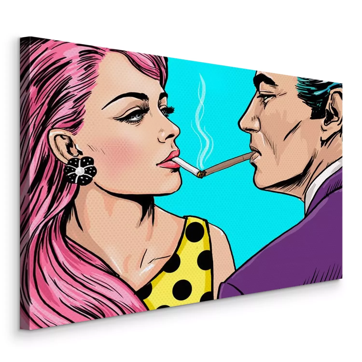 Canvas: Roken paar in Pop Art style.Love couple.Pop Art Couple.Pop Art love.Valentines dag postcard.Hollywood film scene.Real love.Movie poster.Comic boek love.Party mensen op zoek in elkaars ogen