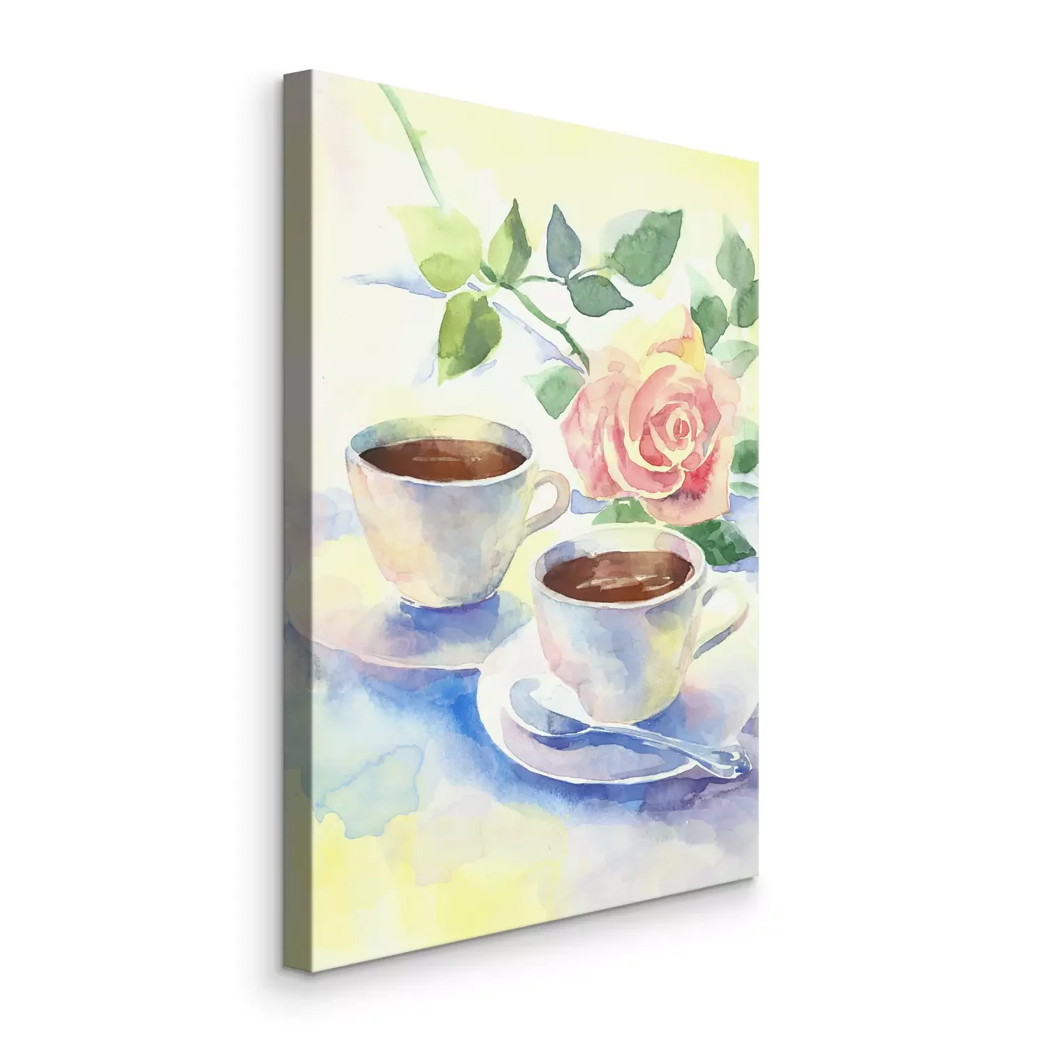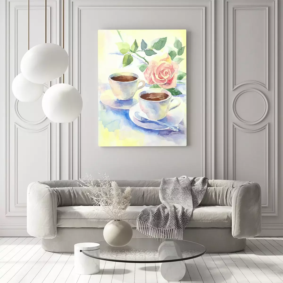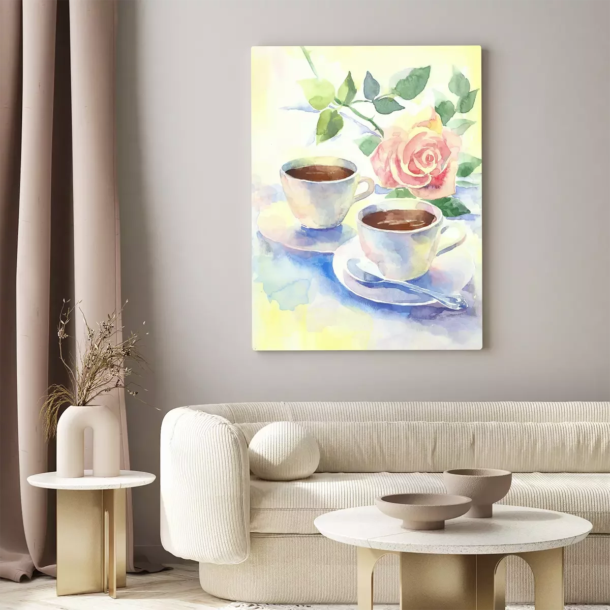Canvas: Romantisch ontbijt met koffie en een roze roos handgeschilderde aquarel Illustratie