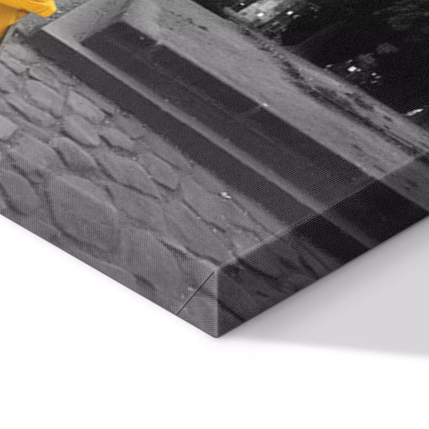 De print wordt aangebracht op hoogwaardig canvas dat op een schildersweefgetouw (spieraam) wordt gespannen. Omdat de print de zijranden bedekt, hoeft het ontwerp niet met een extra kader te worden omlijst. Wij raden ook composities aan die uit meerdere foto's bestaan en zo een coherente compositie vormen.