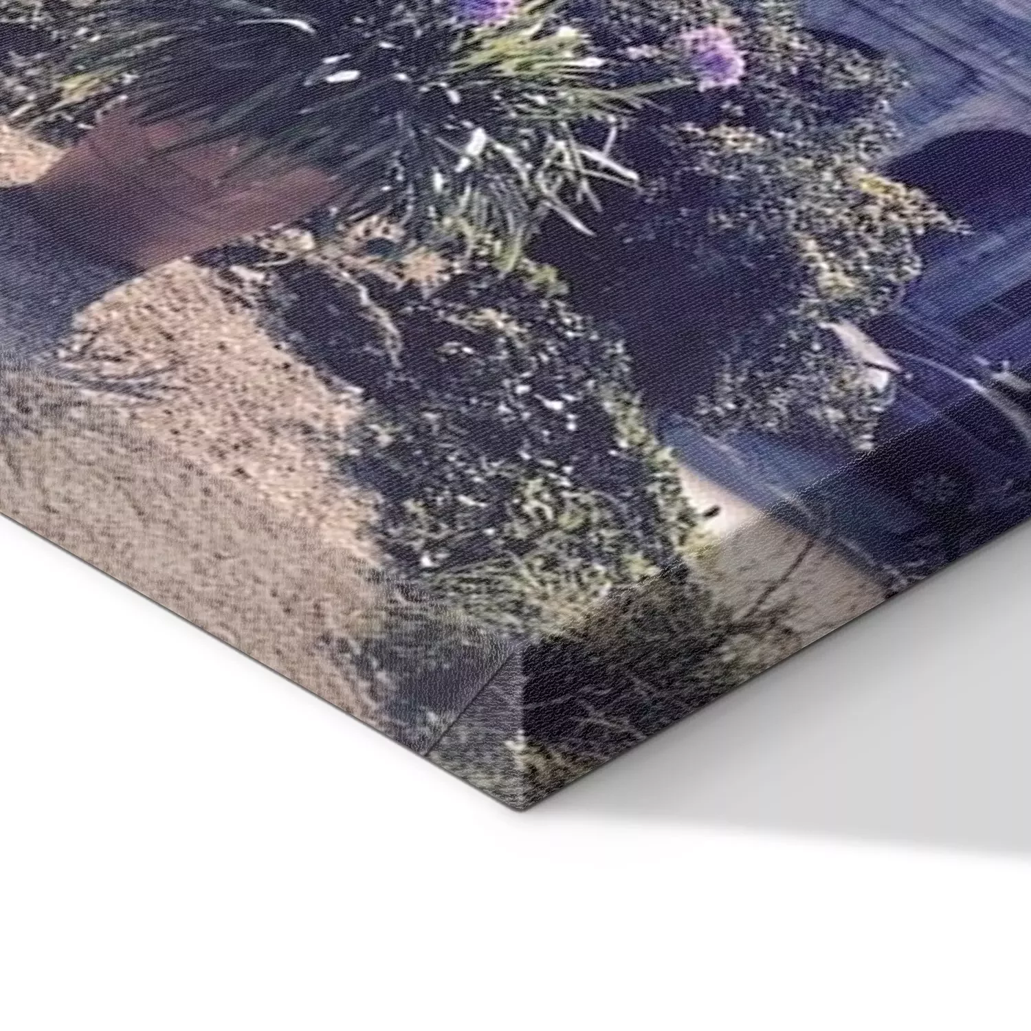 De print wordt aangebracht op hoogwaardig canvas dat op een schildersweefgetouw (spieraam) wordt gespannen. Omdat de print de zijranden bedekt, hoeft het ontwerp niet met een extra kader te worden omlijst. Wij raden ook composities aan die uit meerdere foto's bestaan en zo een coherente compositie vormen.