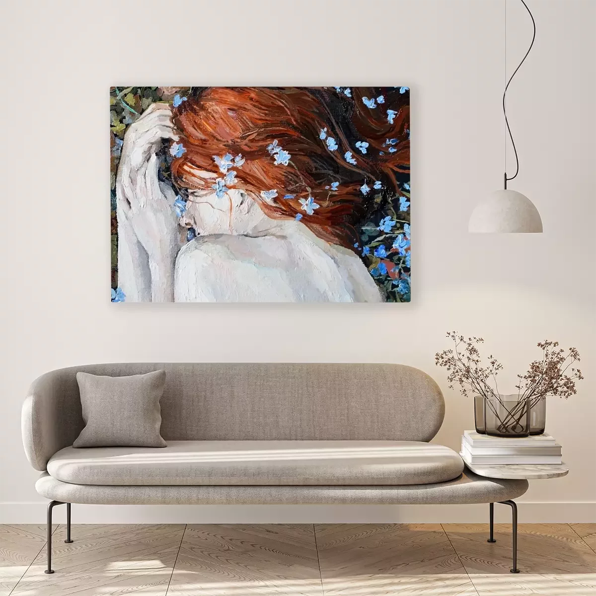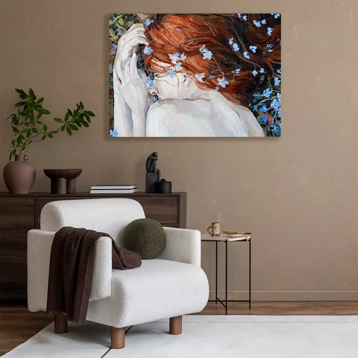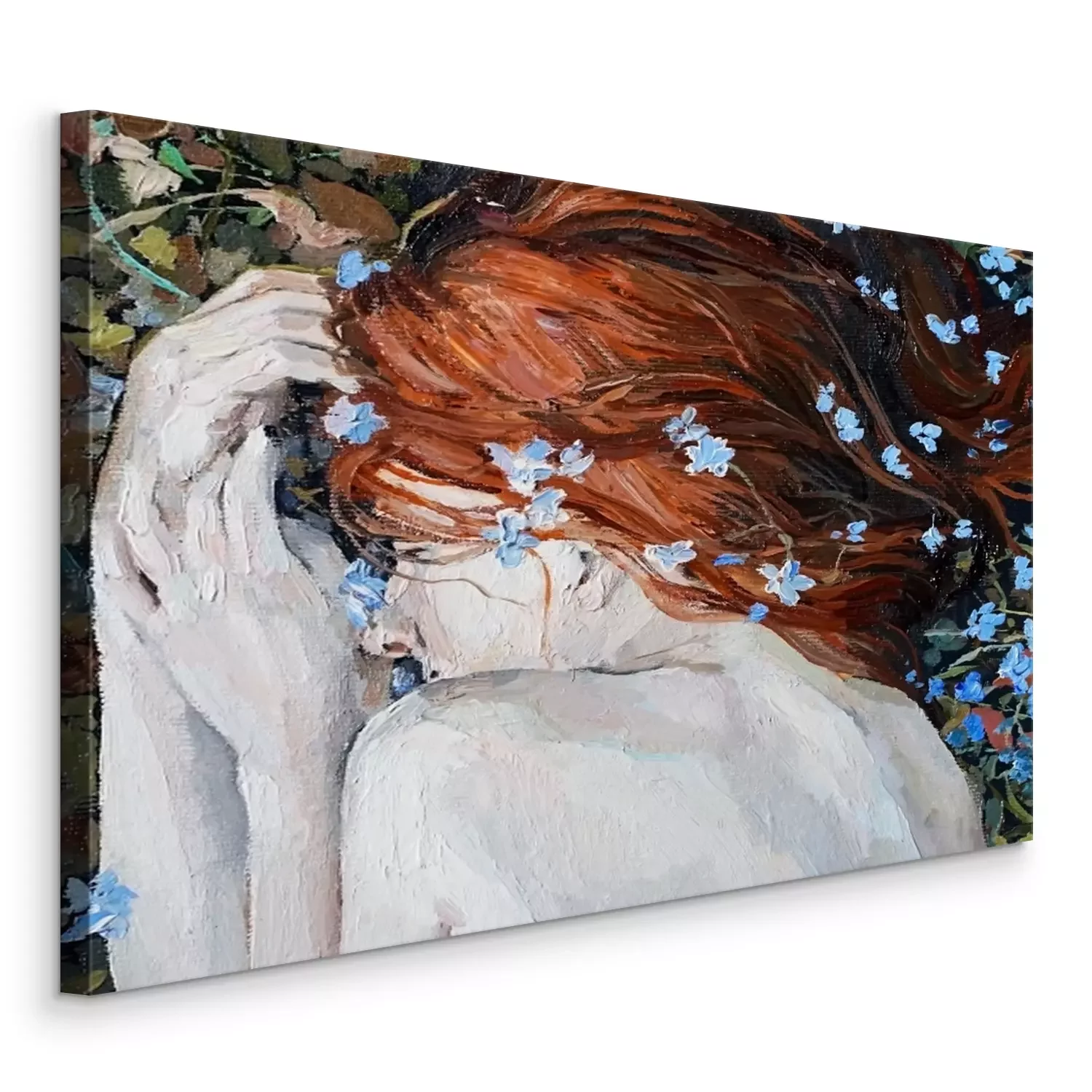 Canvas Roodharige vrouw en vergeet-mij-nietjes