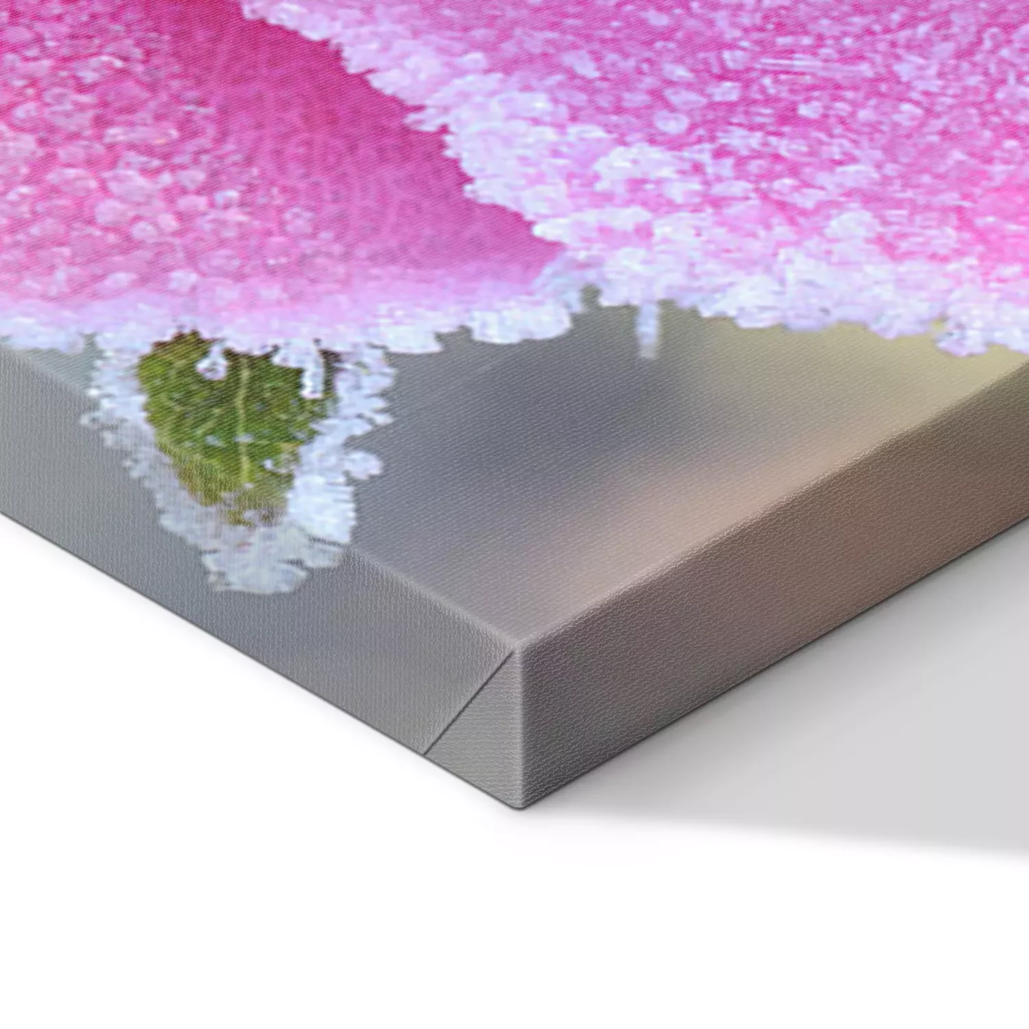 De print wordt aangebracht op hoogwaardig canvas dat op een schildersweefgetouw (spieraam) wordt gespannen. Omdat de print de zijranden bedekt, hoeft het ontwerp niet met een extra kader te worden omlijst. Wij raden ook composities aan die uit meerdere foto's bestaan en zo een coherente compositie vormen.