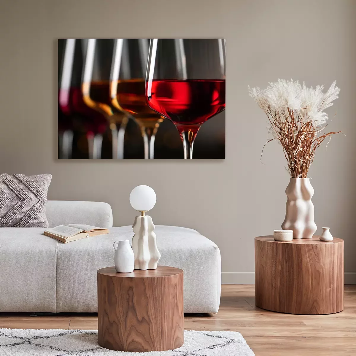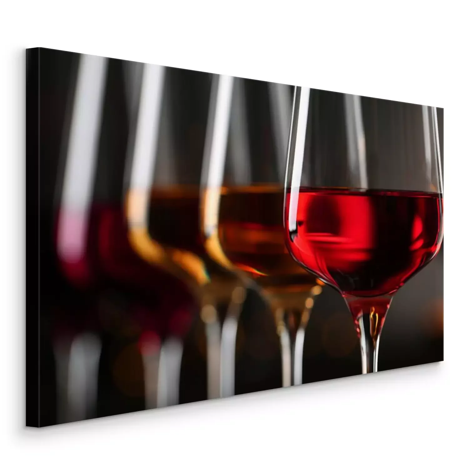 Canvas: Row of glasses with different wines on blurred background, closeup