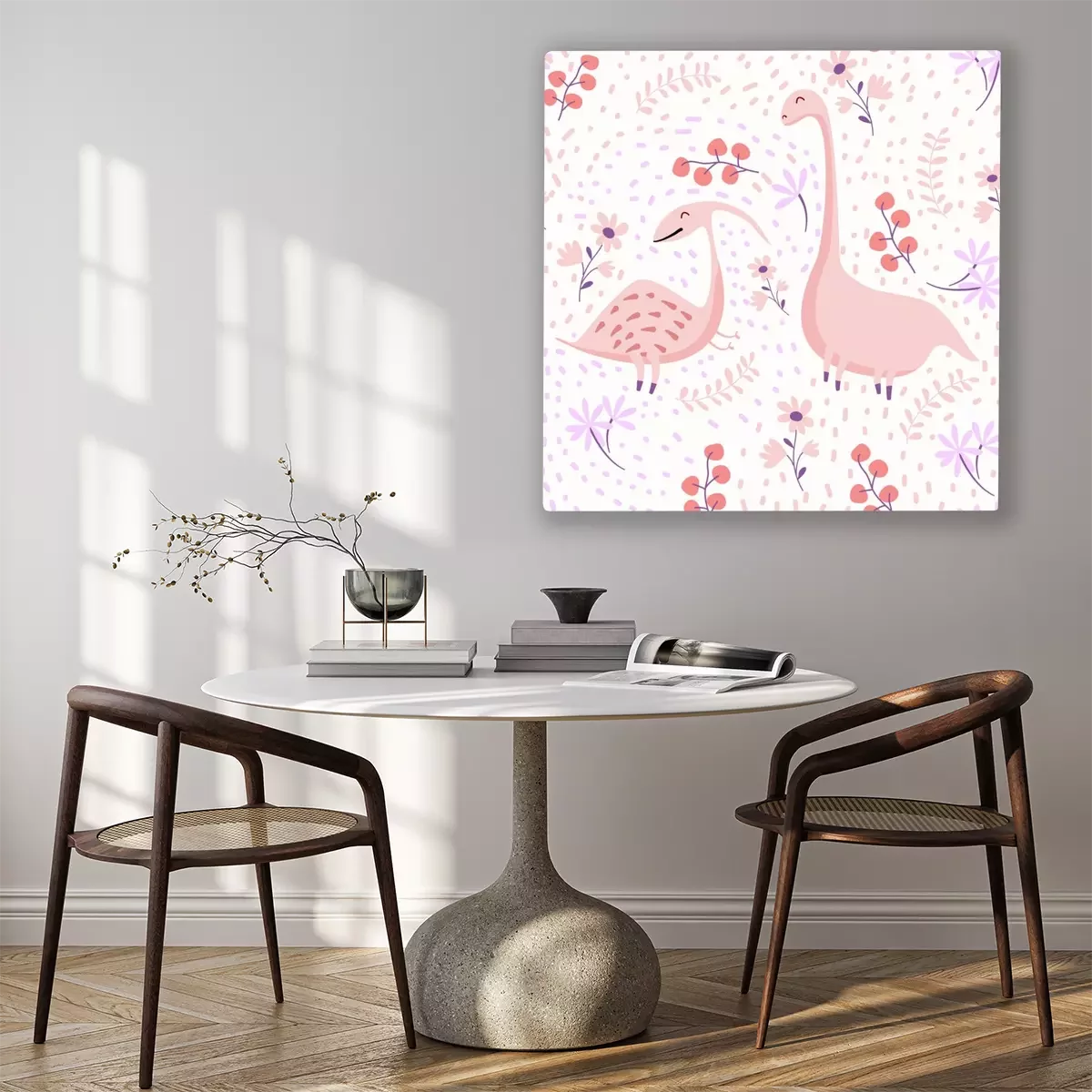 Canvas: Roze dinosaurussen op een florale achtergrond