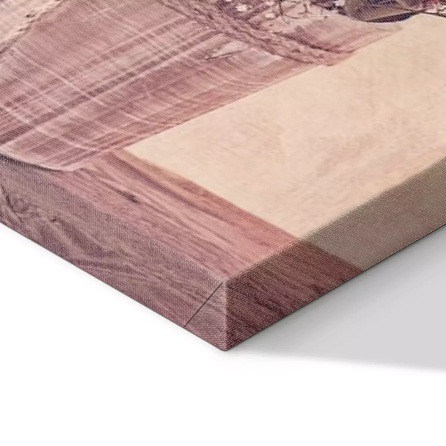 De print wordt aangebracht op hoogwaardig canvas dat op een schildersweefgetouw (spieraam) wordt gespannen. Omdat de print de zijranden bedekt, hoeft het ontwerp niet met een extra kader te worden omlijst. Wij raden ook composities aan die uit meerdere foto's bestaan en zo een coherente compositie vormen.