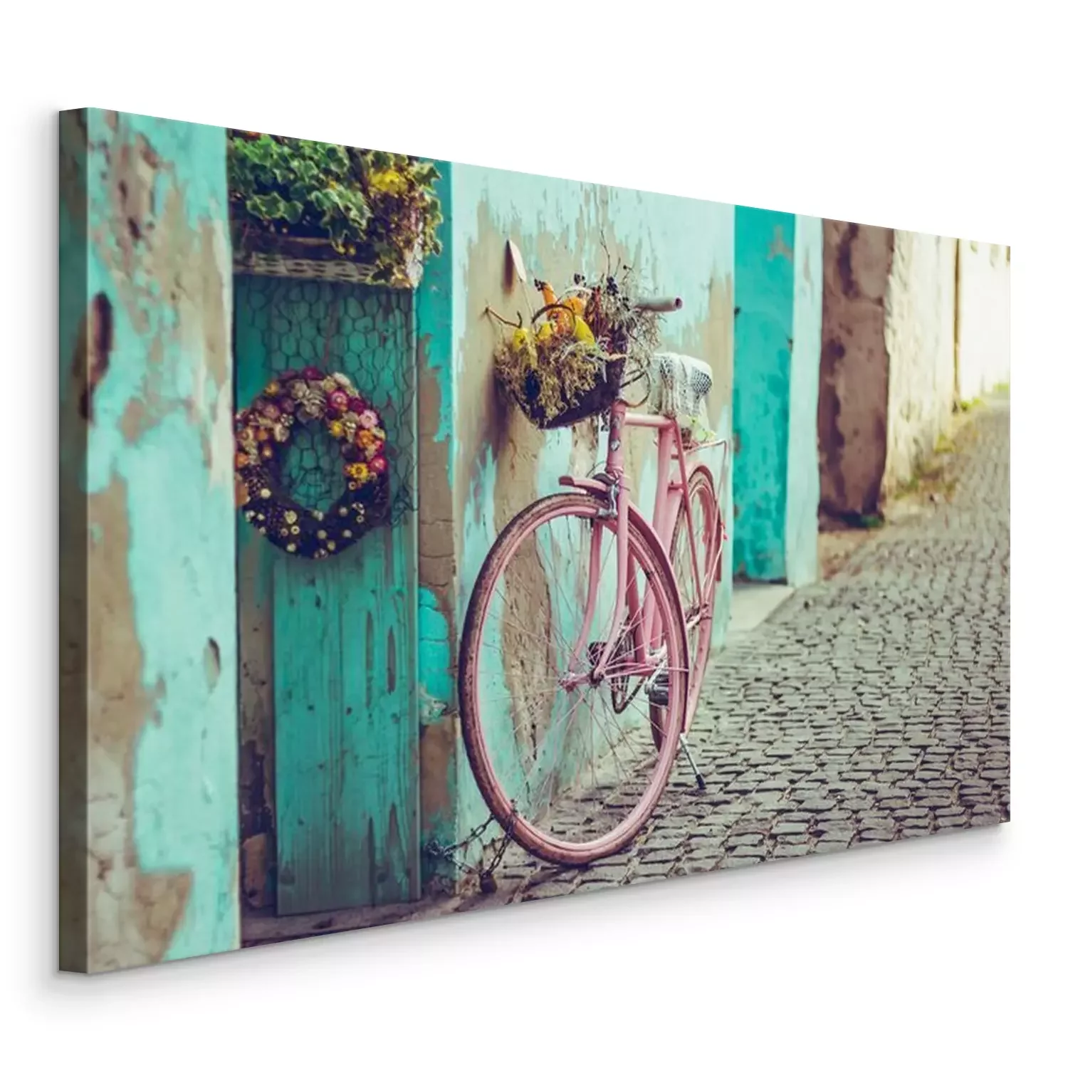 Canvas: Roze vintage fiets met mand vol bloemen naast een oud cyaan gebouw in Spanje